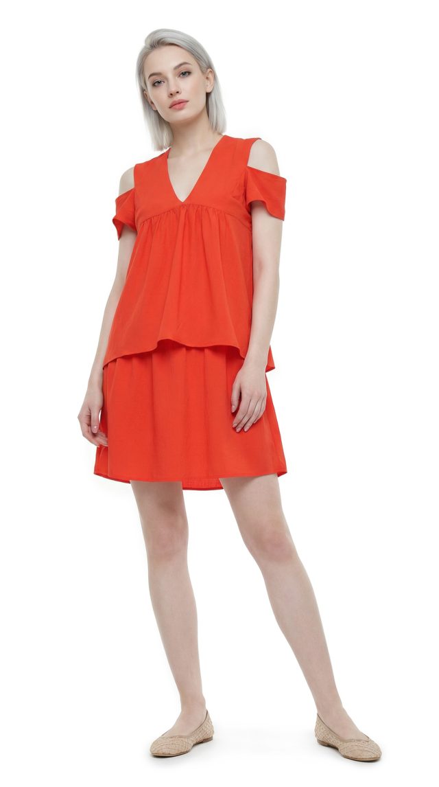 Новое платье легендарного французского бренда Cop Copine яркого рыжего цвета. Женственный фасон с секси V-вырезом, открытыми плечами, высокой талией и многослойной юбочкой. В составе: 100% п.э, без подклада: ткань средней плотности, хорошо драпируется, по фактуре «легкая жатка». Состояние — новое, с оригинальной запломбированной биркой Cop Copine.