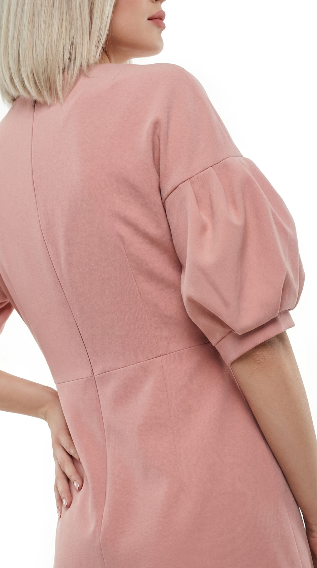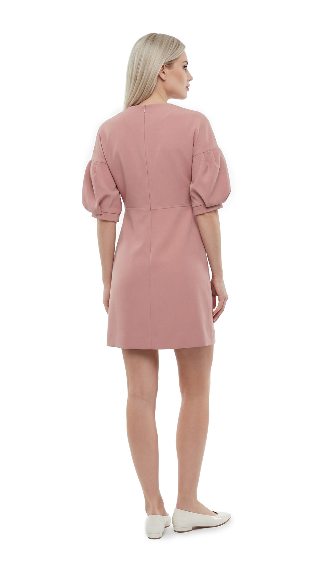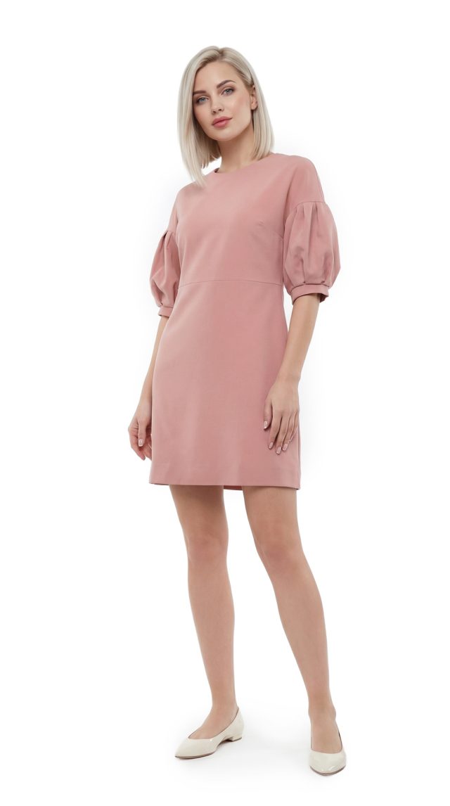Новое элегантное платье легендарного французского бренда Cop Copine модного пудрового цвета с коротким рукавом «фонарик». Полу-прилегающий фасон со слегка расклешенной от талии юбочкой. Застежка на молнию по спинке. В составе: 90% п.э, 10% эластан, без подклада. Ткань плотная, шелковистая, приятная к телу. Состояние — новое, с оригинальной запломбированной биркой Cop Copine.