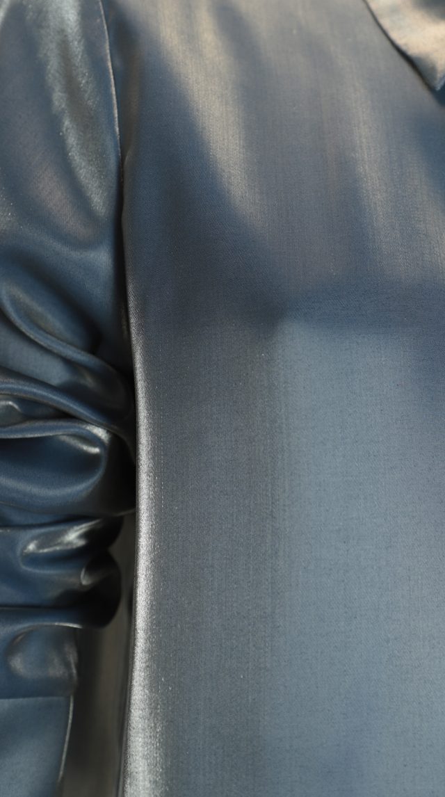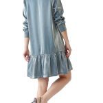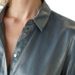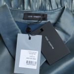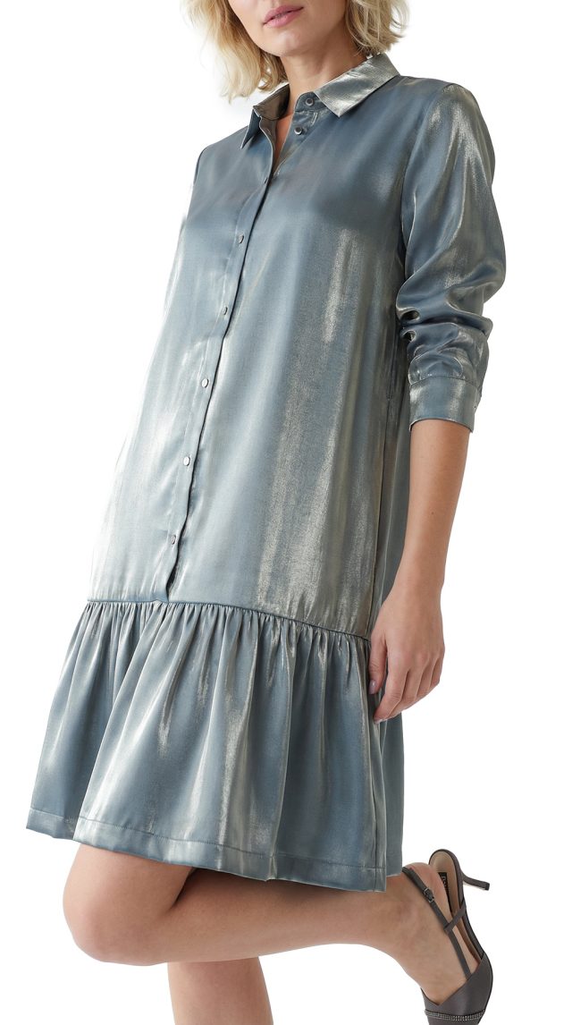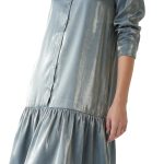 Новое платье легендарного французского бренда Cop Copine серо-зеленого цвета с бронзово-серебристым отливом — выглядит необычно и эффектно. Свободный прямой фасон с длинным рукавом и красивой драпировкой в отделке подола. Классический воротничок. Застежка на кнопки. В составе: 78% вискоза, 22% полиамид: ткань плотная, мягкая, шелковистая. Состояние — новое, с оригинальной запломбированной биркой Cop Copine.