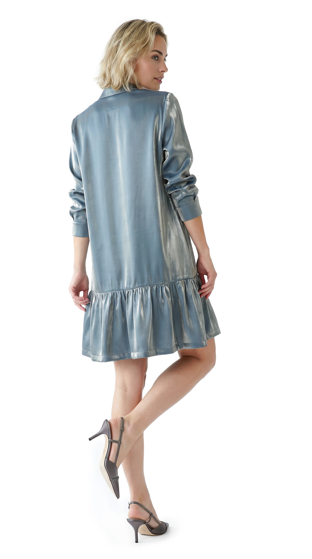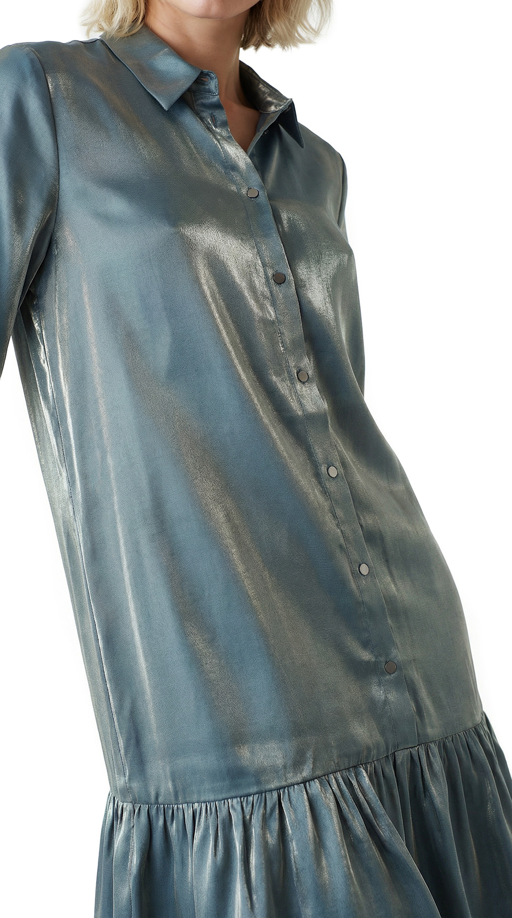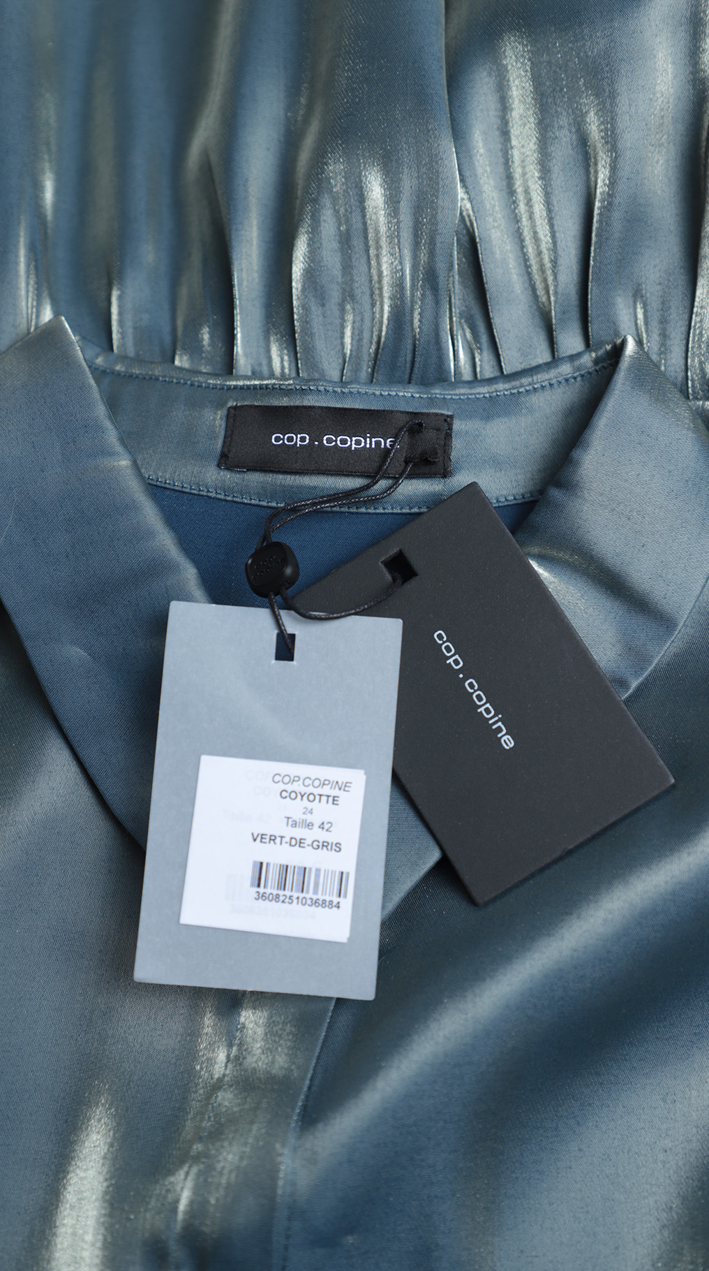 Новое платье легендарного французского бренда Cop Copine серо-зеленого цвета с бронзово-серебристым отливом — выглядит необычно и эффектно. Свободный прямой фасон с длинным рукавом и красивой драпировкой в отделке подола. Классический воротничок. Застежка на кнопки. В составе: 78% вискоза, 22% полиамид: ткань плотная, мягкая, шелковистая. Состояние — новое, с оригинальной запломбированной биркой Cop Copine.