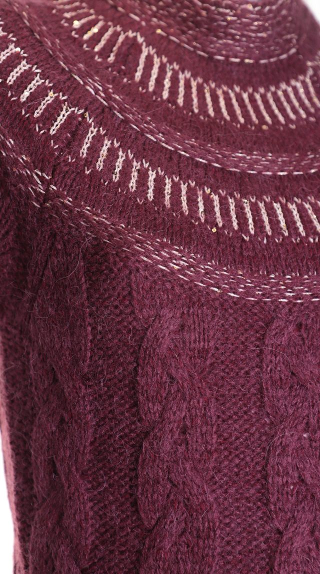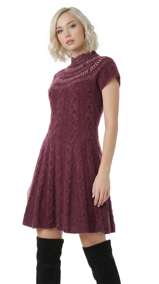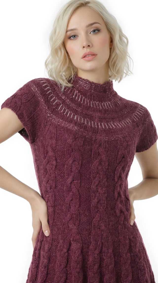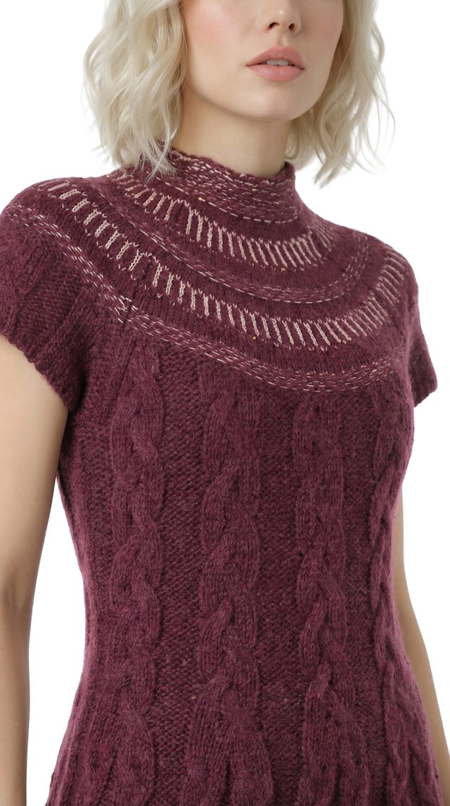 Новое вязаное шерстяное платье американского дизайнерского бренда Free People вишневого цвета женственного фасона с приталенным топом и юбочкой полу-солнце. Красивая вязка косами. Отделка горловины серебристыми нитями и золотистыми пайетками. Воротничок стойка. Короткий рукав. Без застежки. В составе: 48% шерсть, 25% акрил, 2% альпака. Ткань мягкая, комфортная к телу, хорошо тянется. Состояние — новое, с фирменной биркой магазина Free People.