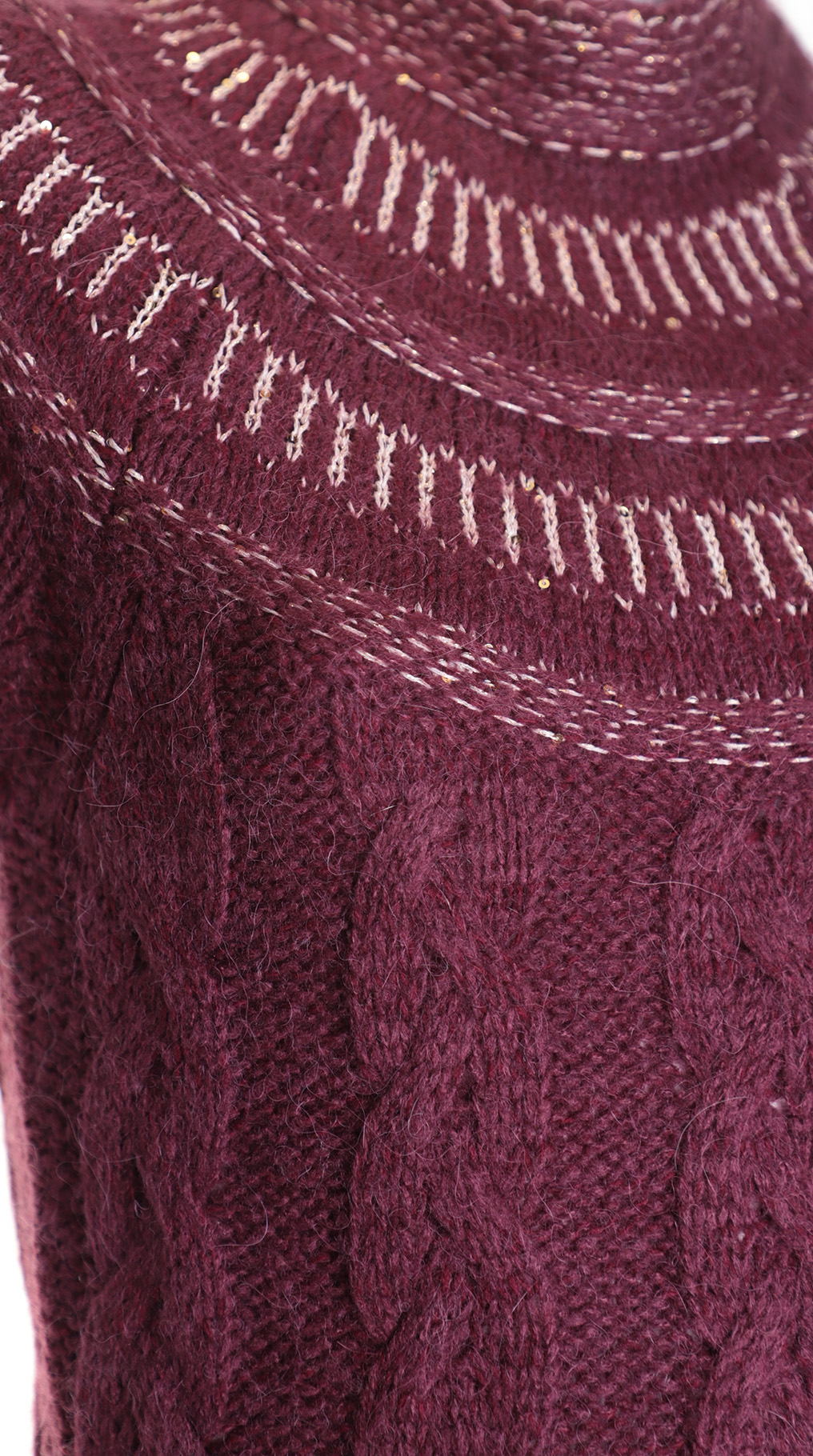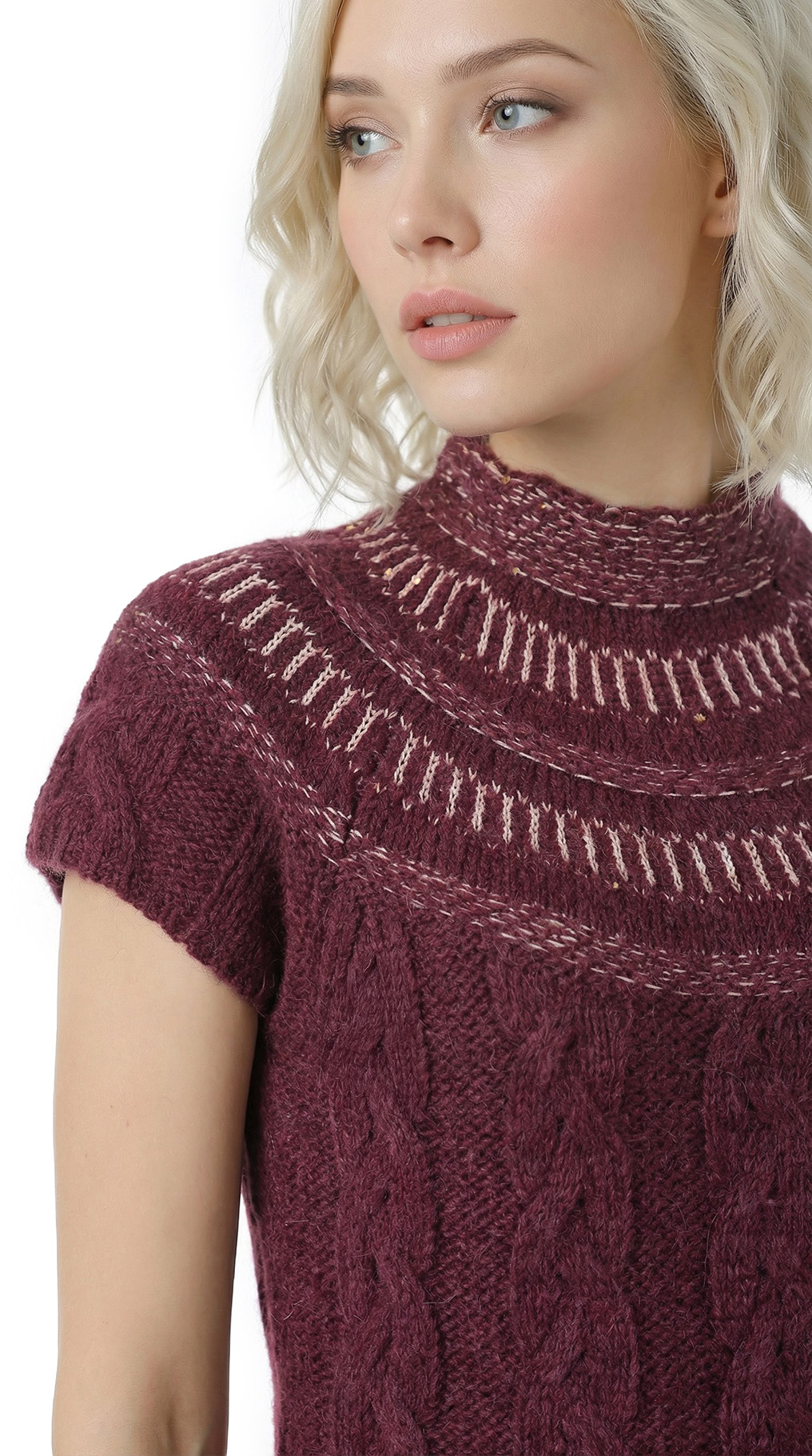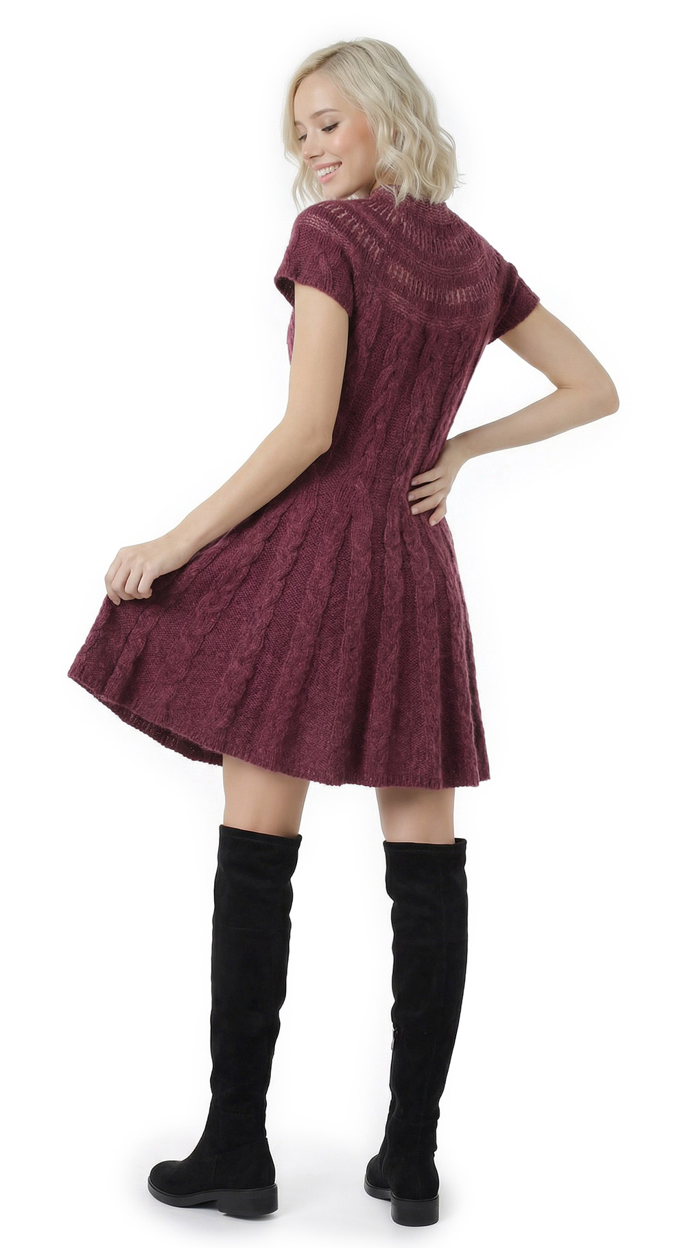 Новое вязаное шерстяное платье американского дизайнерского бренда Free People вишневого цвета женственного фасона с приталенным топом и юбочкой полу-солнце. Красивая вязка косами. Отделка горловины серебристыми нитями и золотистыми пайетками. Воротничок стойка. Короткий рукав. Без застежки. В составе: 48% шерсть, 25% акрил, 2% альпака. Ткань мягкая, комфортная к телу, хорошо тянется. Состояние — новое, с фирменной биркой магазина Free People.