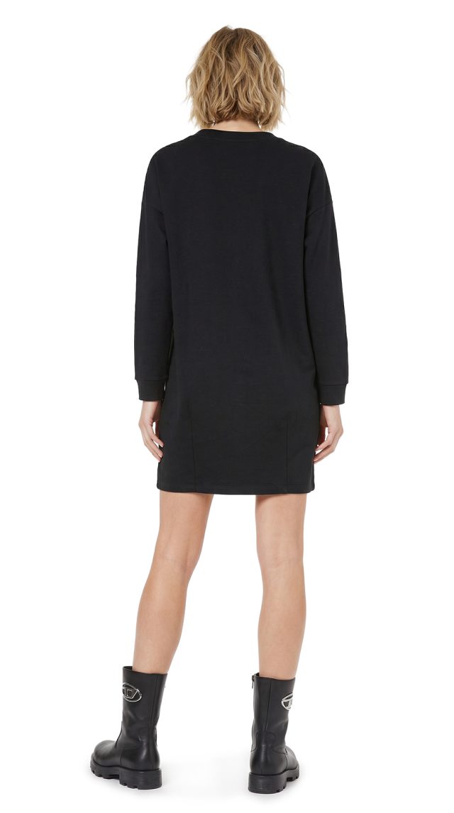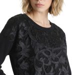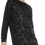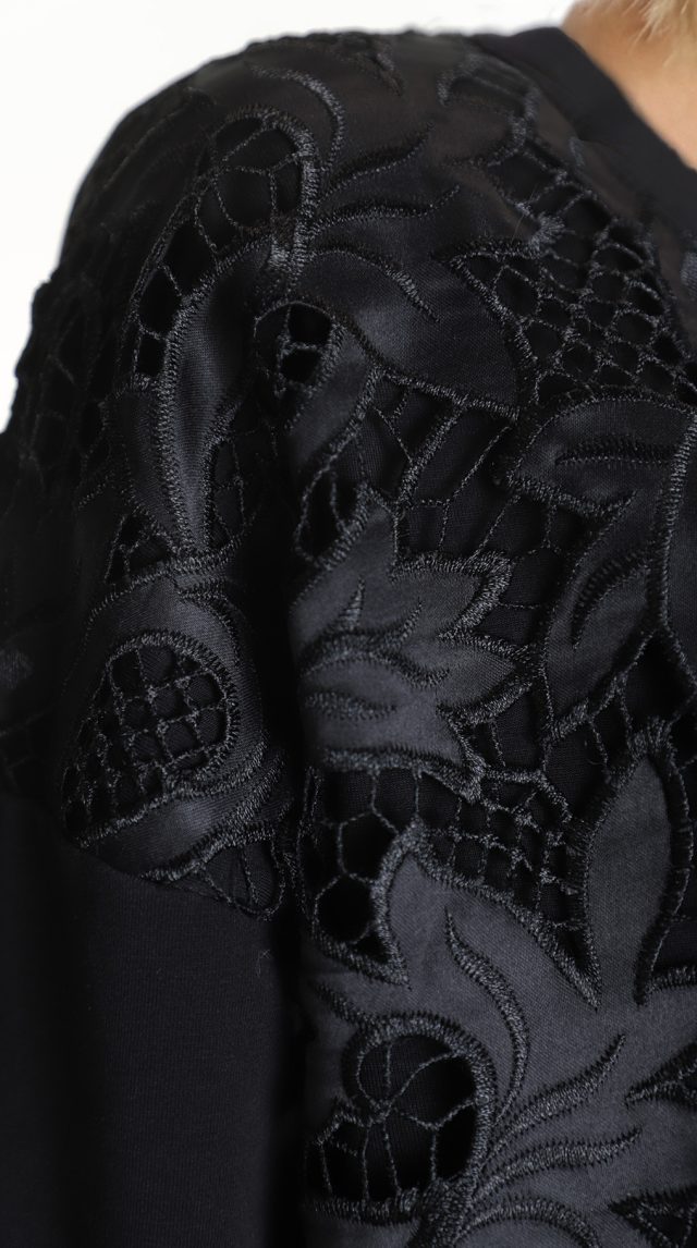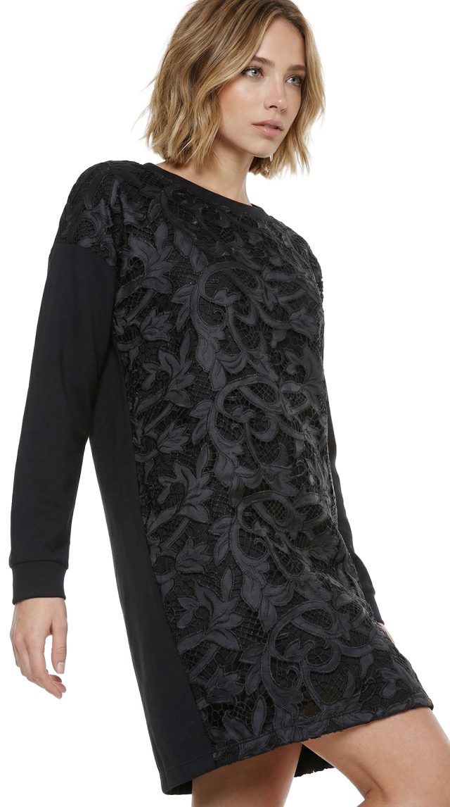Новое трикотажное платье Guess (Los Angeles) черного цвета с кружевной цветочной вставкой. Модный свободный фасон с длинным приспущенным рукавом. Без застежки. В составе: 95% хлопок, 5% спандекс, без подклада — ткань средней плотности, с хорошим стретчем. Состояние — новое, с фирменной биркой магазина Guess. Цена на бирке — 98$.