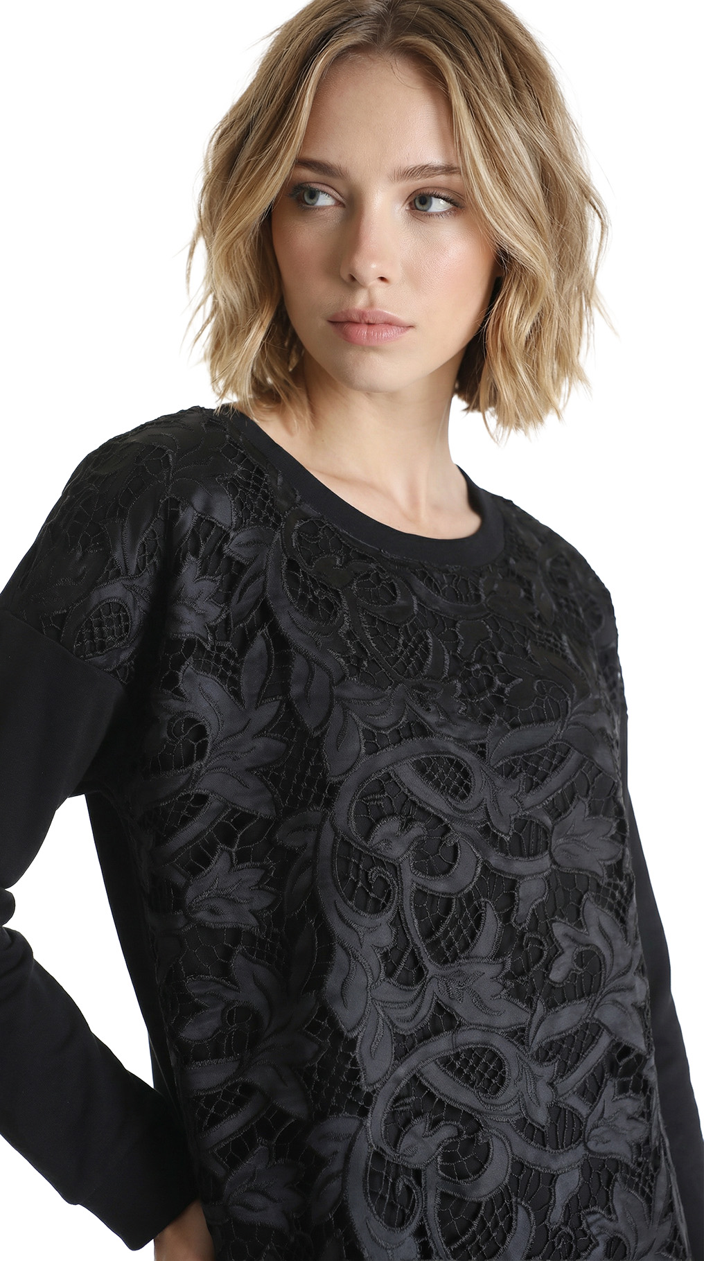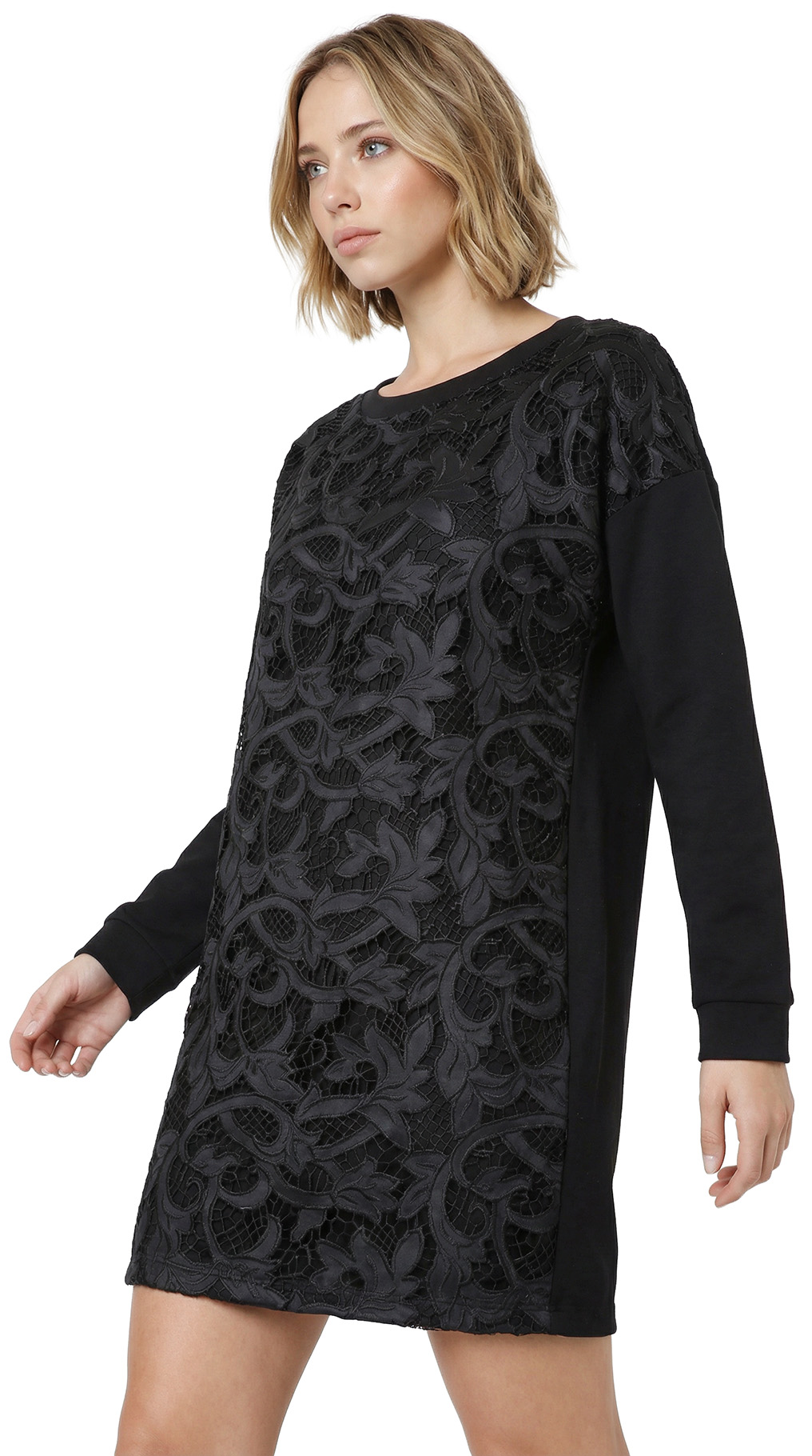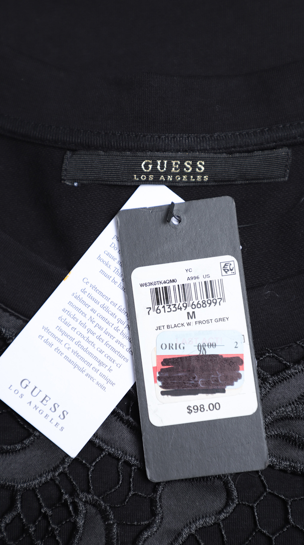 Новое трикотажное платье Guess (Los Angeles) черного цвета с кружевной цветочной вставкой. Модный свободный фасон с длинным приспущенным рукавом. Без застежки. В составе: 95% хлопок, 5% спандекс, без подклада — ткань средней плотности, с хорошим стретчем. Состояние — новое, с фирменной биркой магазина Guess. Цена на бирке — 98$.
