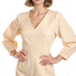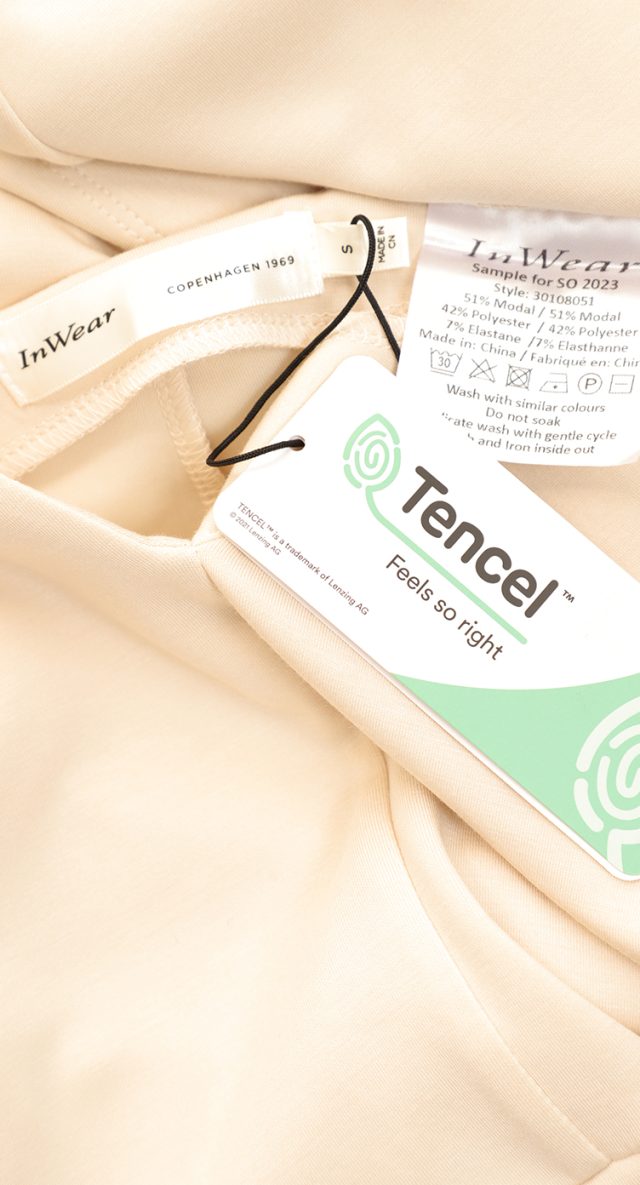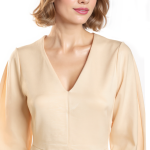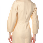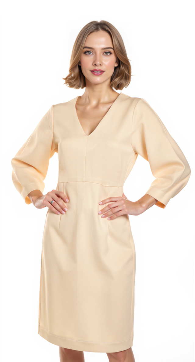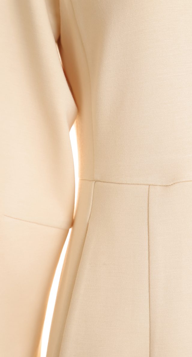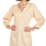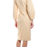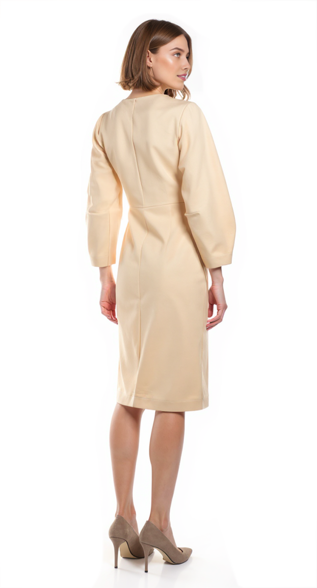 Новое трикотажное платье датского бренда InWear светло-бежевого цвета. Женственный приталенный фасон «футляр» с объемным рукавом 3/4 и V-вырезом горловины. Кармашки в боковых вытачках. В составе: 51% натуральный модал (тенсел), 42% п.э, 7% эластан, без подклада — ткань средней плотности, очень мягкая, эластичная, комфортная в носке. Состояние — новое, с фирменной биркой InWear.