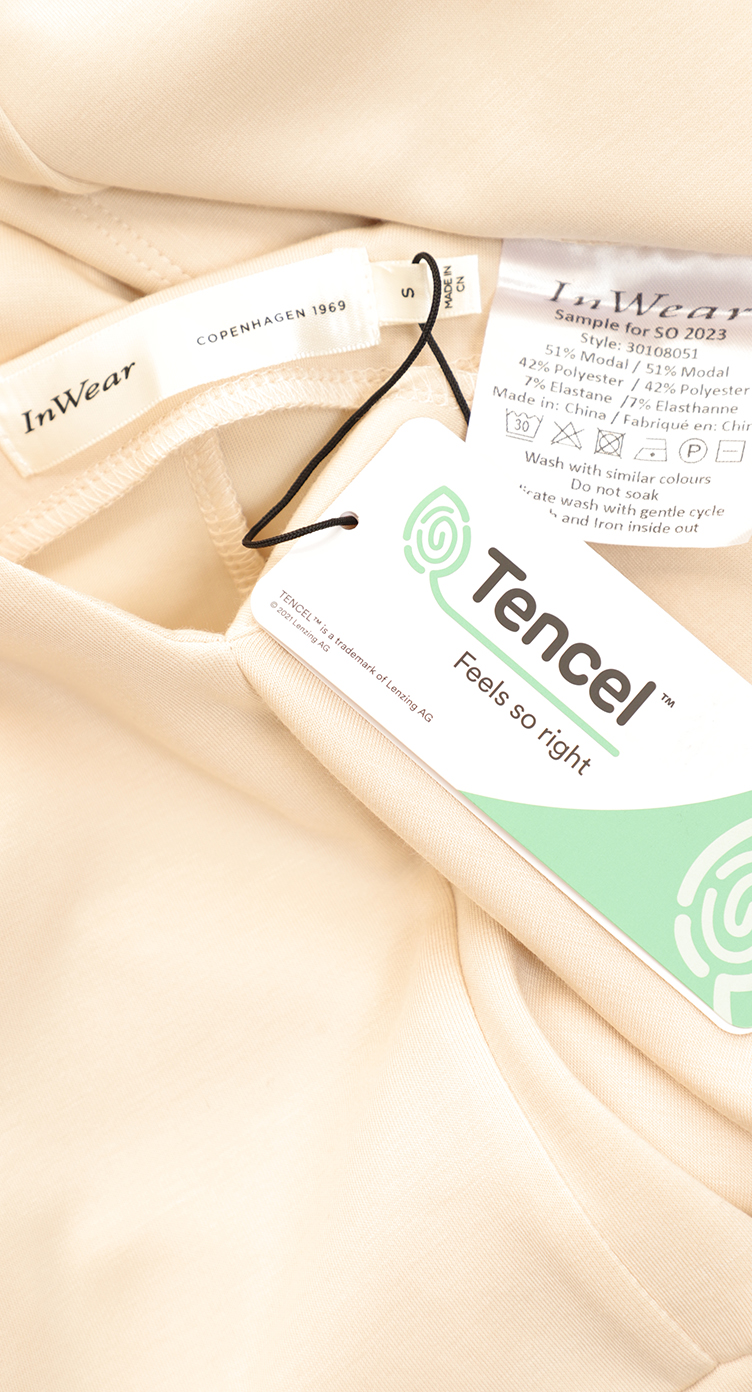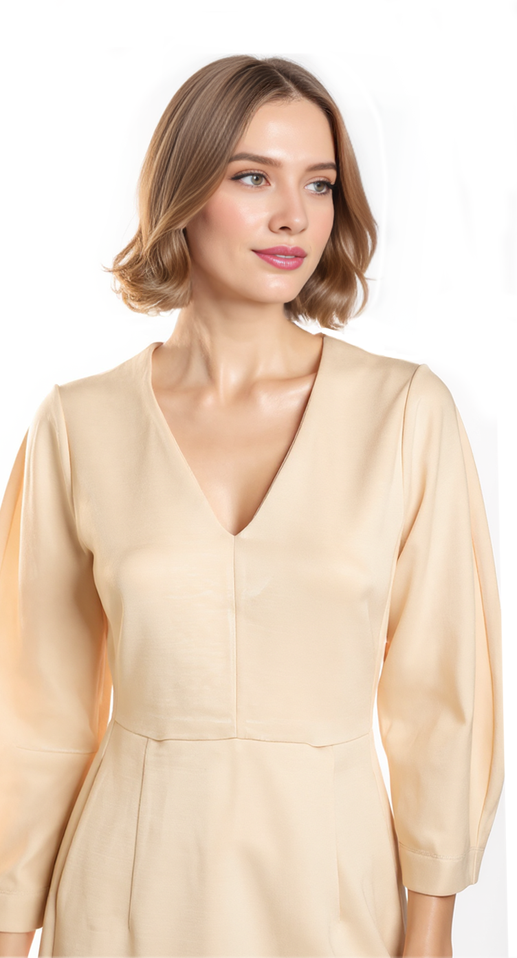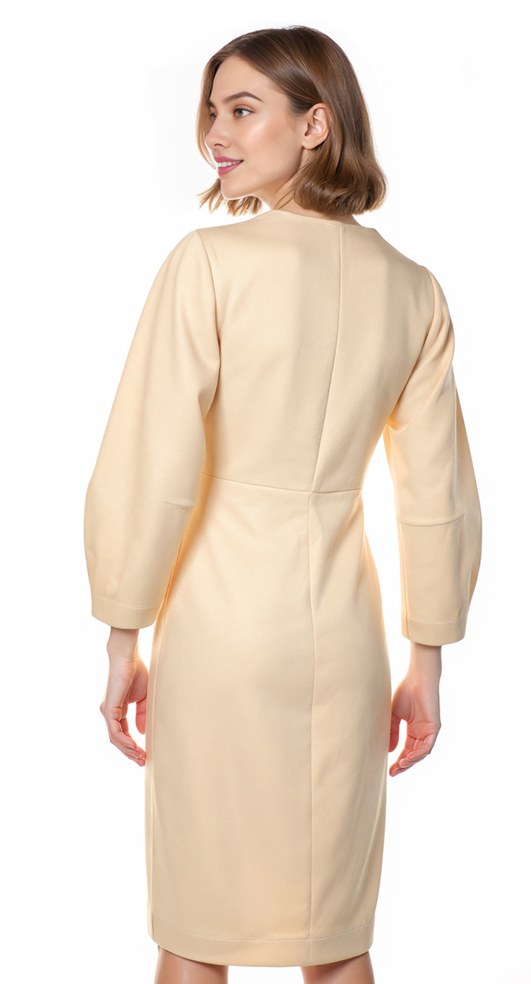 Новое трикотажное платье датского бренда InWear светло-бежевого цвета. Женственный приталенный фасон «футляр» с объемным рукавом 3/4 и V-вырезом горловины. Кармашки в боковых вытачках. В составе: 51% натуральный модал (тенсел), 42% п.э, 7% эластан, без подклада — ткань средней плотности, очень мягкая, эластичная, комфортная в носке. Состояние — новое, с фирменной биркой InWear.