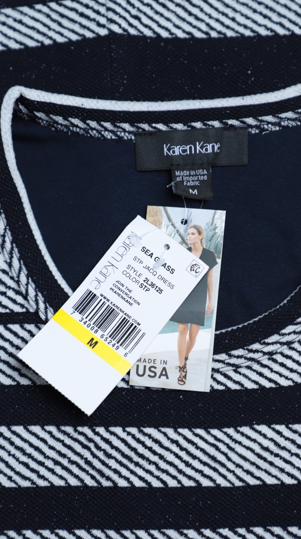 Новое трикотажное платье американского бренда Karen Kane в черно-белую продольную полоску. Приталенный фасон «безрукавка». Без застежки. В составе: 72% п.э, 26% вискоза, 2% спандекс: ткань плотная, хорошо тянется. Состояние — новое, с фирменной биркой магазина Karen Kane.
