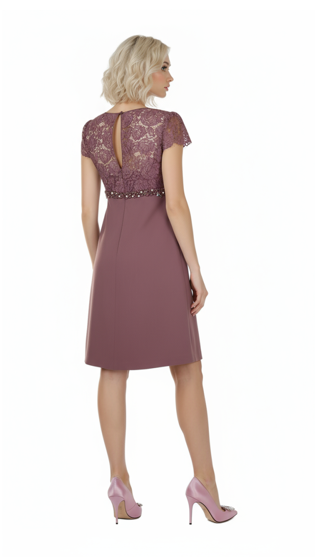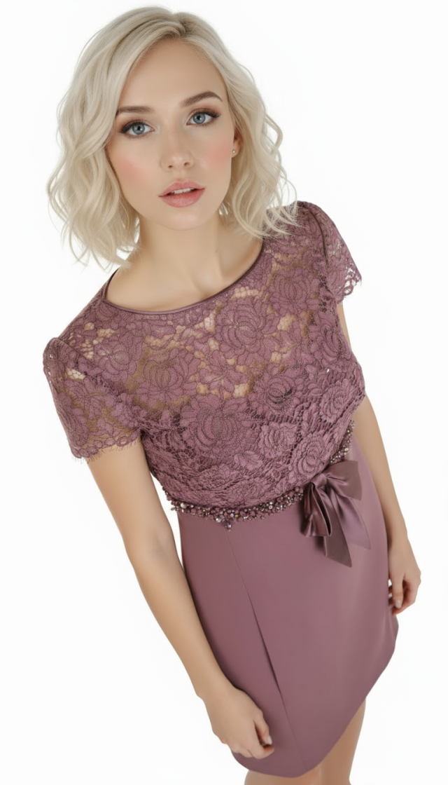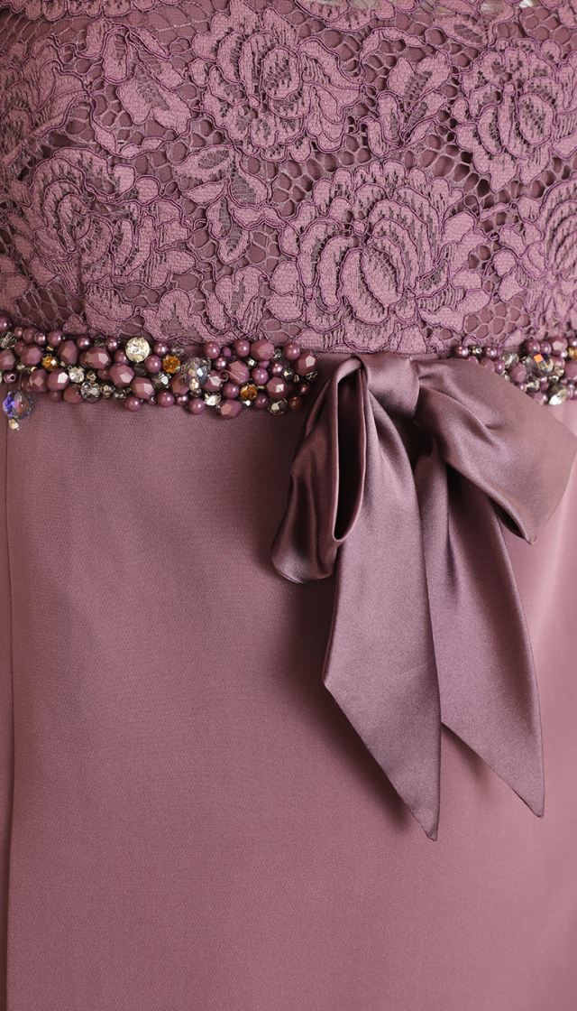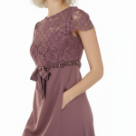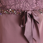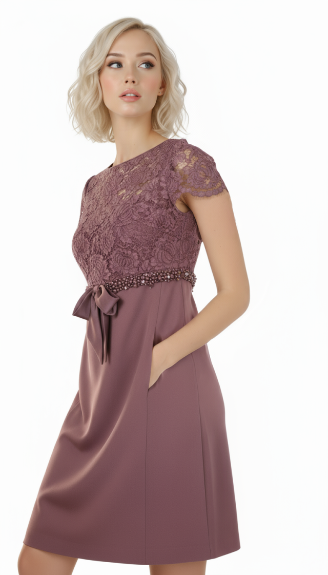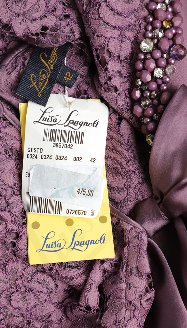 Новое дизайнерское платье итальянского бренда Luisa Spagnoli цвета мальвы (розовато-лиловый) с кружевной вставкой изысканного цветочного узора, и акцентной талией, декорированной атласным бантом и бусинами и стеклярусом. Прямой крой, слегка расклешенный от бедра, с коротким рукавом и врезными фронтальными кармашками. Вырез капелька по спинке с застежкой на воздушную пуговку и молнию. В составе: 100% шелк, на подкладе из натурального ацетата — ткань экстра качества: плотностая, мягкая. Состояние — новое, с оригинальной биркой Luisa Spagnoli. Цена на бирке — 475 евро.