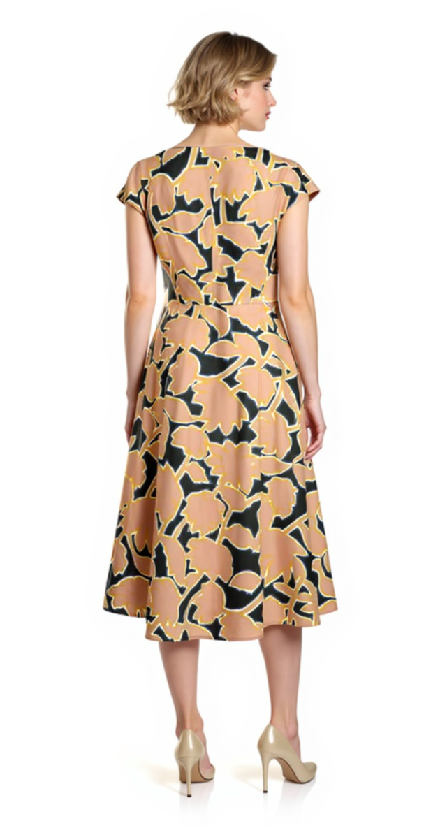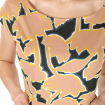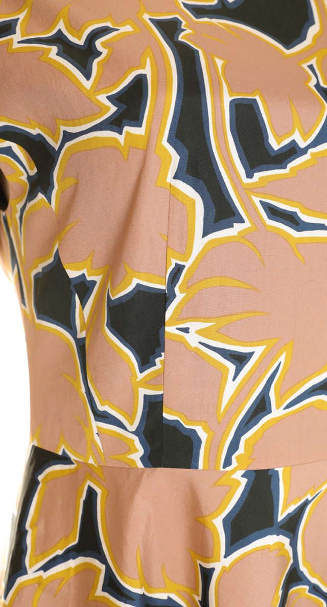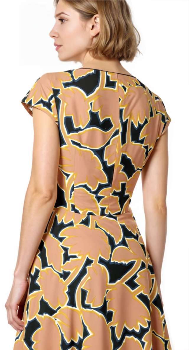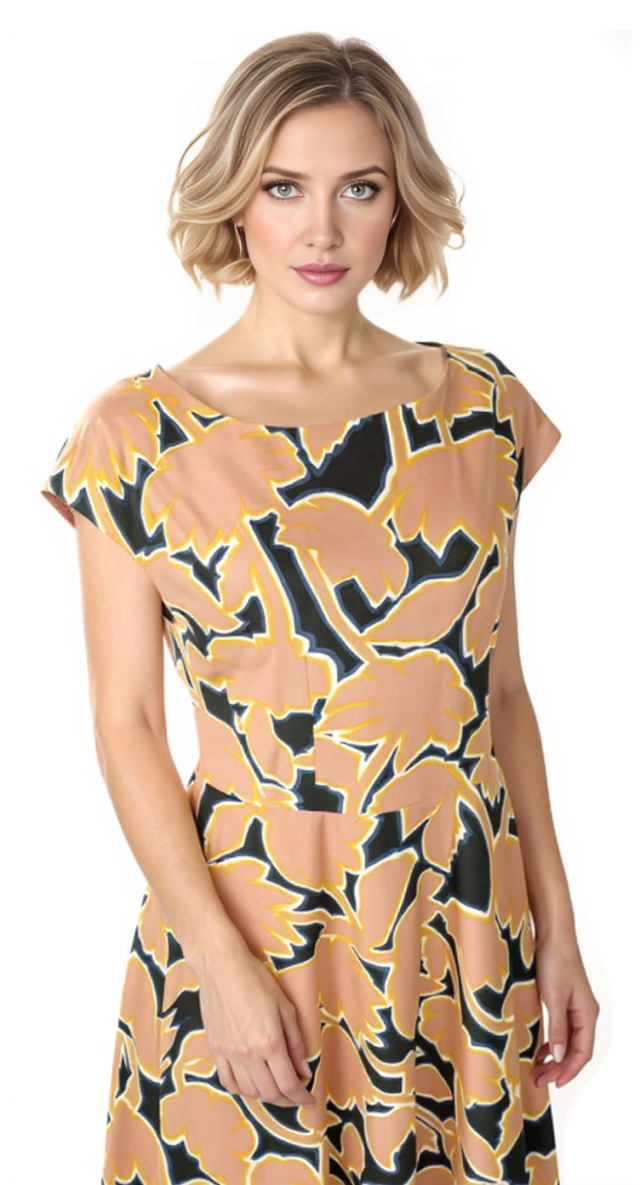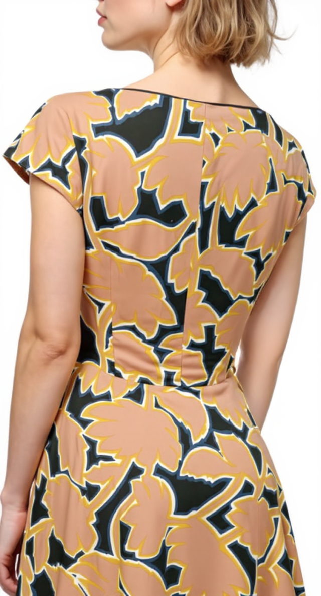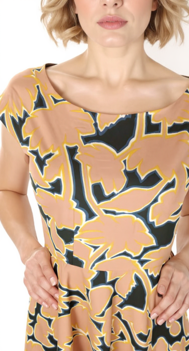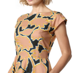Новое платье концерна Max Mara с крупным абстрактным лиственным принтом на черном фоне. Женственный свободный летящий силуэт с широким вырезом горловины «лодочка» и коротким приспущенным рукавом. Кармашки по бокам. Застежка сбоку на молнию. В составе: 100% хлопок, без подкалада — ткань экстра качества: лёгкая, с мягкой драпировкой. Состояние — новое, из аутлета концерна Max Mara (ярлык бренда надрезан — это политика аутлета).