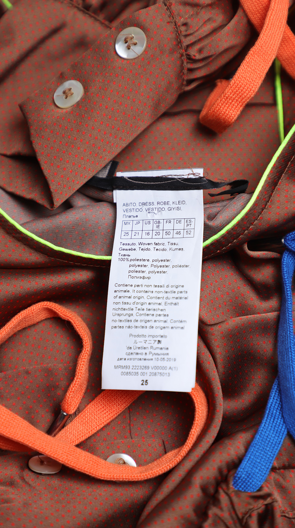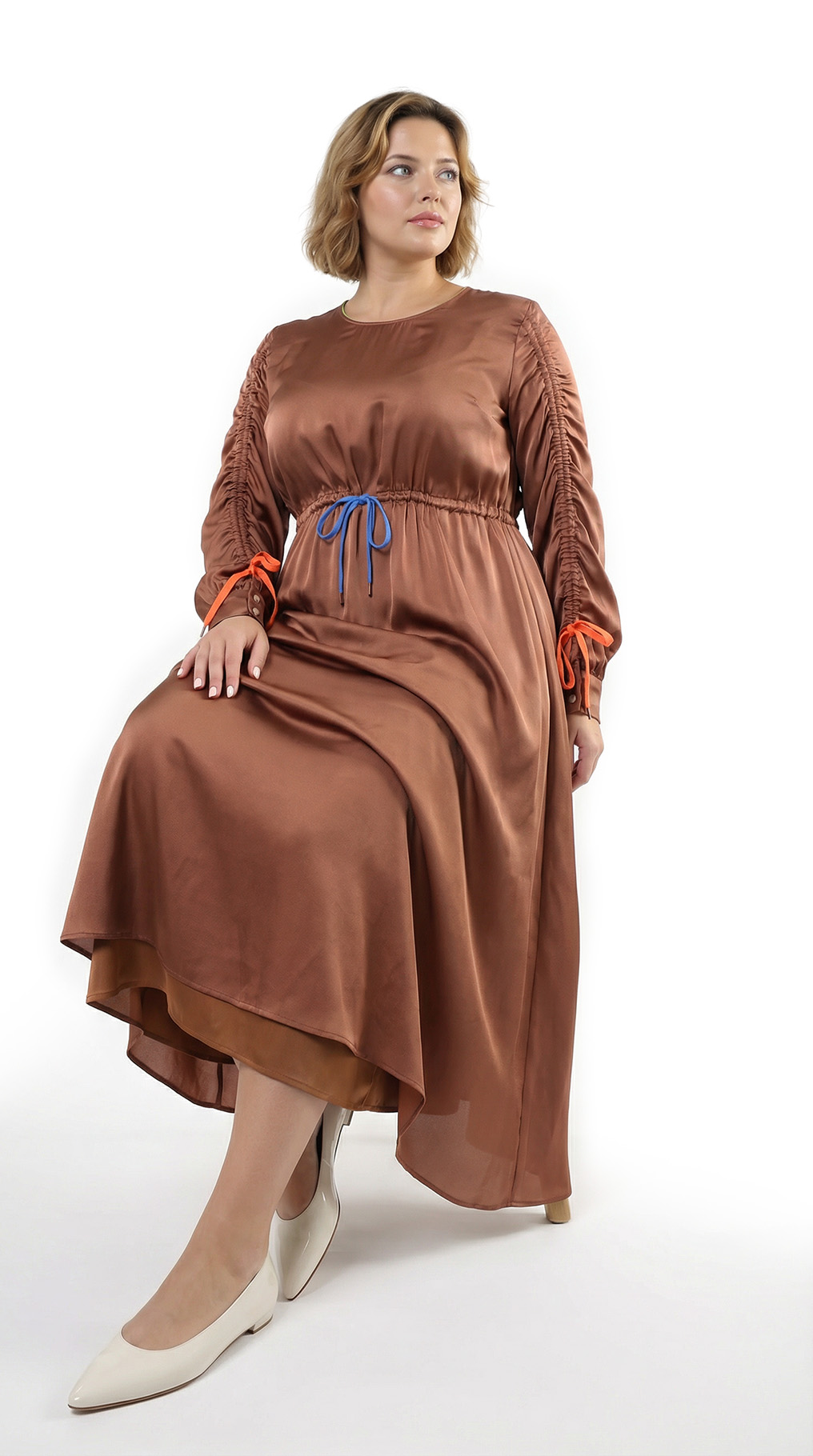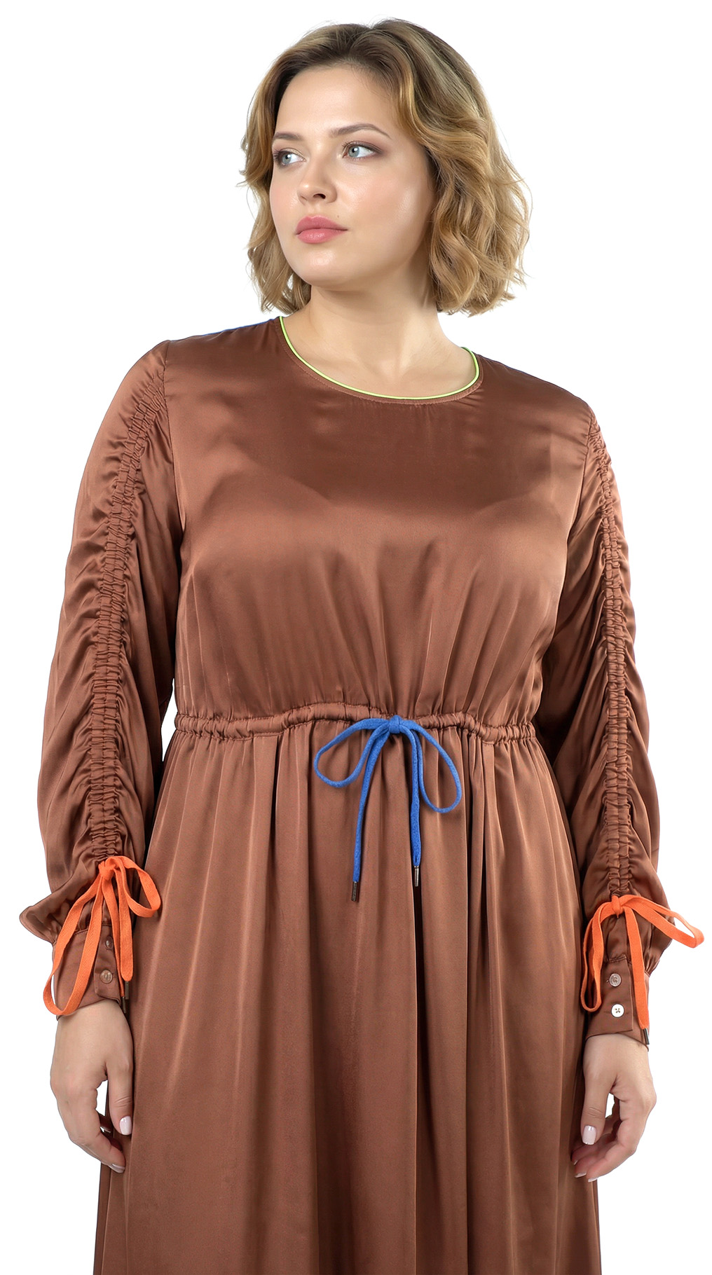 Оригинал. Новое летнее платье концерна Max Mara (линия Marina Rinaldi) шоколадно-коричневого цвета в мелкую точку. Свободный удлиненный фасон «в пол» с завязкой на синий кантик по талии (можно приталить) и длинным присборенным рукавом на широкой манжете с ярким рыжим кантиком. Скругленная горловина с яркой салатовой окантовкой. В составе: 100% п.э, на подкладе из п.э: ткань легкая, шелковистая, приятная к телу. Пошив — Европа (Румыния). Состояние — новое, из аутлета концерна MaxMara (ярлык бренда надрезан — это политика аутлета).