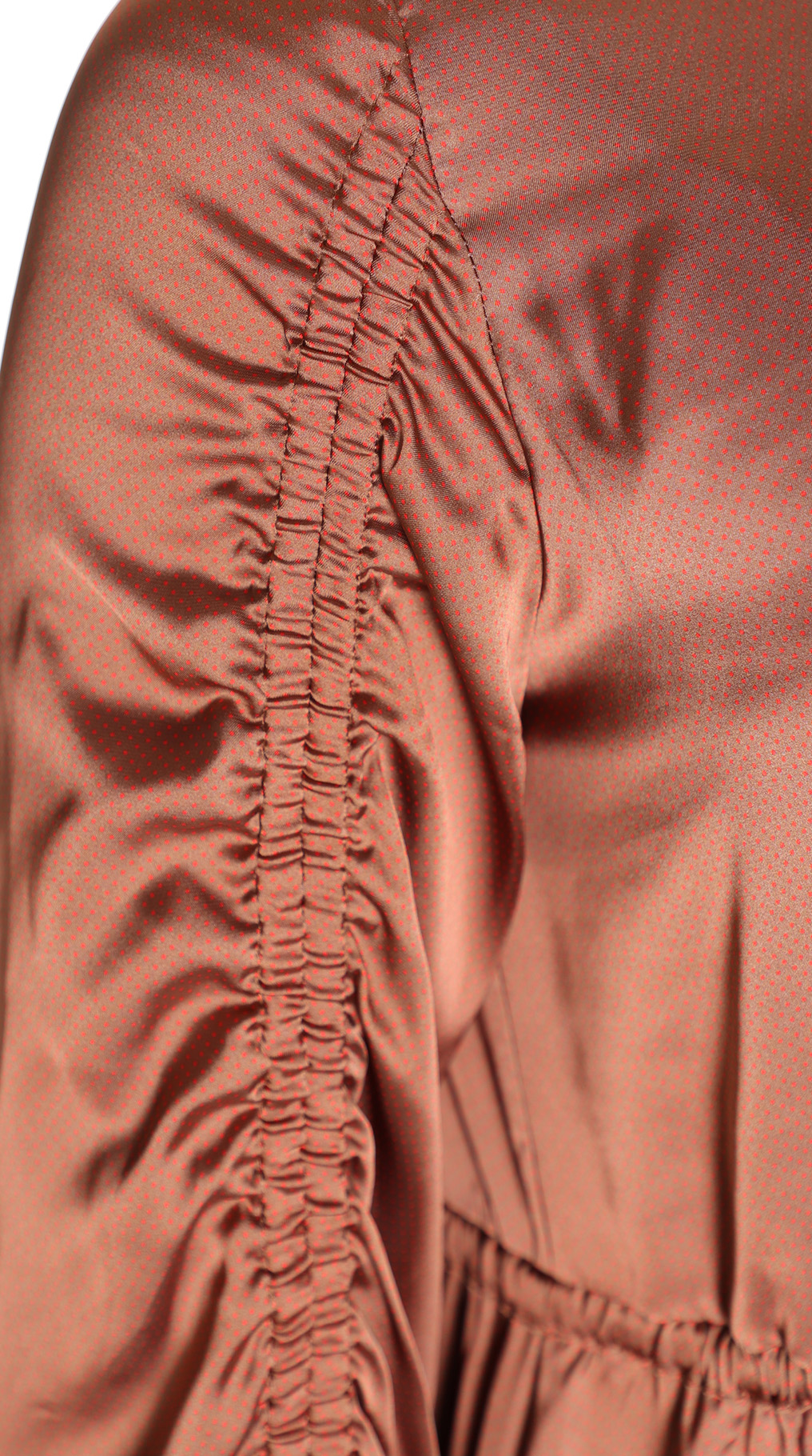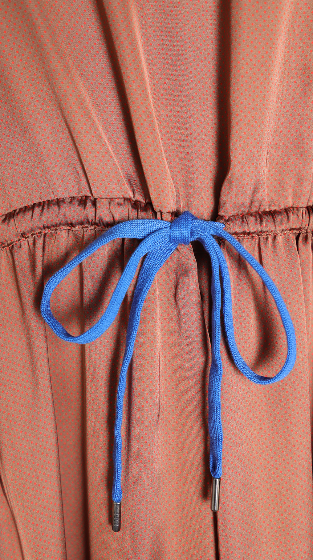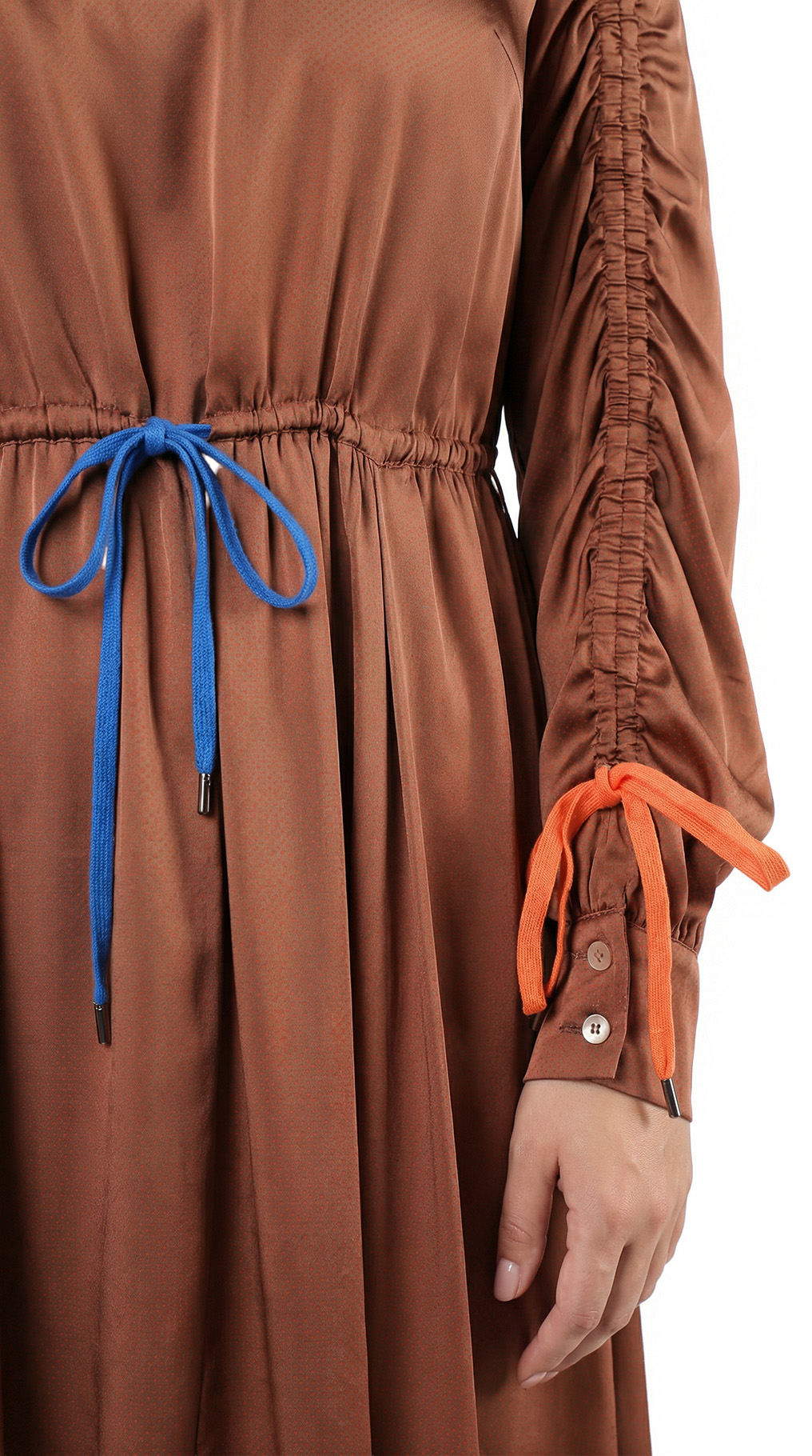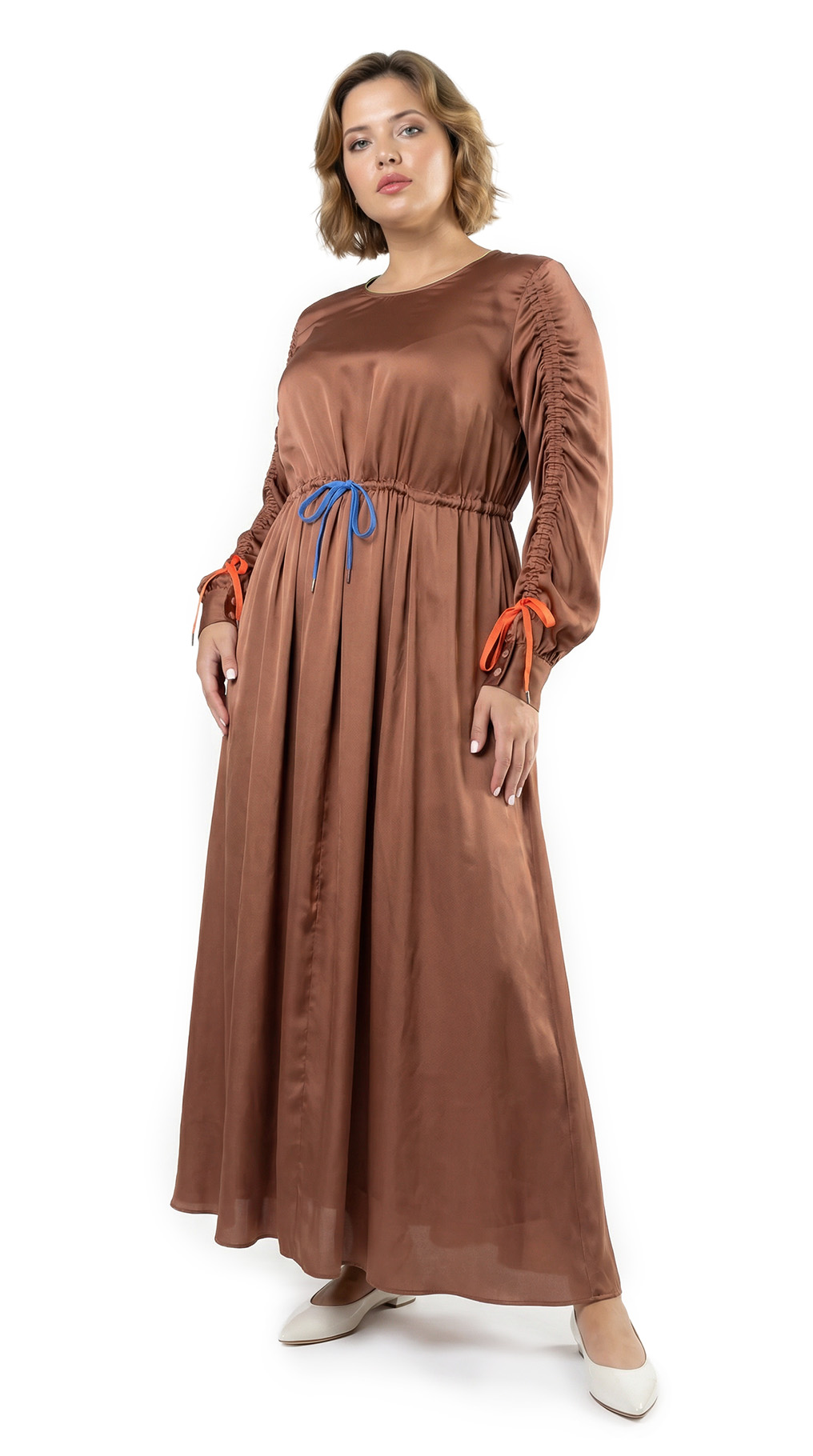 Оригинал. Новое летнее платье концерна Max Mara (линия Marina Rinaldi) шоколадно-коричневого цвета в мелкую точку. Свободный удлиненный фасон «в пол» с завязкой на синий кантик по талии (можно приталить) и длинным присборенным рукавом на широкой манжете с ярким рыжим кантиком. Скругленная горловина с яркой салатовой окантовкой. В составе: 100% п.э, на подкладе из п.э: ткань легкая, шелковистая, приятная к телу. Пошив — Европа (Румыния). Состояние — новое, из аутлета концерна MaxMara (ярлык бренда надрезан — это политика аутлета).