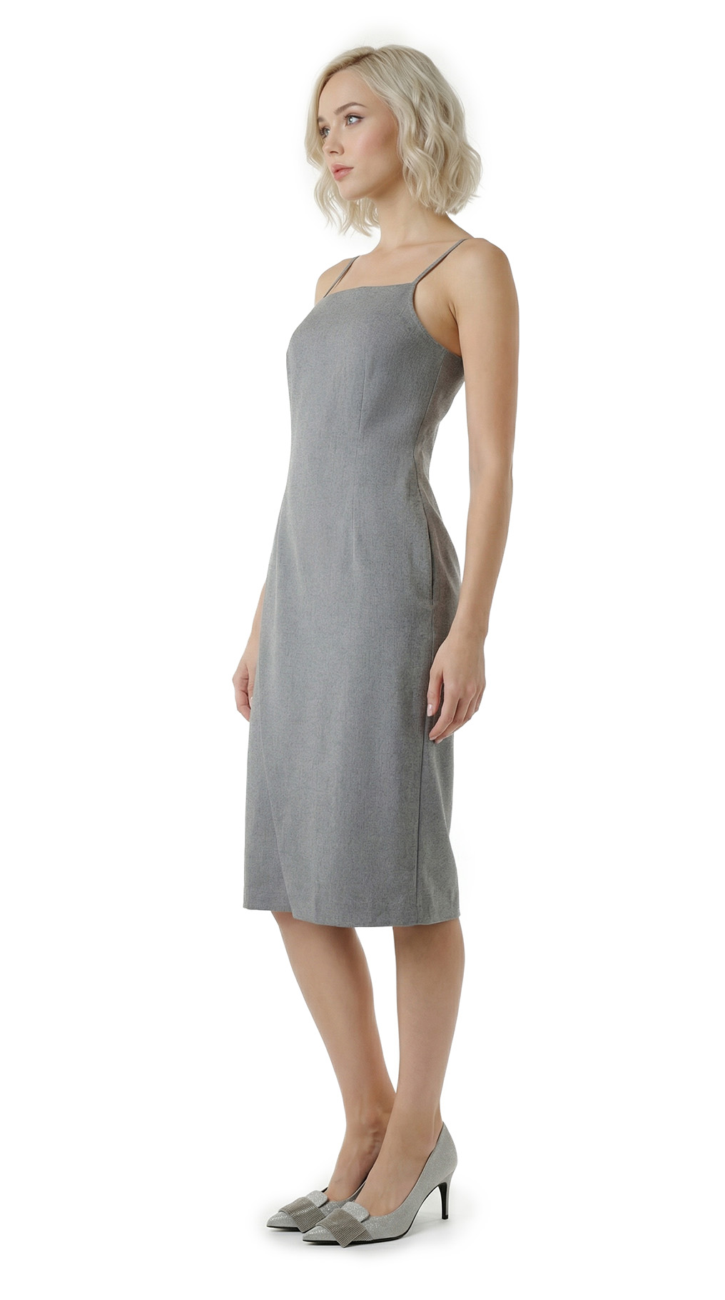 Оригинал. Новое платье на бретелях итальянского концерна Max Mara (линия Max&Co) светло-серого цвета «меланж». Женственный приталенный фасон. Юбочка со скошенным вырезом на запах. Застежка по спинке на молнию. Врезные кармашки в боковых швах. Пошив — Турция. В составе: 64% п.э, 32% вискоза, 4% эластан: ткань средней плотности, мягкая, шелковистая. Состояние — новое из аутлета концерна MaxMara (ярлык бренда надрезан — это политика аутлета).