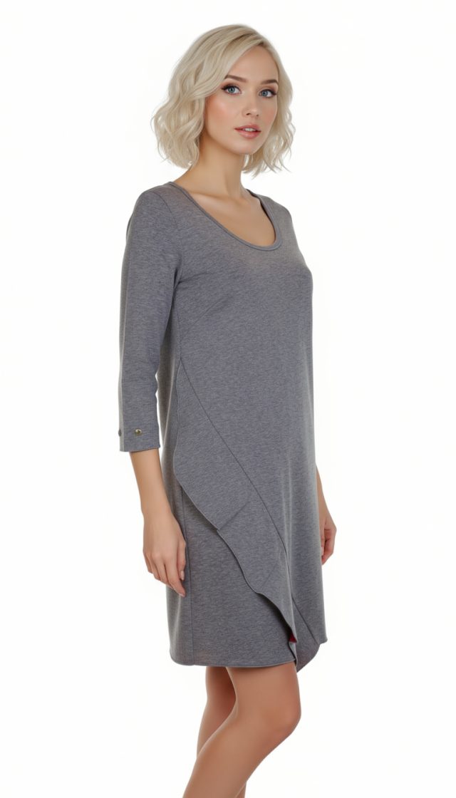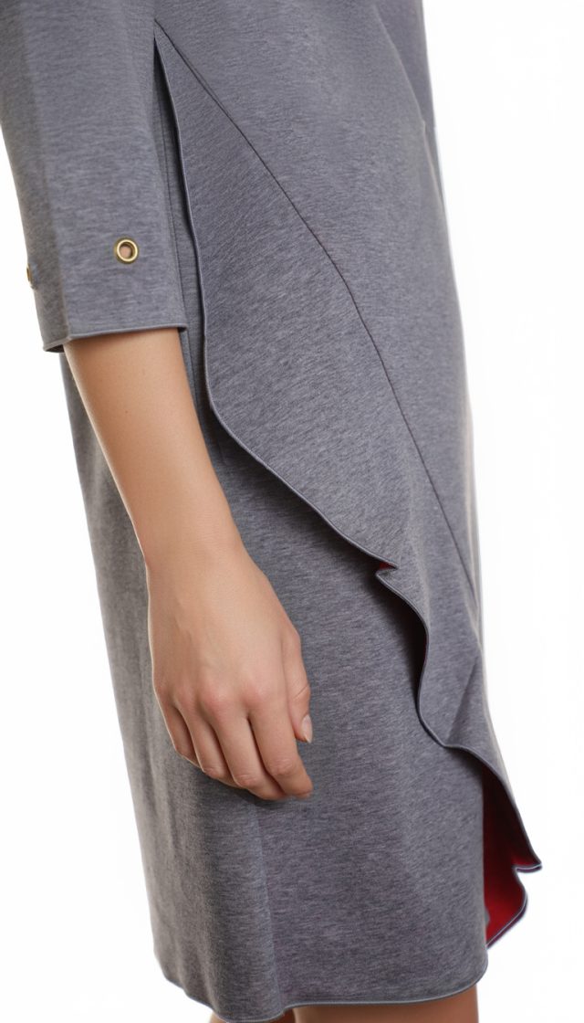 Новое трикотажное платье концерна Max Mara (линия PennyBlack) серого цвета (снаружи) и алого цвета (изнутри). Прямой фасон с рукавом 3/4. Асимметричный волан по переду — визуально стройнит фигуру и притягивает внимание (при движении становится видной алая часть). Золотая перфорация на рукавах — дополняет строгий, и в тоже время дерзкий образ. Фирменная «монетка» с гравировкой PennyBlack. В составе: 92% хлопок, 8% эластан, без подклада: ткань экстра качества — средней плотности, мягкая, фактурная (переплетение нитей «меланж»). Состояние — новое, из аутлета концерна MaxMara (ярлык бренда надрезан — это политика аутлета).