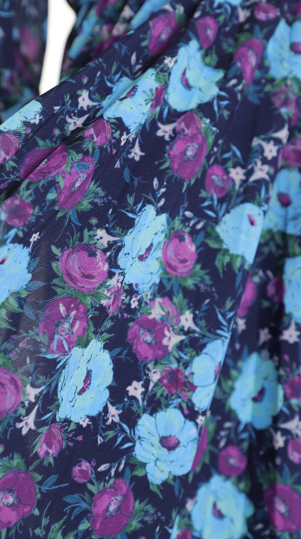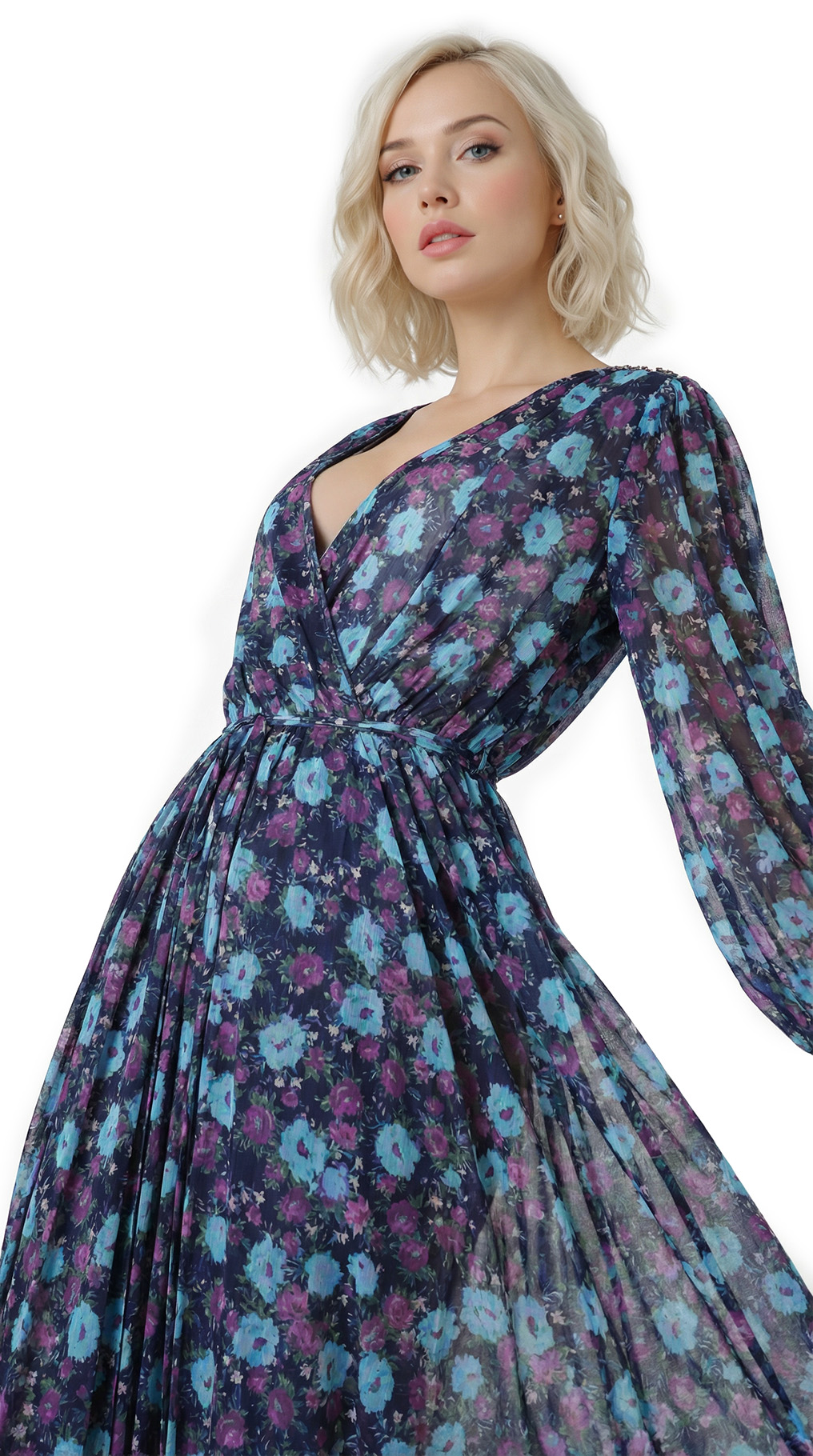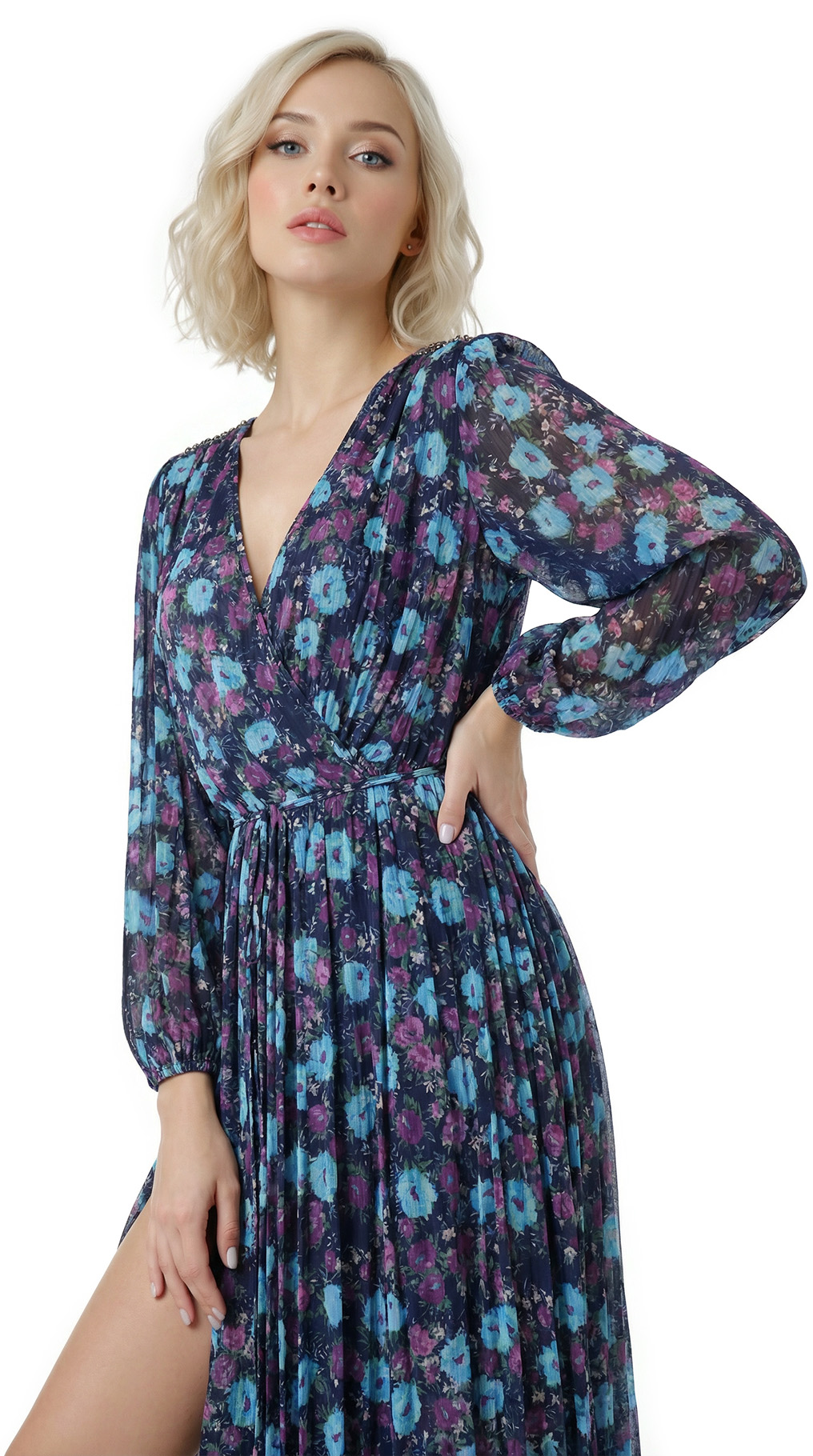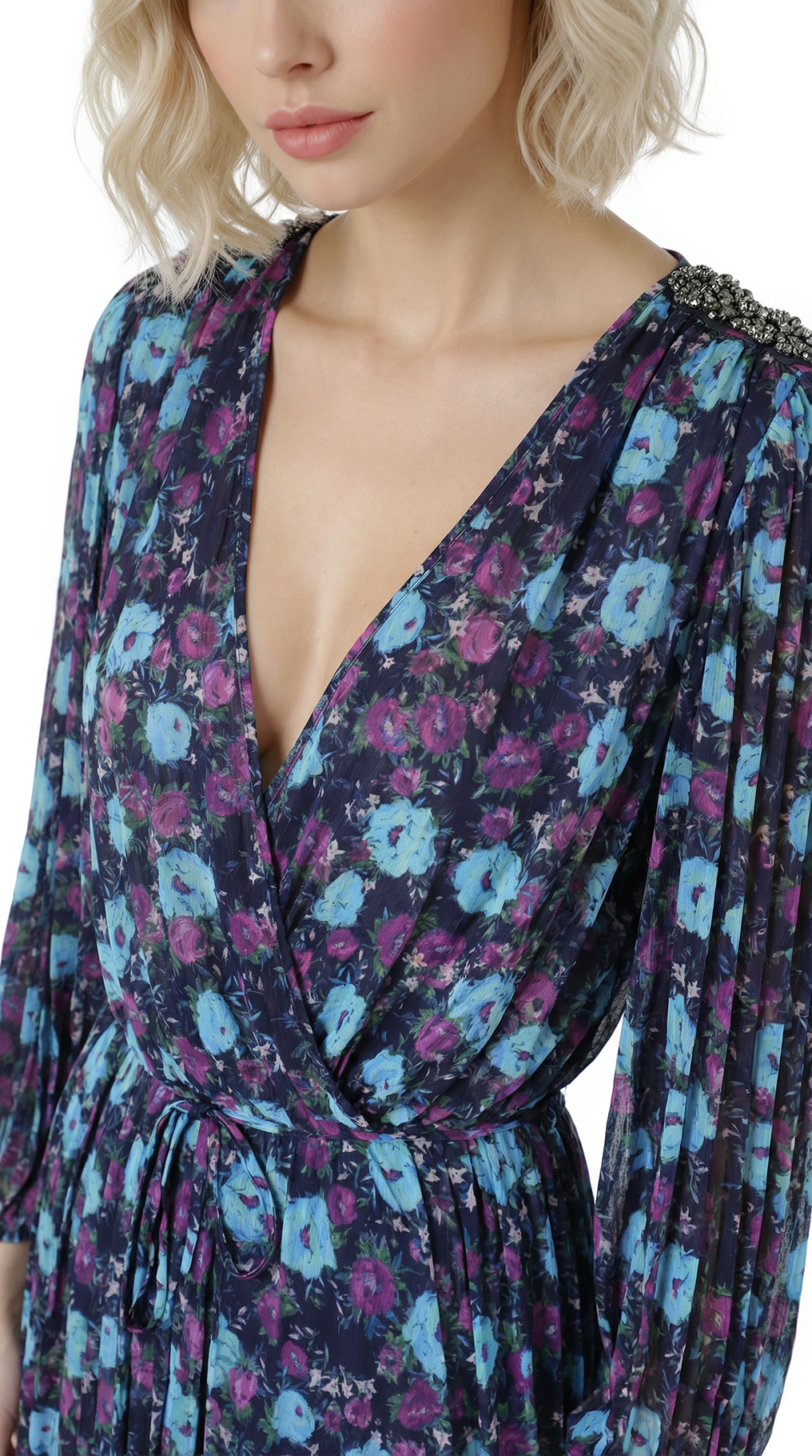 Оригинал. Новое трикотажное платье концерна Max Mara с цветочным принтом фиолетово-голубых тонов. Женственный удлиненный фасон с глубоким вырезом декольте на запах, приспущенным рукавом «фонарик» и присборенной юбочкой полу-солнце. Резинка и подвязка на кантик по талии. Декор из страз на плечах. В составе 100% п.э, юбочка на подкладе из п.э. Состояние — новое, из аутлета концерна Max Mara (ярлык бренда надрезан — это политика аутлета).