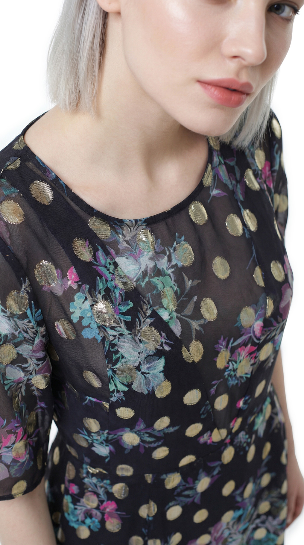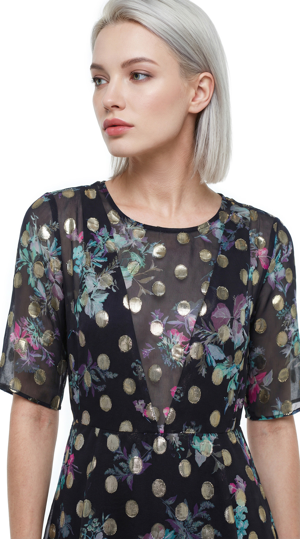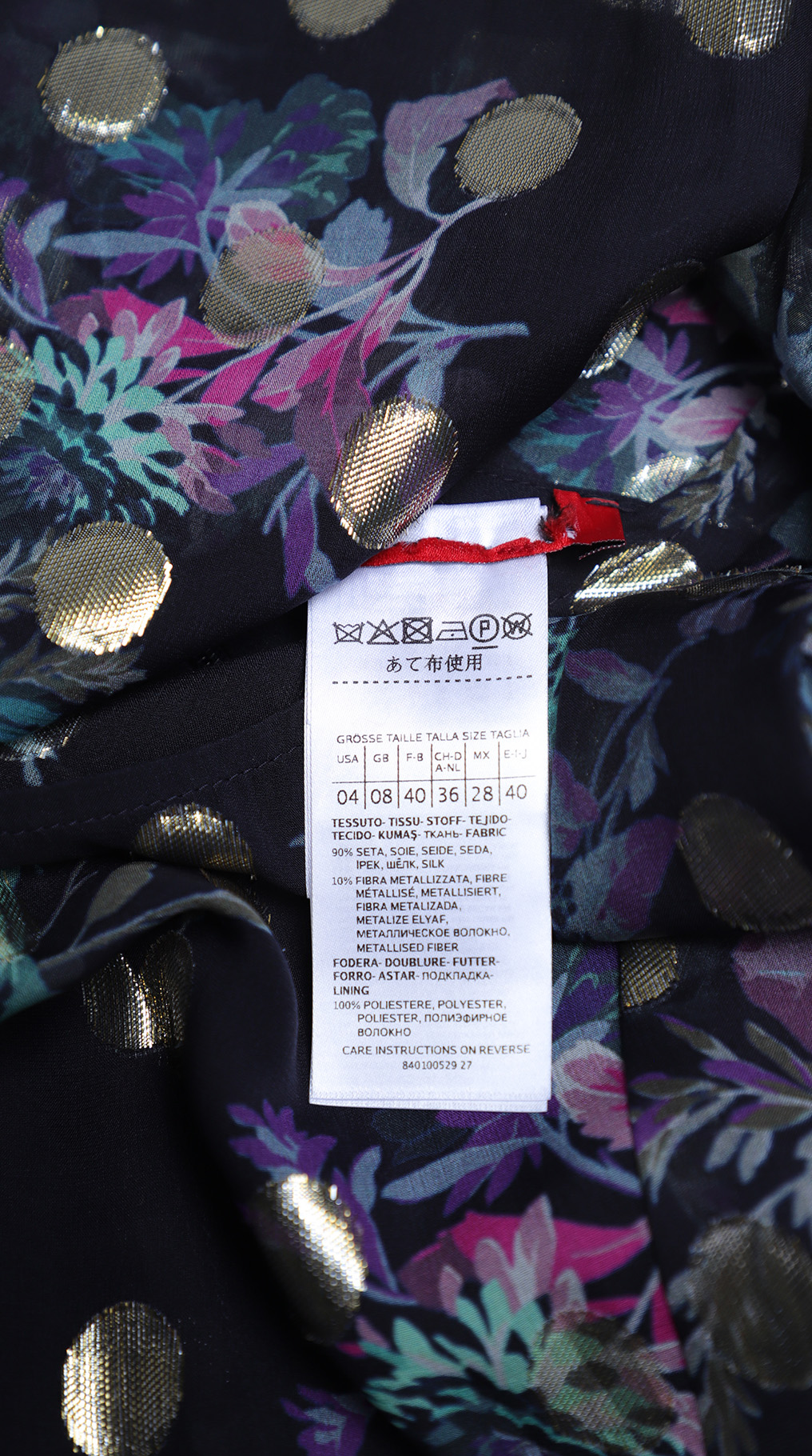 Оригинал. Новое шелковое платье концерна Max Mara (коллекция Studio) черного цвета с цветочным принтом и золотыми кругами, красиво переливающимися на свету. Женственный приталенный фасон с рукавом 1/2, пышной юбочкой полу-солнце и глубоким «секси» вырезом по спинке. Кармашки в боковых швах. Застежка по спинке на молнию. В составе: 90% натуральный шелк (шифон), 10% фибра металлик, подклад — п.э: ткань легкая, воздушная, с характерным шелковистым блеском. Состояние — новое, из аутлета концерна MaxMara (ярлык бренда надрезан — это политика аутлета).