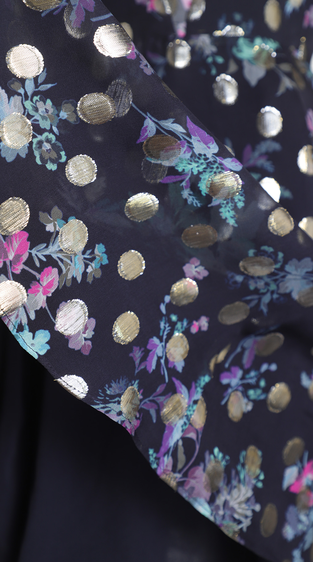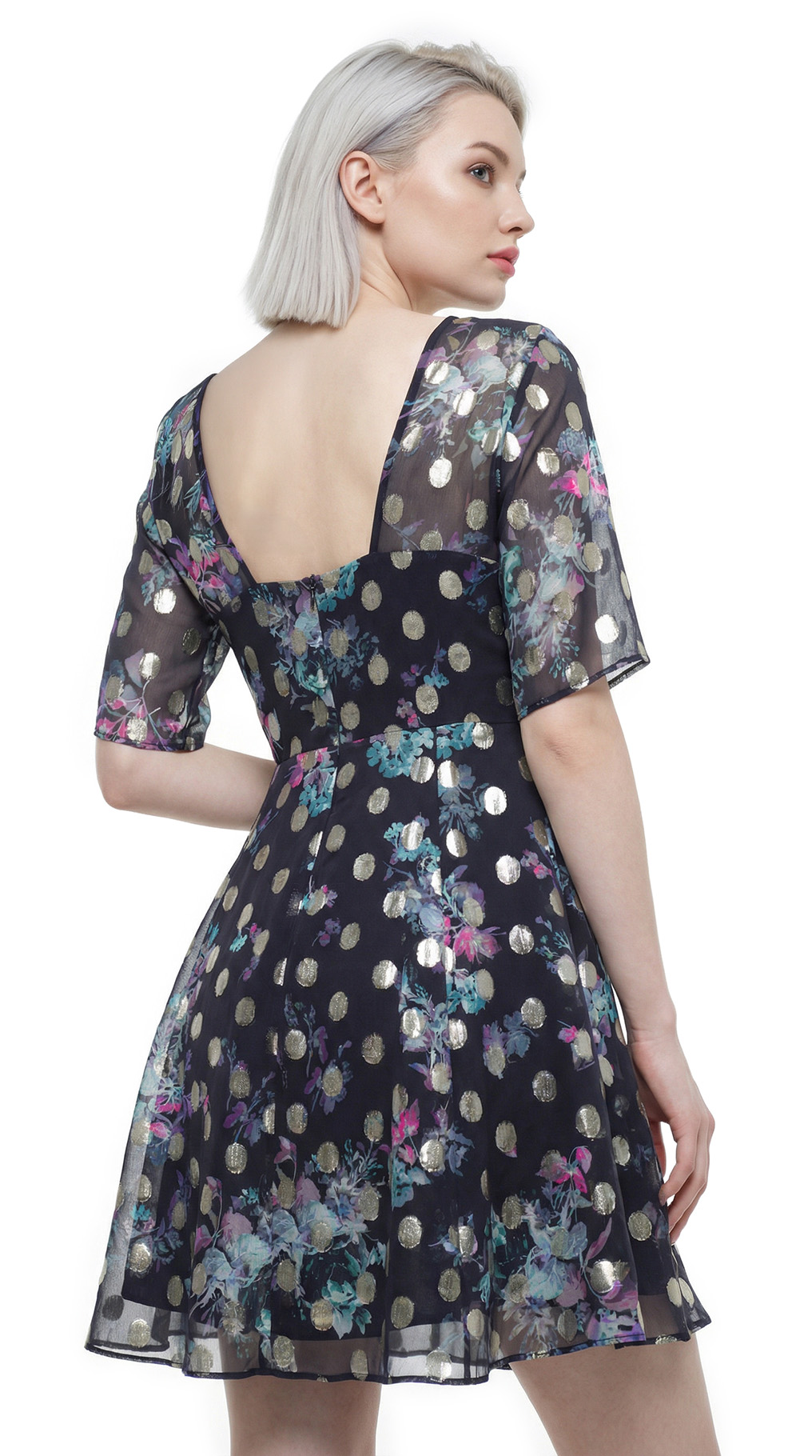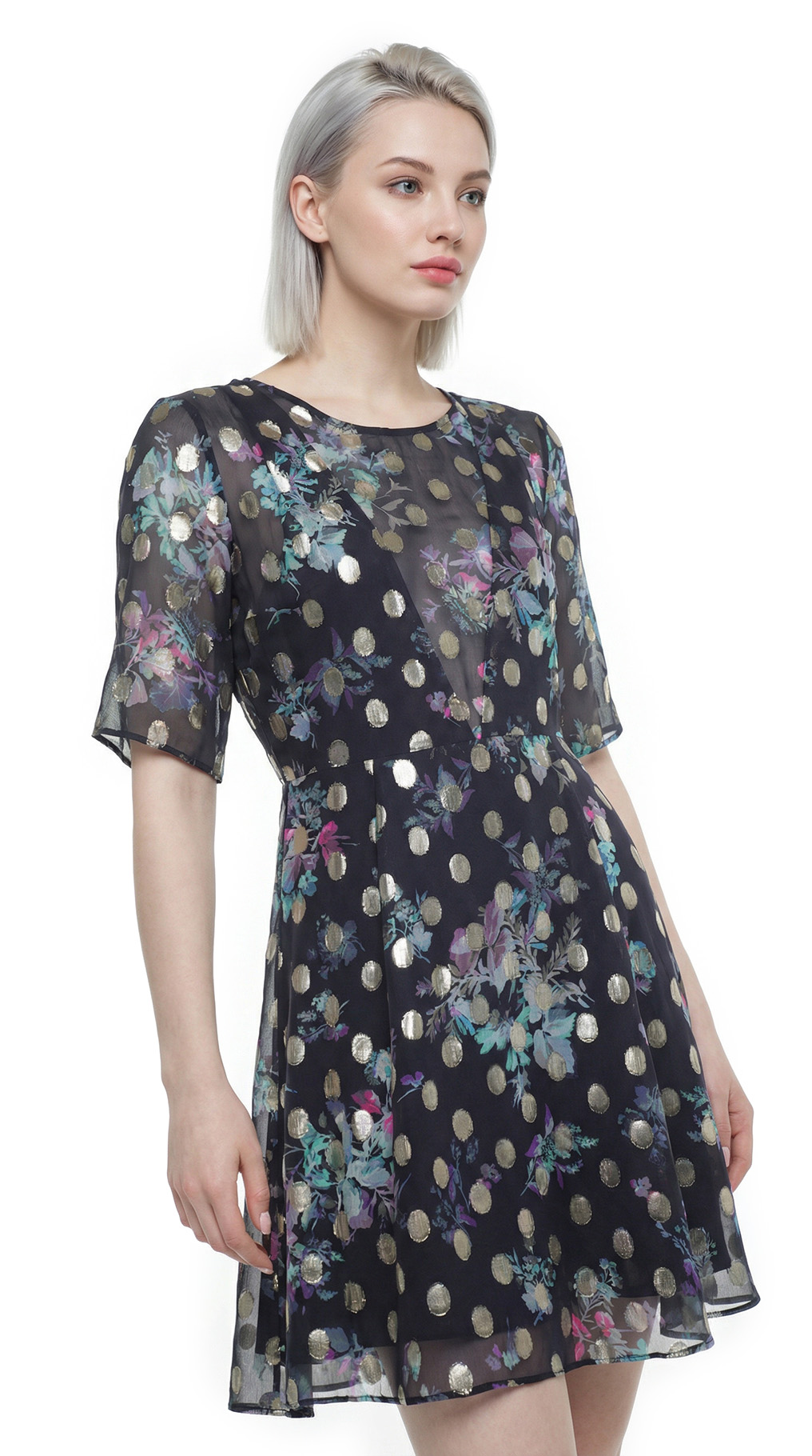 Оригинал. Новое шелковое платье концерна Max Mara (коллекция Studio) черного цвета с цветочным принтом и золотыми кругами, красиво переливающимися на свету. Женственный приталенный фасон с рукавом 1/2, пышной юбочкой полу-солнце и глубоким «секси» вырезом по спинке. Кармашки в боковых швах. Застежка по спинке на молнию. В составе: 90% натуральный шелк (шифон), 10% фибра металлик, подклад — п.э: ткань легкая, воздушная, с характерным шелковистым блеском. Состояние — новое, из аутлета концерна MaxMara (ярлык бренда надрезан — это политика аутлета).