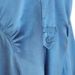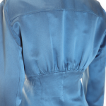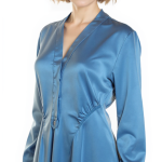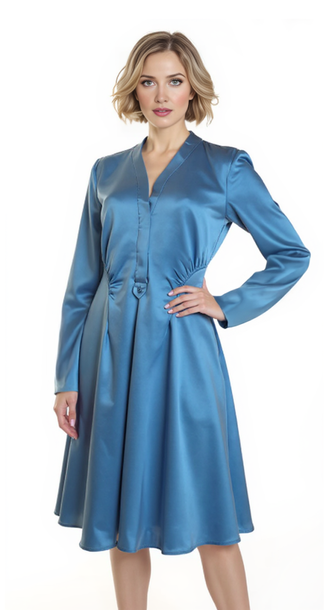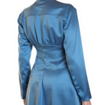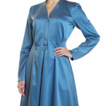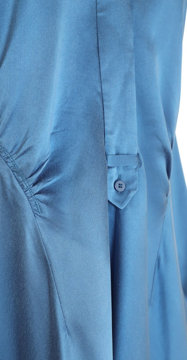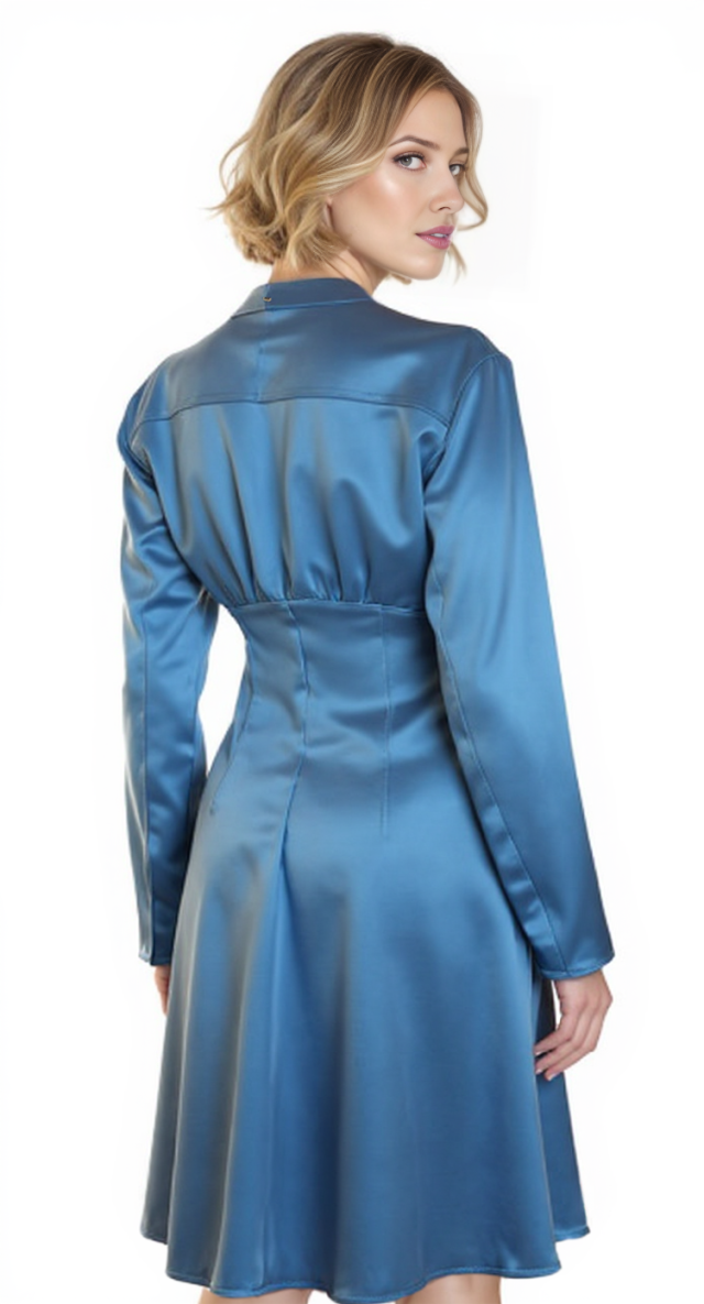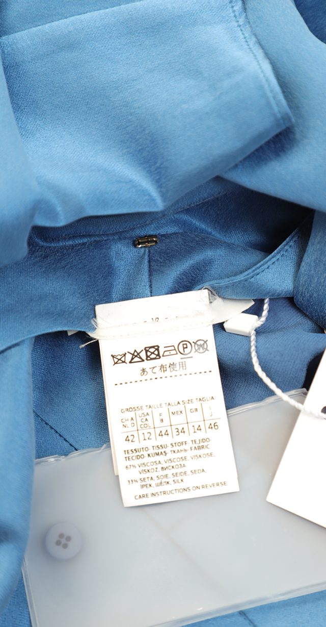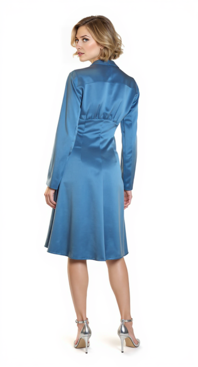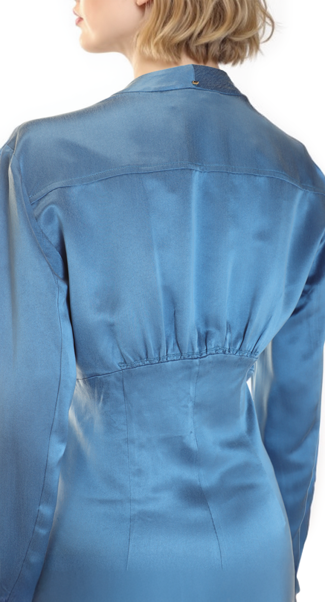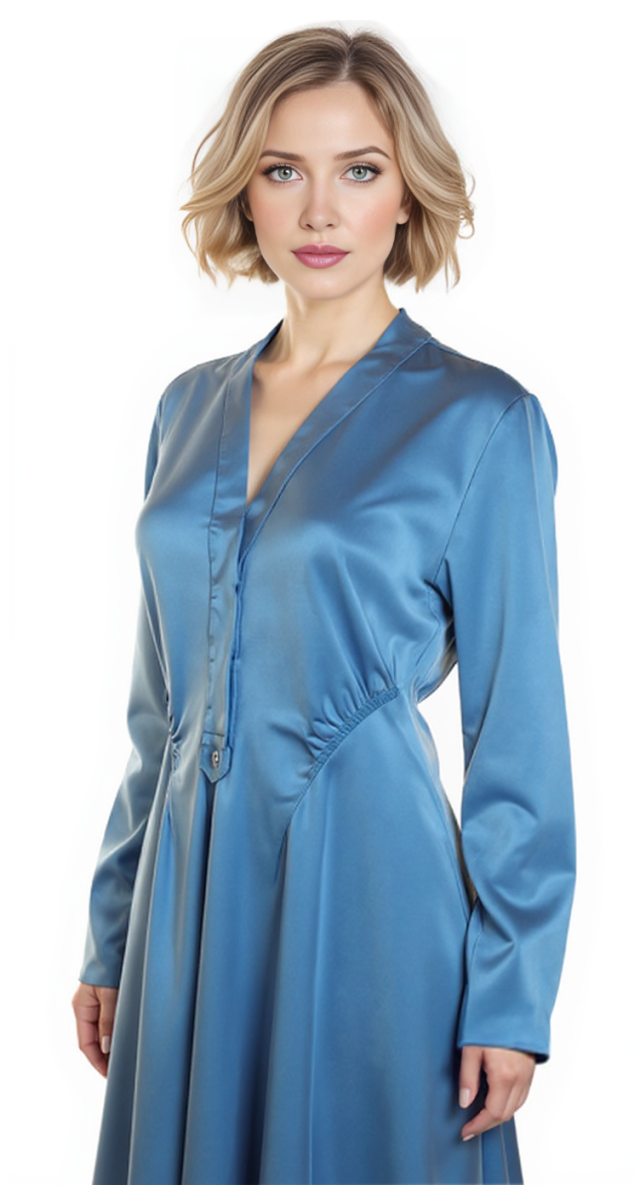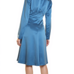 Новое дизайнерское платье концерна Max Mara сложного лазурно-голубого цвета с атласным эффектом. Женственный полу-приталенный силуэт с V-вырезом декольте, присборенной линией талии и длинным приспущенным рукавом. Застежка спереди на потайные пуговки за планкой. В составе: 67% вискоза, 33% натуральный шелк, без подкалада — ткань экстра качества: средней плотности, очень мягкая, бархатистая. Пошив — Европа (Португалия). Состояние — новое, из аутлета концерна Max Mara (ярлык бренда надрезан — это политика аутлета).