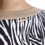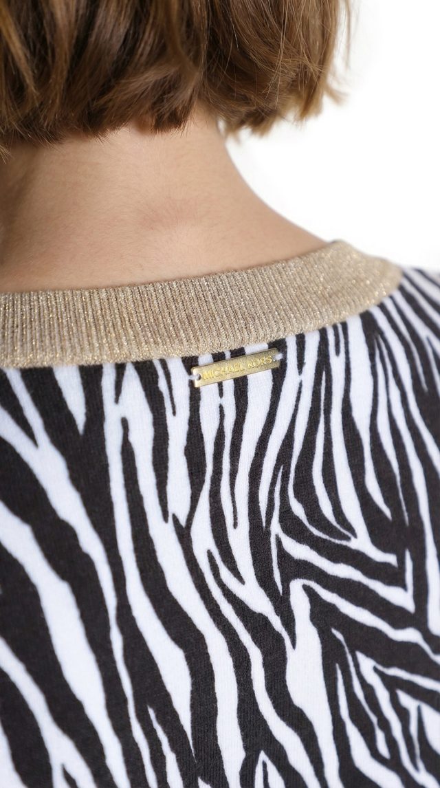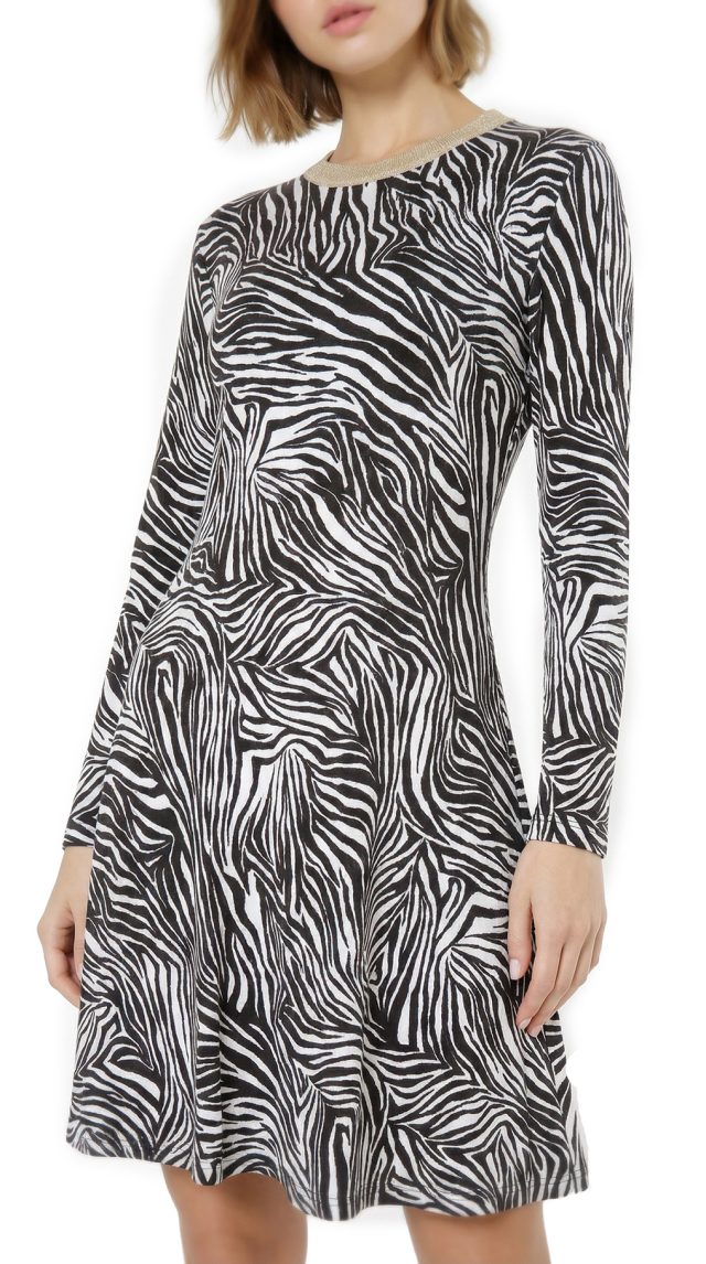 Новое трикотажное платье Michael Kors с ярким геометрическим принтом под «зебру». Приталенный покрой с юбочкой полу-солнце и длинным рукавом. Окантовка горловины золотым люрексом. Фирменная золотая плашка с гравировкой бренда по спинке. Без застежки. В составе: 54% хлопок, 25% вискоза, 18% нейлон, 3% эластан, без подклада — ткань очень мягкая, приятная к телу. Продается с оригинальной биркой магазина Michael Kors.