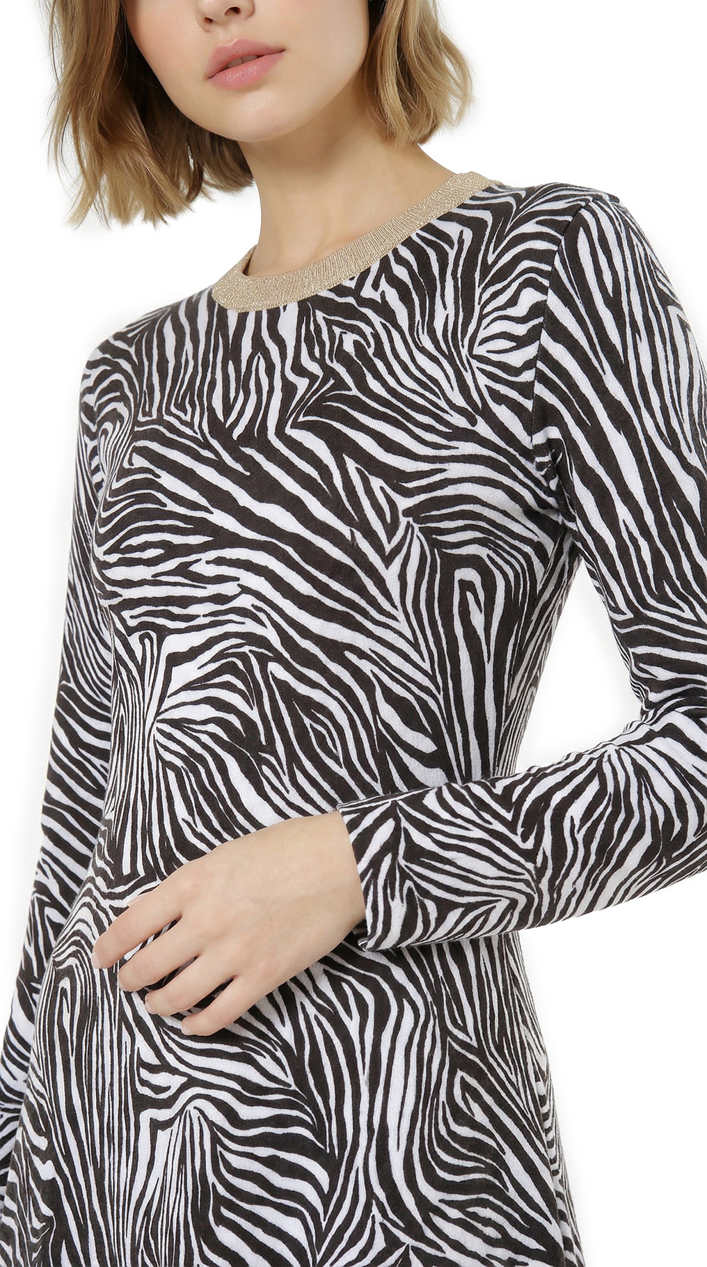Новое трикотажное платье Michael Kors с ярким геометрическим принтом под «зебру». Приталенный покрой с юбочкой полу-солнце и длинным рукавом. Окантовка горловины золотым люрексом. Фирменная золотая плашка с гравировкой бренда по спинке. Без застежки. В составе: 54% хлопок, 25% вискоза, 18% нейлон, 3% эластан, без подклада — ткань очень мягкая, приятная к телу. Продается с оригинальной биркой магазина Michael Kors.