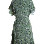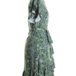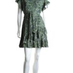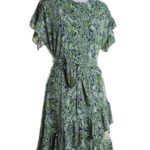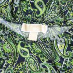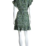 Яркое женственное летнее платье Michael Kors в зелено-черных тонах с узором пейсли: культовым огуречным принтом. Приталенный покрой. Юбочка и короткий приспущенный рукав с воланами. Подвязка на пояс по талии. Длина выше колен. Без застежки. Ткань очень мягкая, отлично тянется. В составе: 95% п/э, 5% эластан. Без подклада. Состояние — идеальное, как новое.