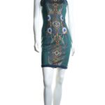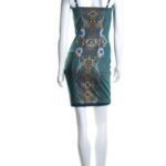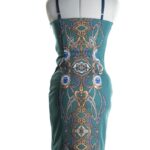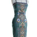 Новое стильное платье на бретелях Rinascimento бирюзово — зеленого цвета с окантовкой горловины стразами и узнаваемым геометрическим принтом. Прилегающий покрой, который подчеркивает все прелести женской фигурки. Застежка по спинке на молнию. В составе — 93% п/э, 4% високоза, 3% эластан, без подклада: ткань мягкая, хорошо тянется. Состояние — новое, без бирки, без носки.