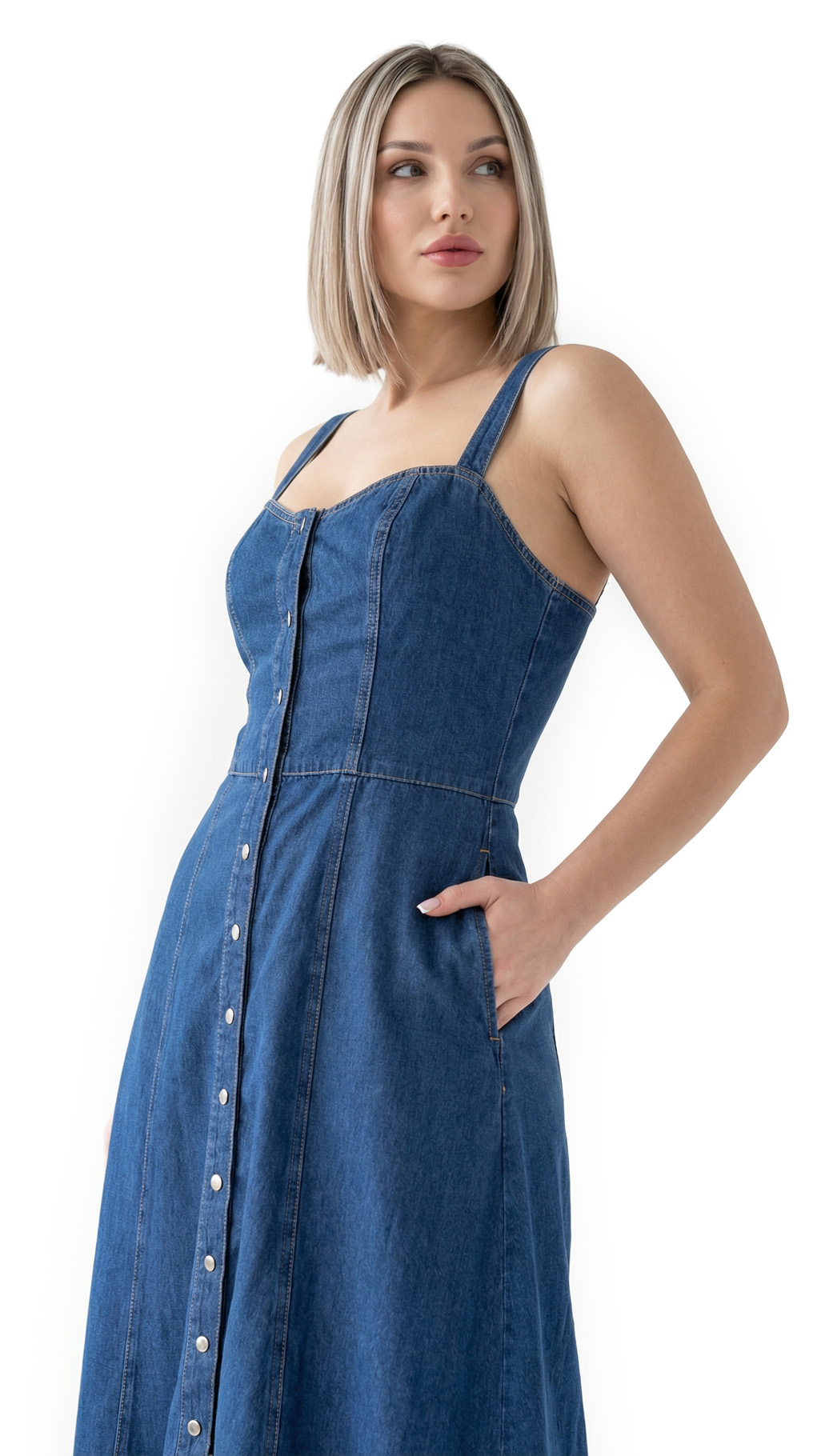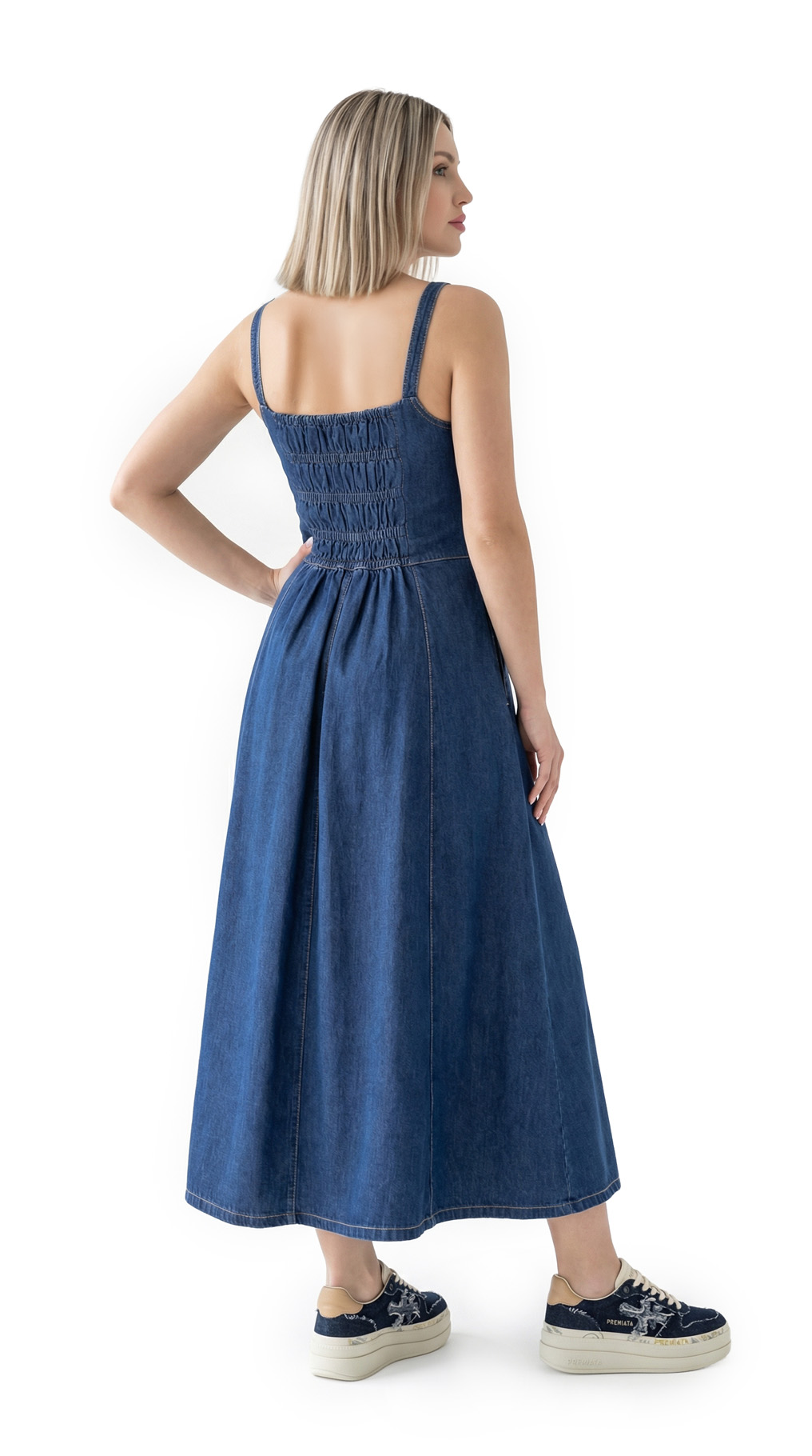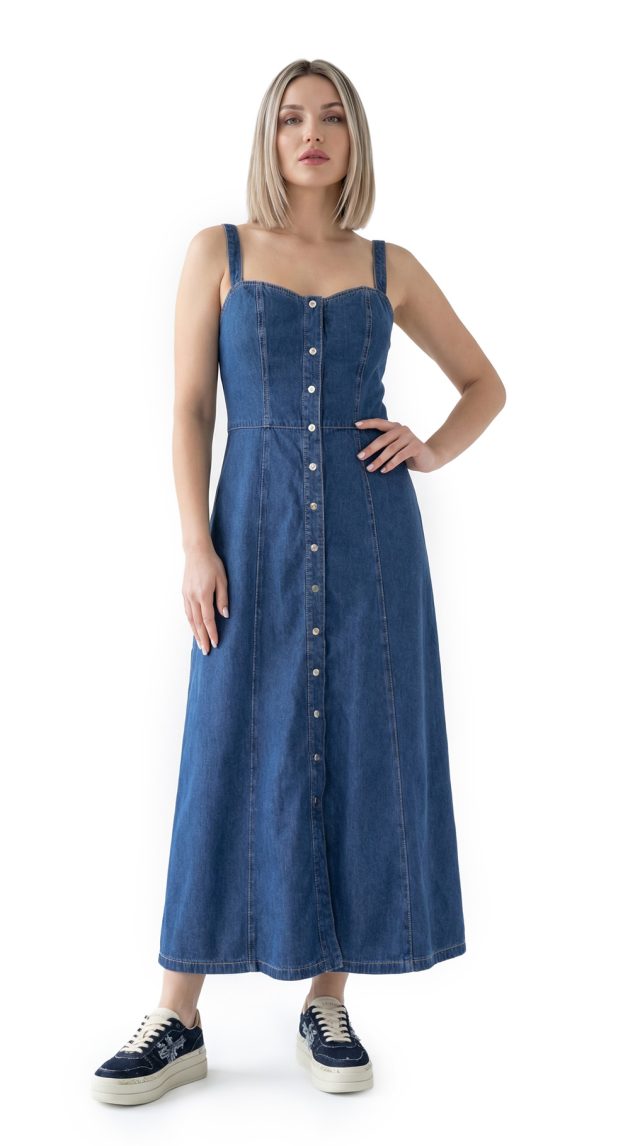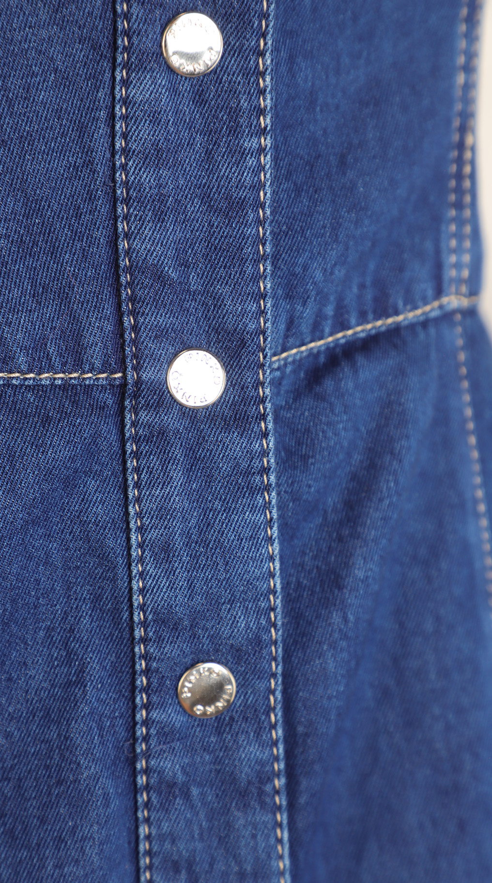 Новое джинсовое платье Pinko темно-синего цвета с контрастной светло-бежевой отстрочкой. Женственный приталенный силуэт с открытым вырезом декольте, на бретелях. Застежка спереди на брендированные кнопочки. Врезные кармашки по бокам. Эластичная резинка гофре по спинке. В составе: 100% хлопок, без подклада — ткань экстра качества: плотная, мягкая, эластичная. Состояние — новое, с оригинальной биркой Pinko.