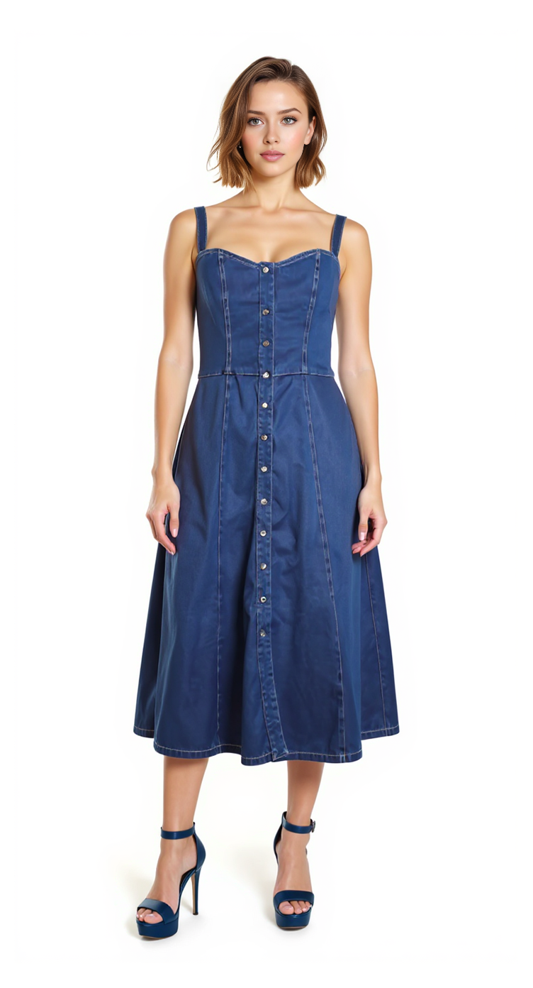 Новое джинсовое платье Pinko темно-синего цвета с контрастной светло-бежевой отстрочкой. Женственный приталенный силуэт с открытым вырезом декольте, на бретелях. Застежка спереди на брендированные кнопочки. Врезные кармашки по бокам. Эластичная резинка гофре по спинке. В составе: 100% хлопок, без подклада — ткань экстра качества: плотная, мягкая, эластичная. Состояние — новое, с оригинальной биркой Pinko.