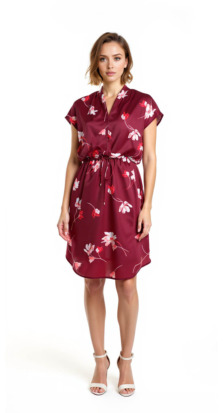 Новое платье Ralph Lauren вишневого цвета с красивым цветочным принтом, декорированным бисером. Женственный фасон, свободный в груди, с подвязкой на кантик по талии. Короткий приспущенный рукав в стиле «бабочка». Красивый вырез горловины «треугольничком» с изящной декоративной драпировкой. Зауженная юбочка «карандаш». Застежка по спинке на фирменную молнию. Оригинал из США. В составе: 100% п/э, на подкладе из п/э — ткань экстра качества: легкая, шелковистая, приятная к телу. Состояние — новое, с фирменной биркой магазина Ralph Lauren. Цена на бирке — 175$.
