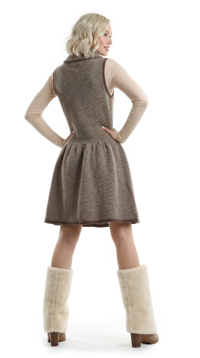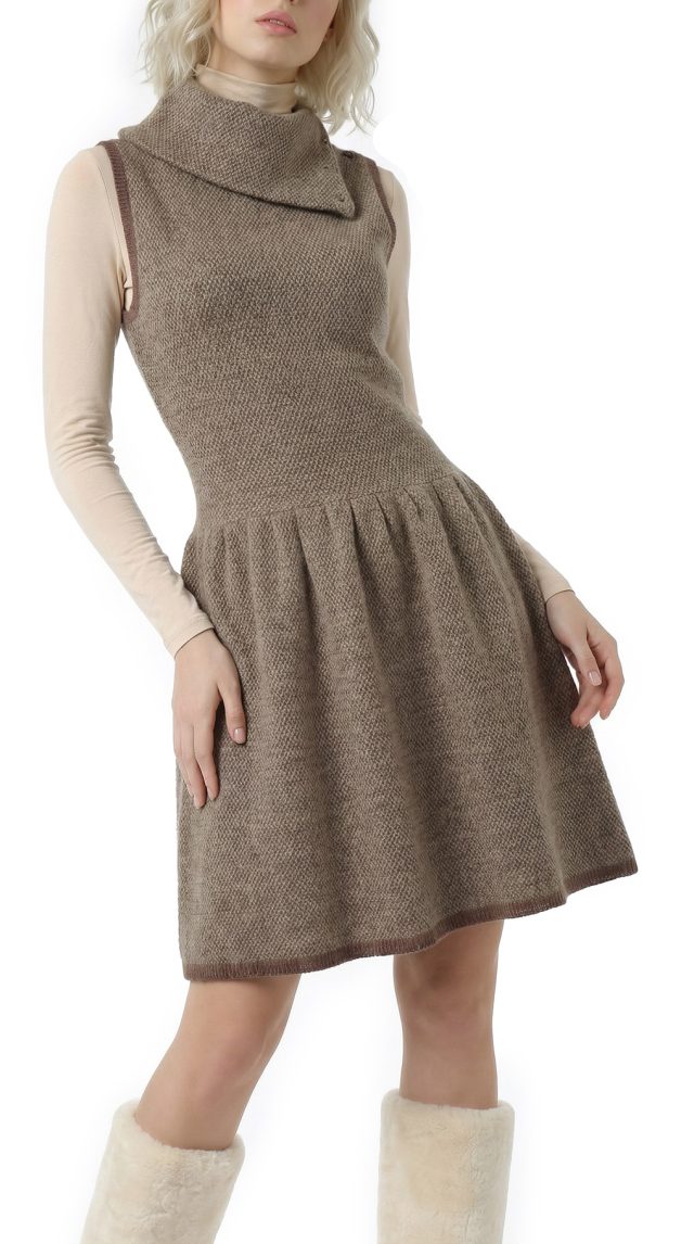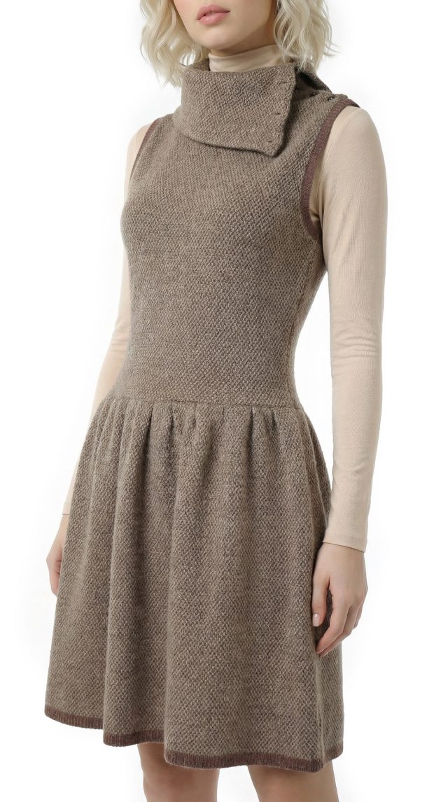 Шерстяное трикотажное платье Ralph Lauren (премиальная коллекция Rugby) песочного цвета с объемным воротником «хомут», застегиваемым на пуговки. Фасон «безрукавка» с обтягивающим топом и пышной присборенной юбочкой. Декоративная коричневая окантовка по краю проймы и низу платья. Без застежки. В составе: 100% шерсть — ткань плотной вязки, мягкая, хорошо тянется. Состояние — отличное.
