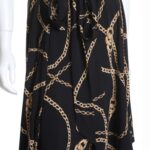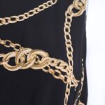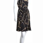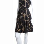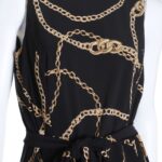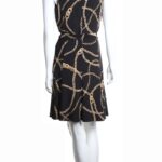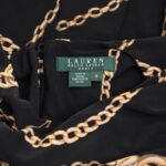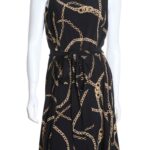 Трикотажное платье Ralph Lauren с фирменным, узнаваемым, принтом золотых цепей на черном фоне. Женственный приталенный фасон с подвязкой на пояс по талии, юбочкой полусолнце со складками и топом без рукавов. Застежка на пуговку по спинке. Оригинал из США. В составе — 100% п/э: ткань плотная, шелковистая, с хорошим стретчем. Состояние — идеальное, как новое.