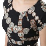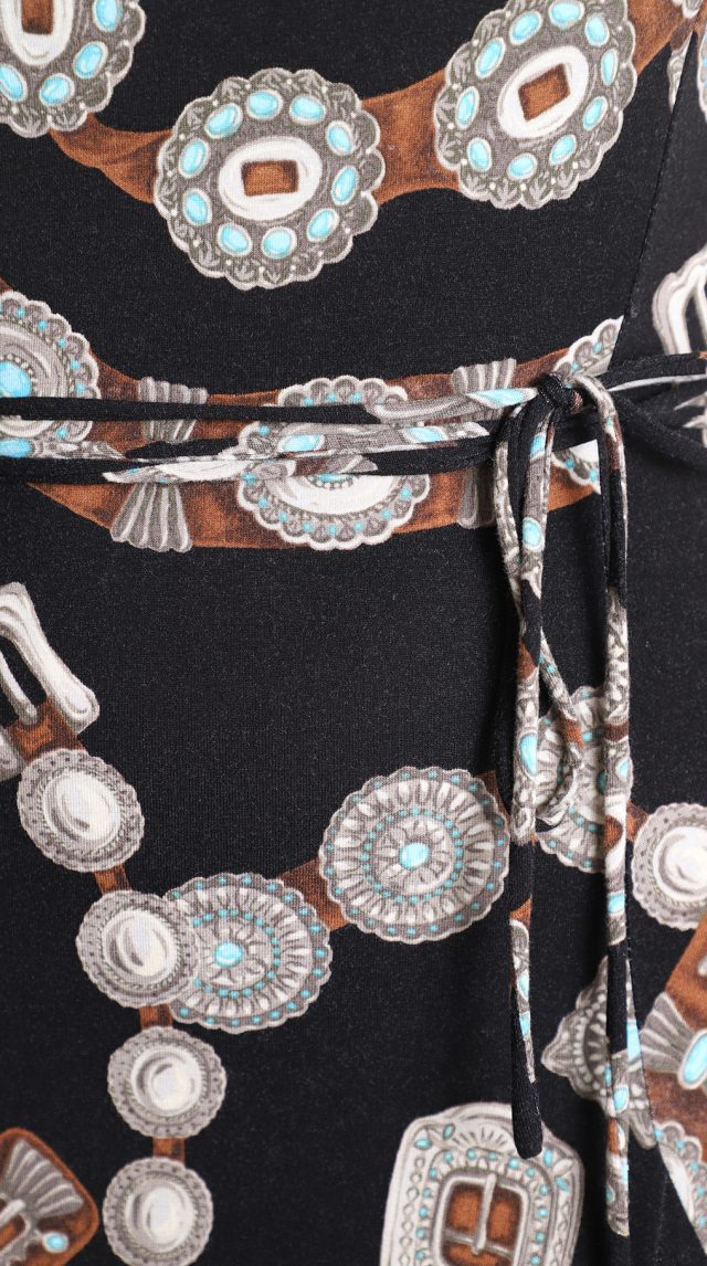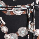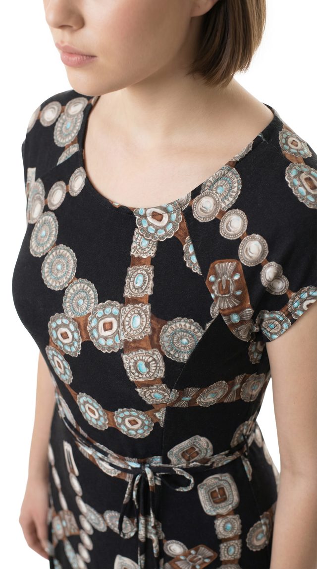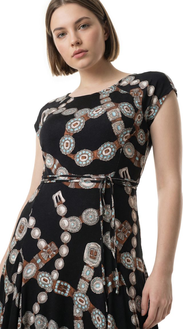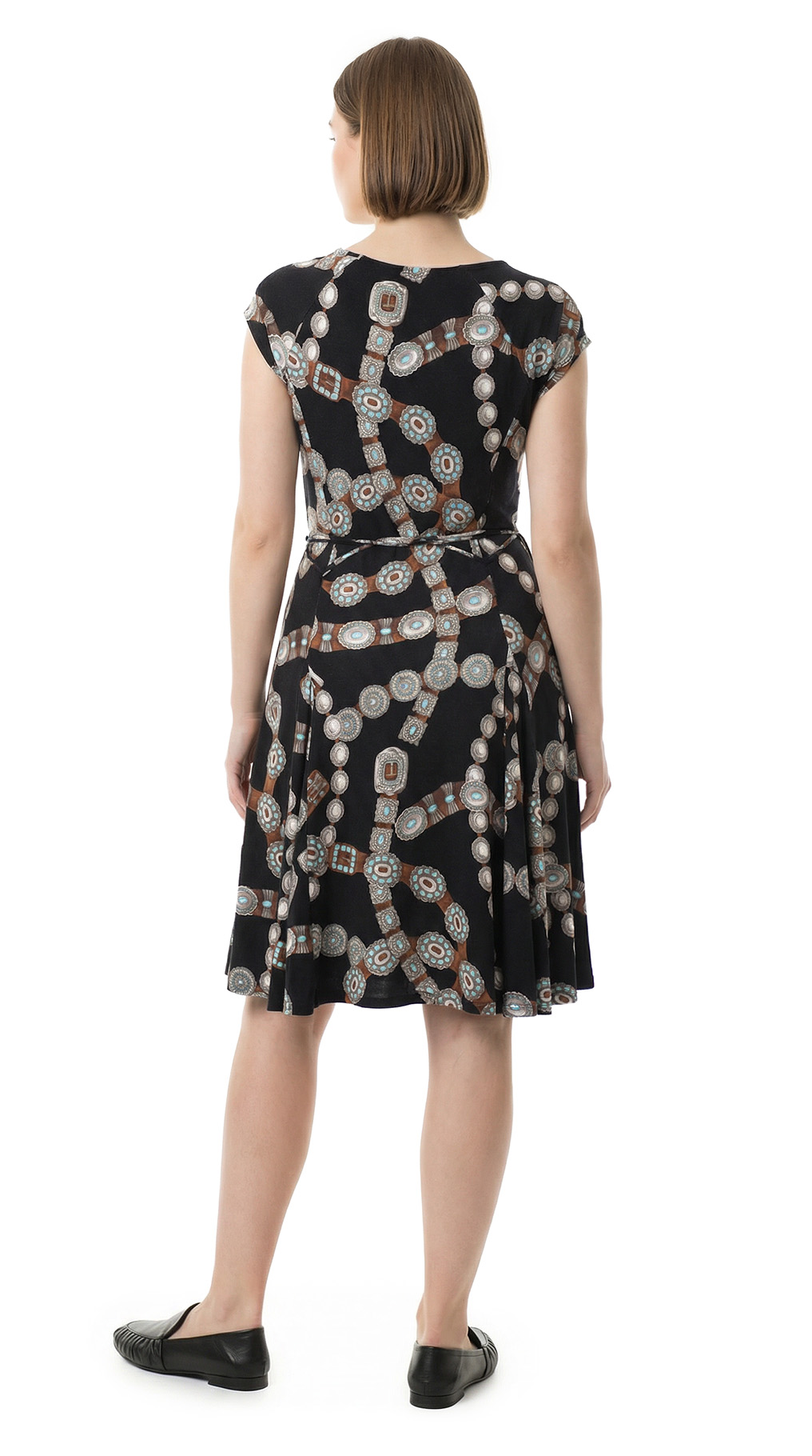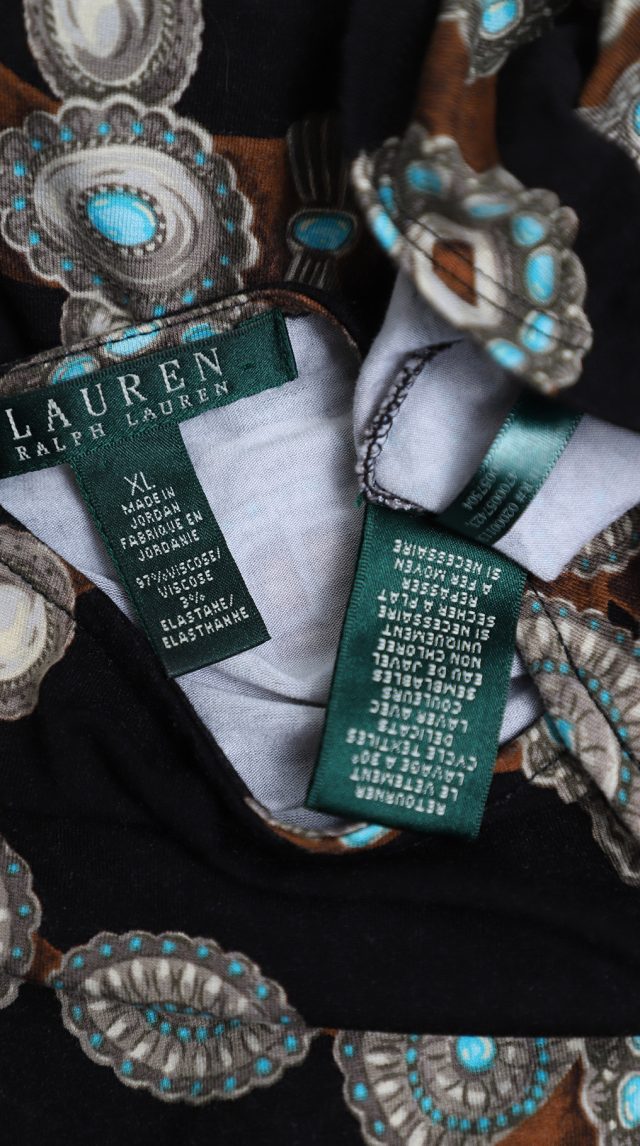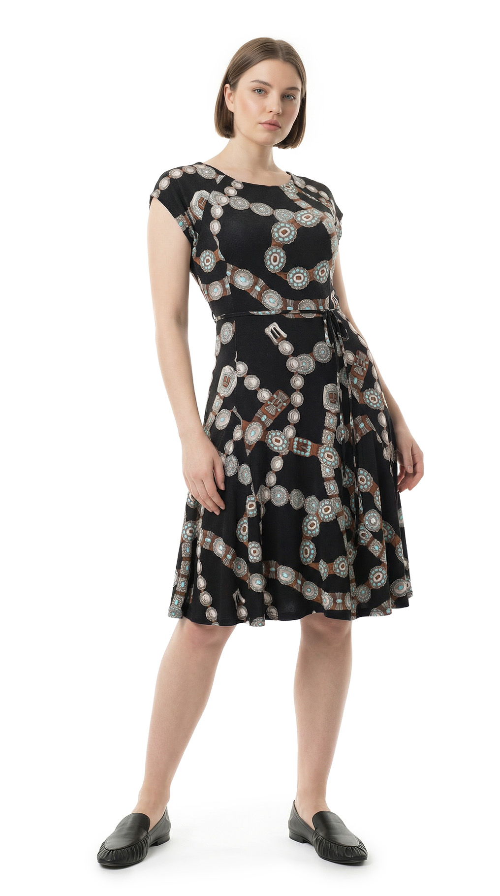 Оригинал из США. Женственное трикотажное платье премиального американского бренда Ralph Lauren с фирменном, узнаваемым принтом: бирюзово-коричневые цепи на черном фоне. Приталенный фасон с расклешенной от бедра юбочкой и подвязкой на поясок по талии. Короткий приспущенный рукав. Скругленная горловина. Без застежки. Фирменное качество элитного бренда. В составе: 97% вискоза, 3% эластан, без подклада: ткань средней плотности, хорошо тянется и прекрасно садится по фигурке. Состояние — отличное.