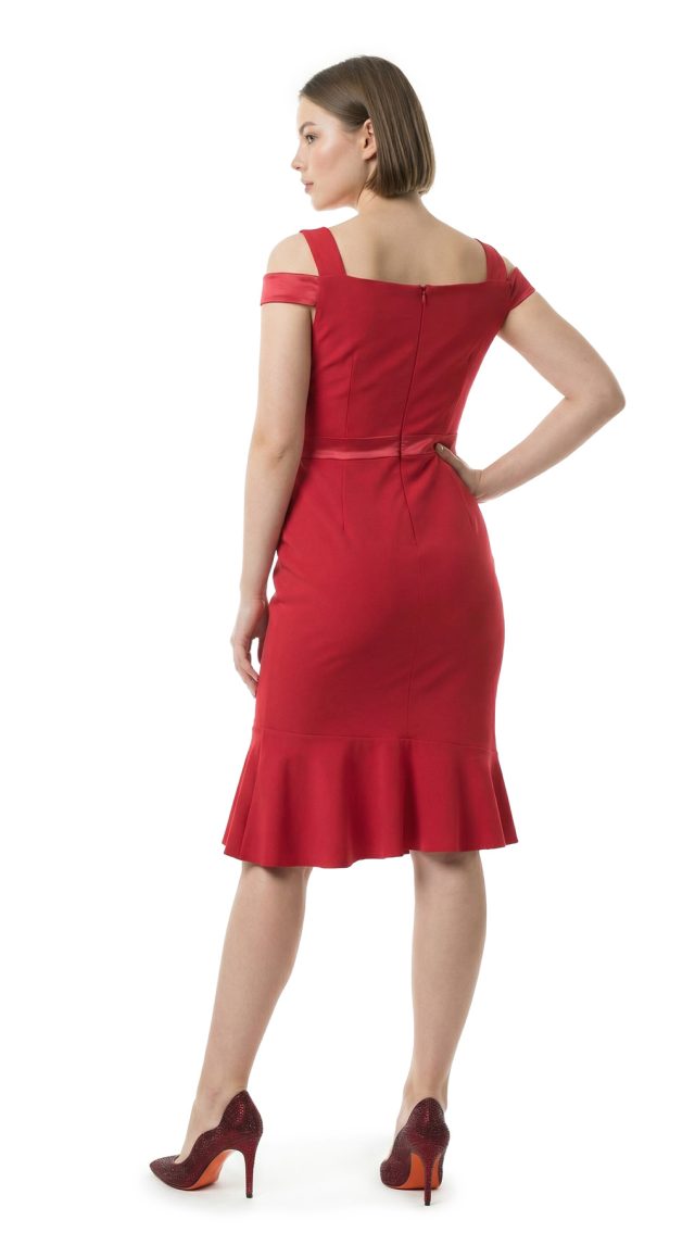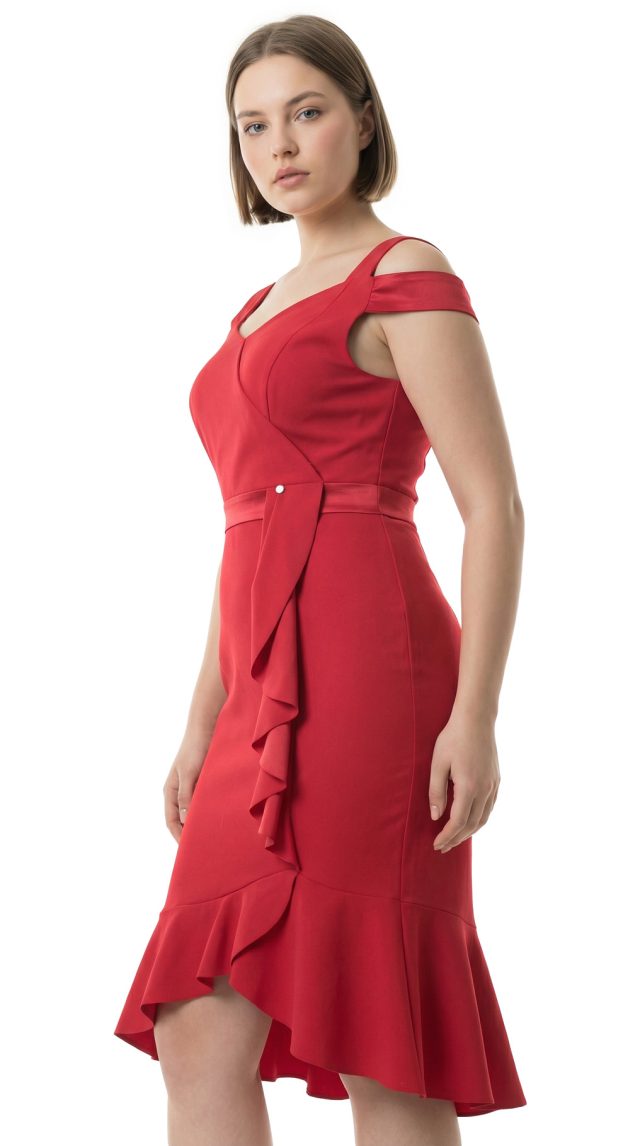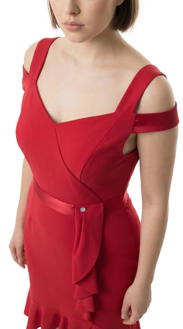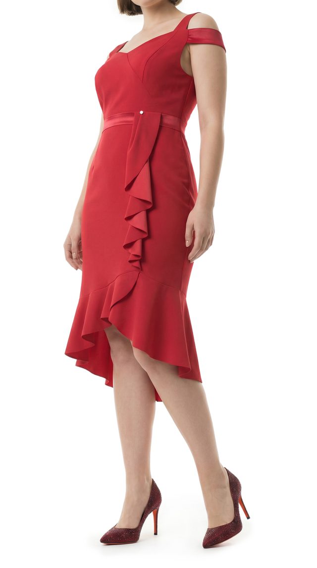 Новое платье итальянского бренда Rinascimento (коллекция Kitana) яркого красного цвета на бретелях. Красивое оформление декольте, зауженная юбочка с воланами. Атласный кант по талии, и атласные плечики. Застежка по спинке на молнию. В составе — 96% п/э, 4% эластан, без подклада: ткань плотная, по фактуре «крепе». Смотрится стильно и женственно. Состояние — новое, с фирменной биркой Kitana.