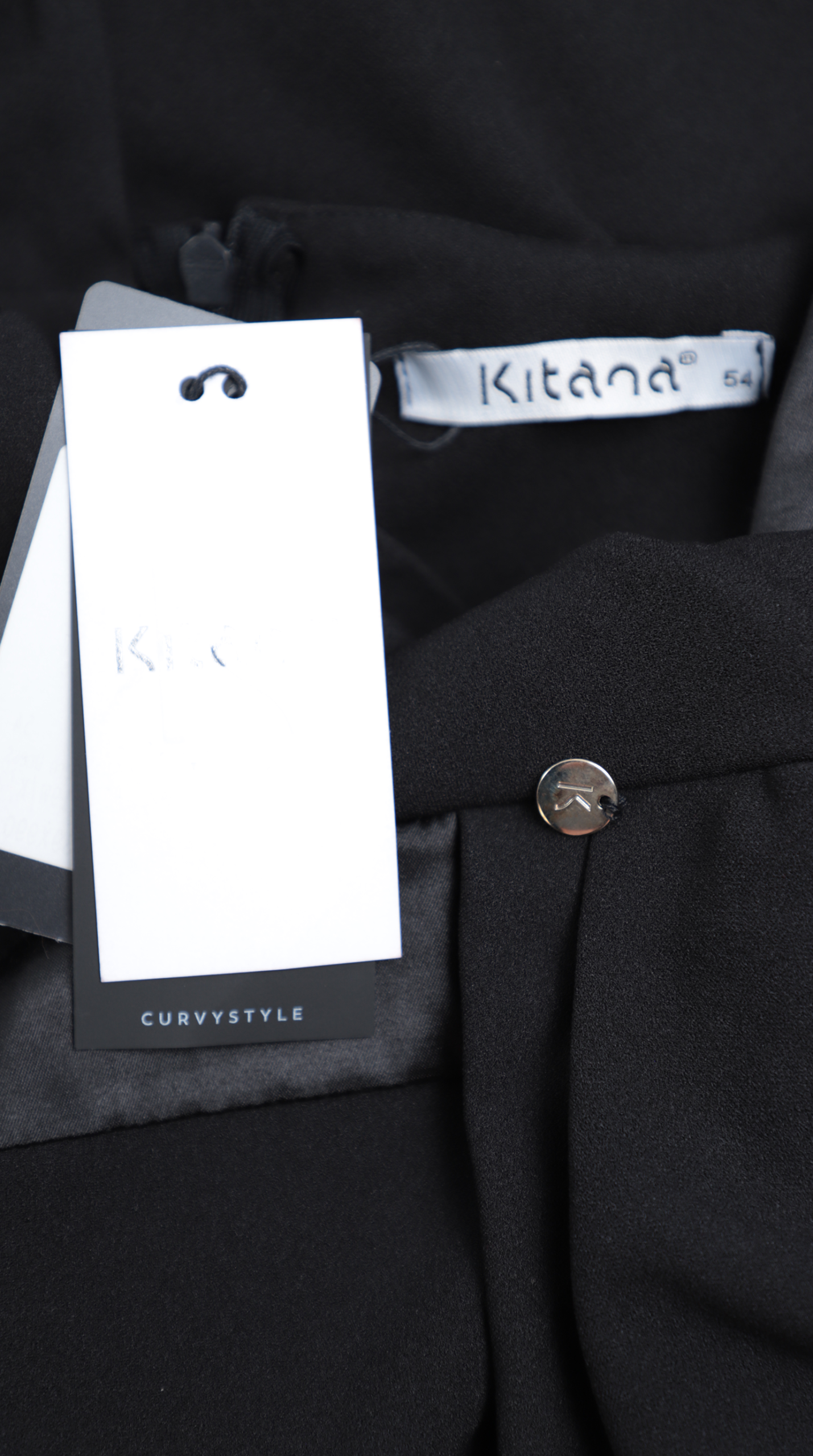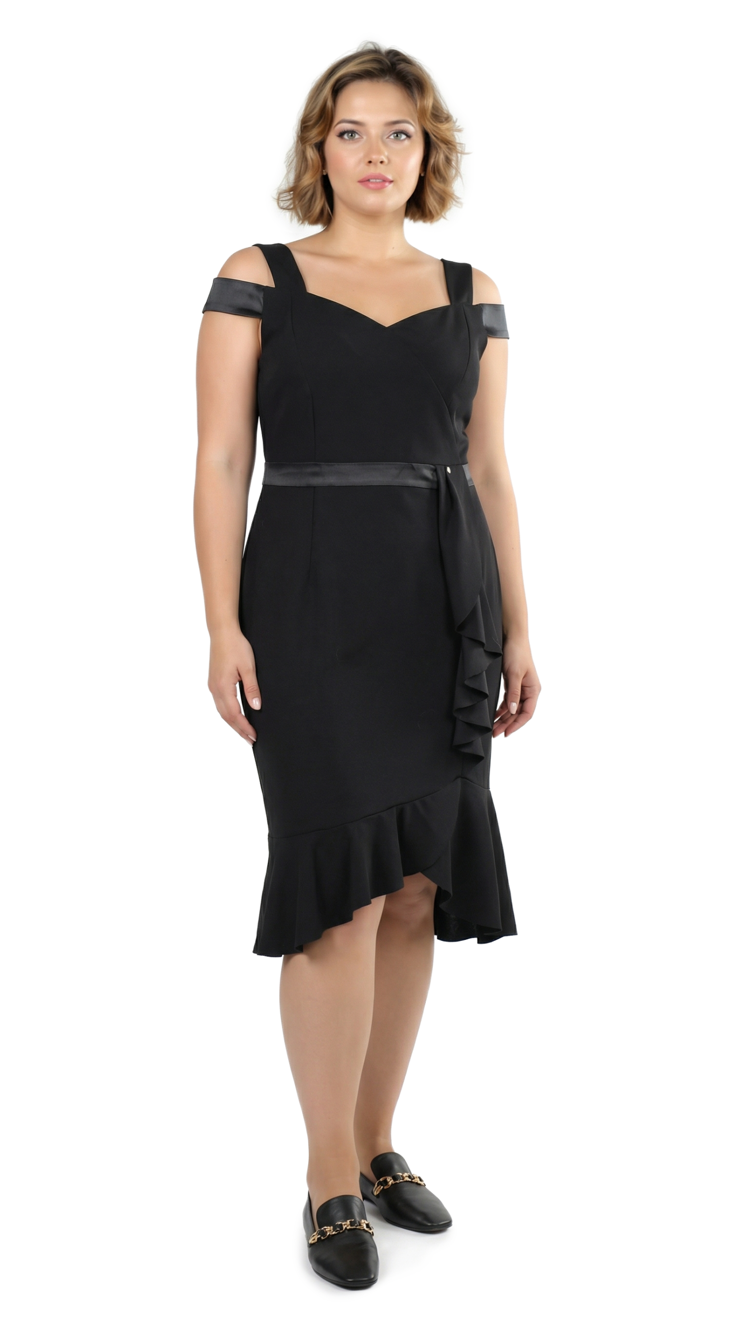 Новое платье итальянского бренда Rinascimento (Kitana) черного цвета на бретелях. Красивое оформление декольте, зауженная юбочка с воланами. Атласный кант по талии, и плечикам. Застежка по спинке на молнию. В составе — 96% п/э, 4% эластан, без подклада: ткань плотная, по фактуре «крепе». Смотрится стильно и женственно. Состояние — новое, с фирменной биркой Kitana.