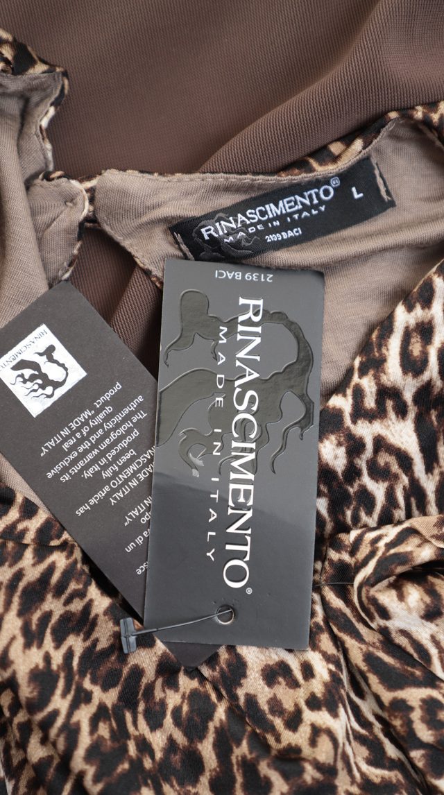 Новое итальянское трикотажное платье Rinascimento коричневого цвета в модном леопардовым принте и женственной оборкой по линии бедер. В составе — 94% п/э, 6% эластан, без подклада: ткань мягкая, шелковистая, хорошо тянется. Состояние — новое, с фирменной биркой магазина Rinascimento.