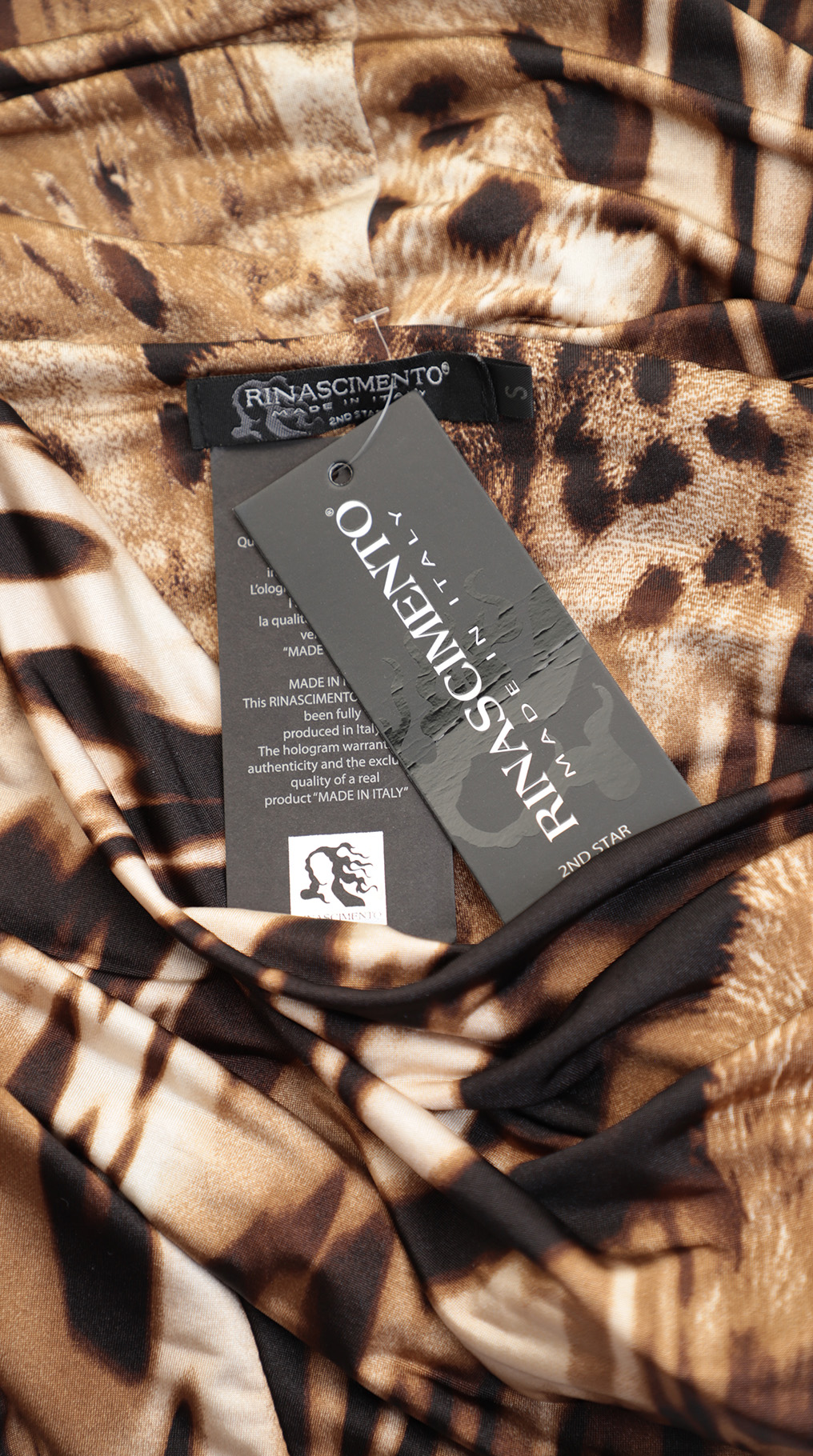 Новое итальянское трикотажное платье Rinascimento коричневого цвета с леопардовым принтом и воротником хомут. Фасон полуприлегающий, женственный. В составе 94% п.э, 6% эластан: ткань мягкая, шелковистая. Состояние — новое, с фирменной биркой магазина Rinascimento.