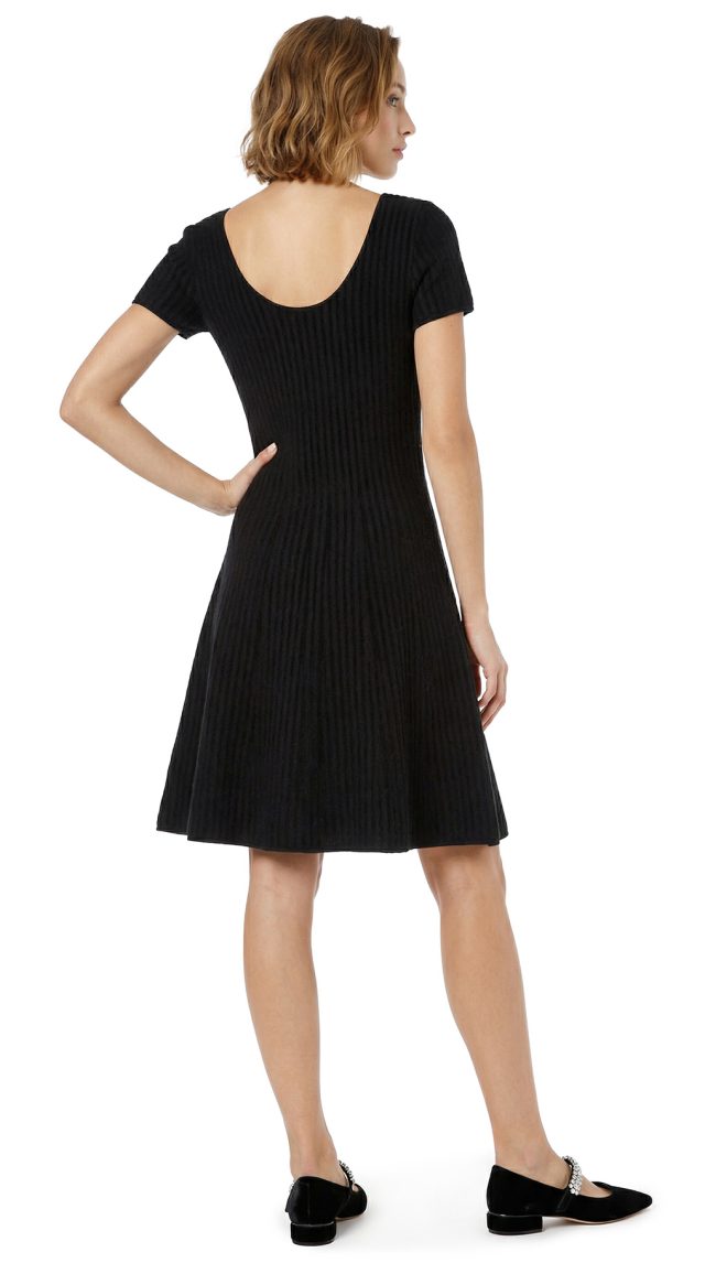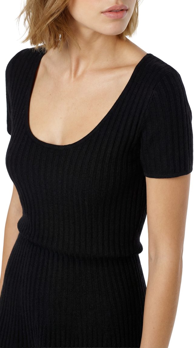 Новое трикотажное платье американского премиального бренда Theory черного цвета. Женственный фасон: приталенный топ и юбочка полу-солнце. Глубокий вырез горловины по переду и спинке. Короткий рукав. Без застежки. В составе: 50% вискоза, 29% полиамид, 14% шерсть, 6% спандекс, 1% полиэстр — ткань экстра качества: мягкая, бархатистая на ощупь, теплая, хорошо тянется. Состояние — новое.