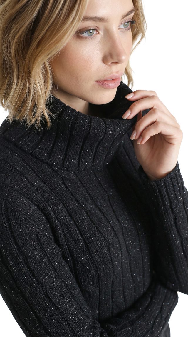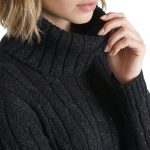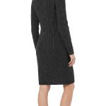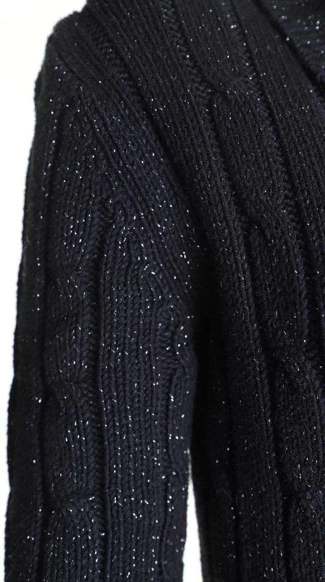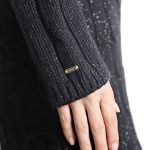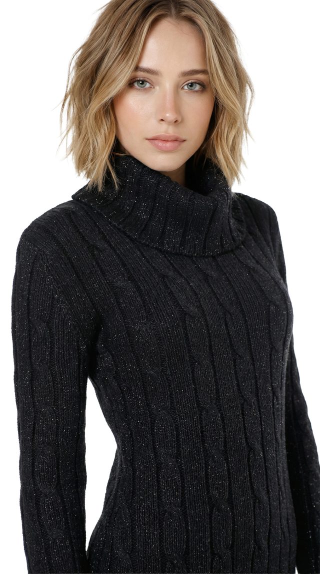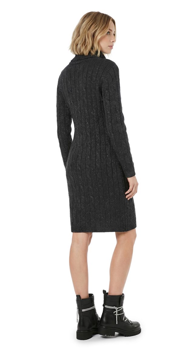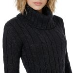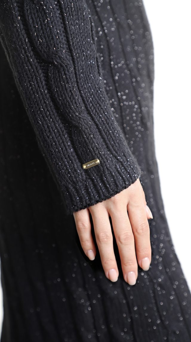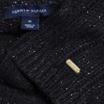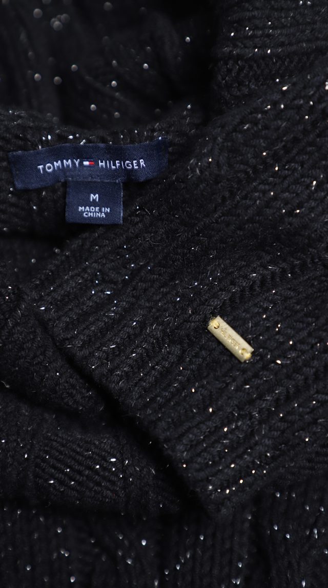 Вязаное трикотажное платье-свитер Tommy Hilfiger черного цвета с серебристыми нитями металлик. Фактурная вязка с чередованием полос и кос. Приталенный фасон с объемным воротником хомут и длинным рукавом с фирменной золотой плашкой. В составе: 57% хлопок, 38% акрил, 5% металлик, без подклада — ткань плотная, теплая, хорошо тянется. Состояние — идеальное, как новое. Оригинал из США.