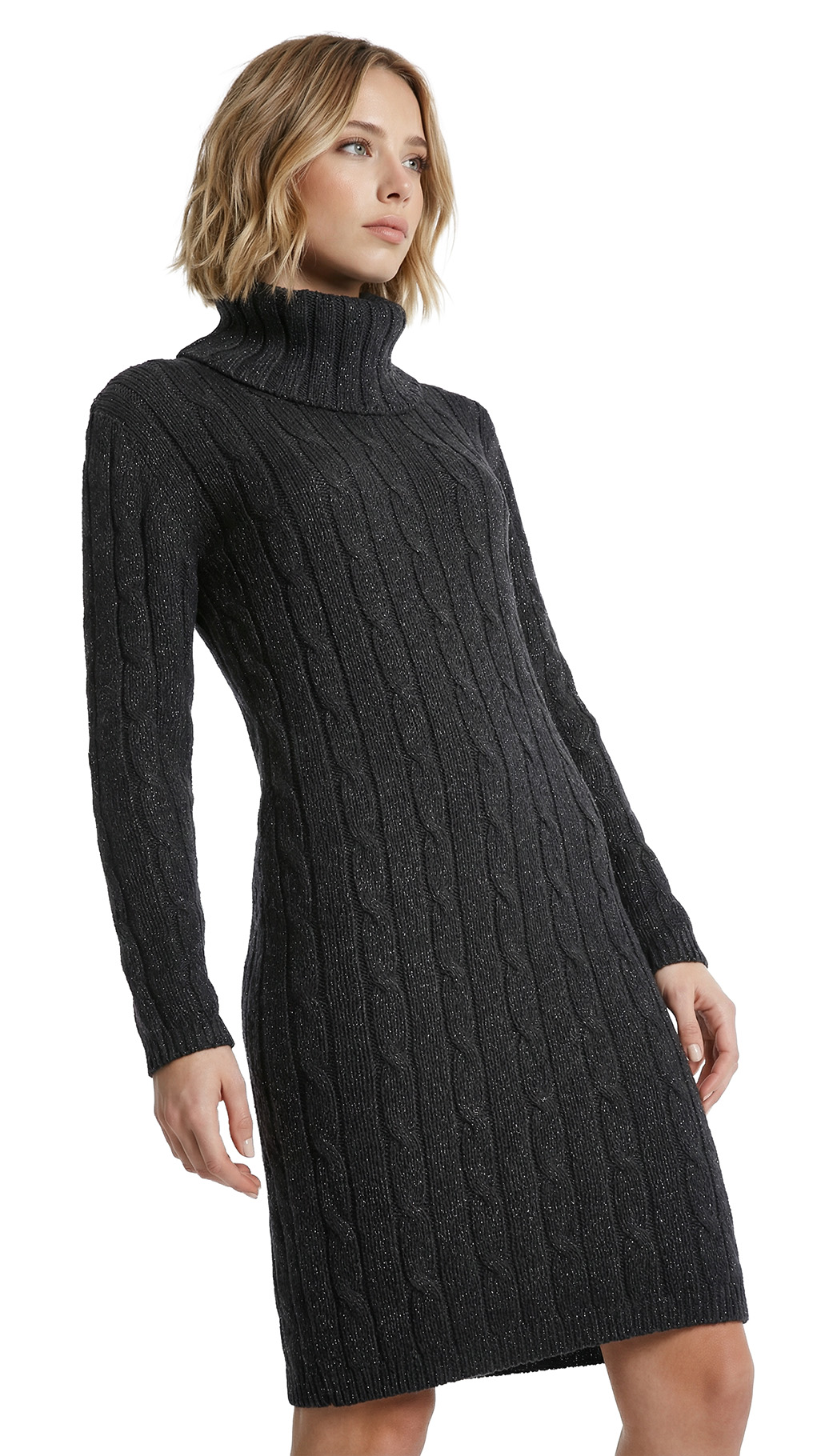 Вязаное трикотажное платье-свитер Tommy Hilfiger черного цвета с серебристыми нитями металлик. Фактурная вязка с чередованием полос и кос. Приталенный фасон с объемным воротником хомут и длинным рукавом с фирменной золотой плашкой. В составе: 57% хлопок, 38% акрил, 5% металлик, без подклада — ткань плотная, теплая, хорошо тянется. Состояние — идеальное, как новое. Оригинал из США.
