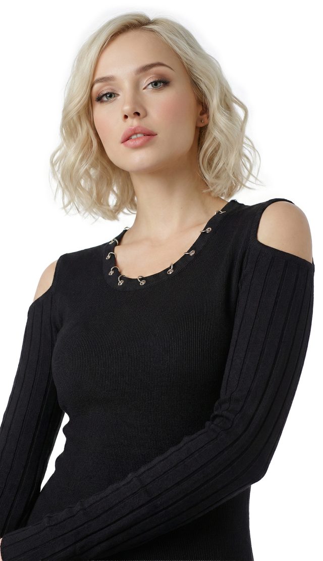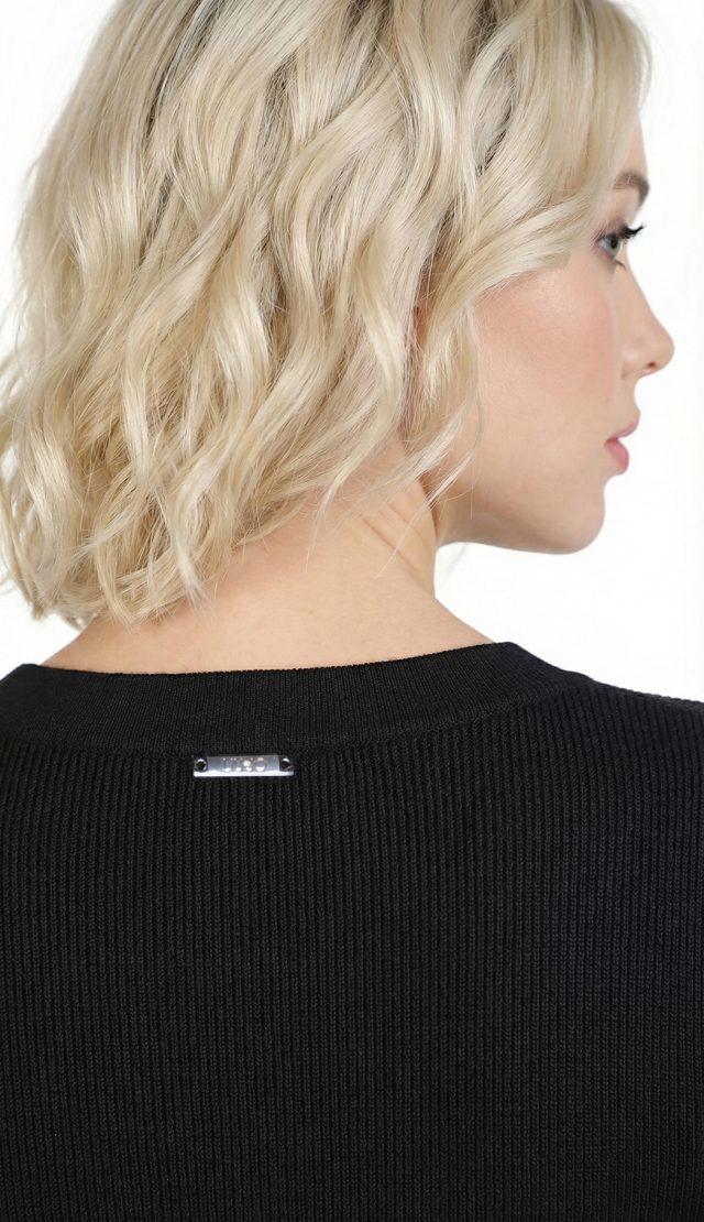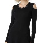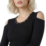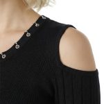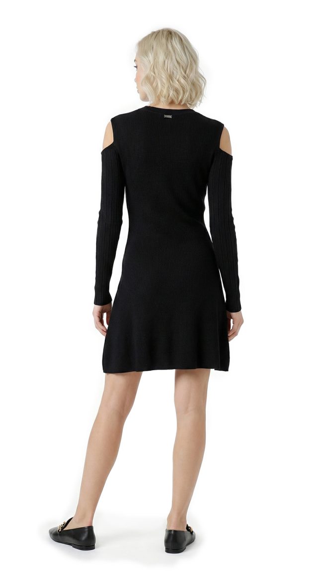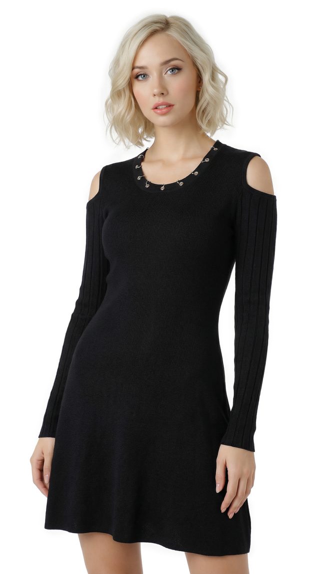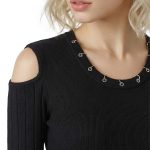 Оригинал с биркой. Новое трикотажное платье итальянского премиального бренда Liu Jo черного цвета. Секси фасон с открытыми плечами и расклешенной юбочкой. Скругленная горловина, декорированная серебряными люверсами. Фирменная серебряная «монетка» Liu Jo по спинке. Стильный элемент гардероба на осень и зиму. В составе: 80% вискоза, 20% полиамид — ткань экстра качества: плотная, мягкая, эластичная, фактурная (в мелкую и крупную «резинку»). Состояние — новое, с оригинальной биркой Liu Jo.