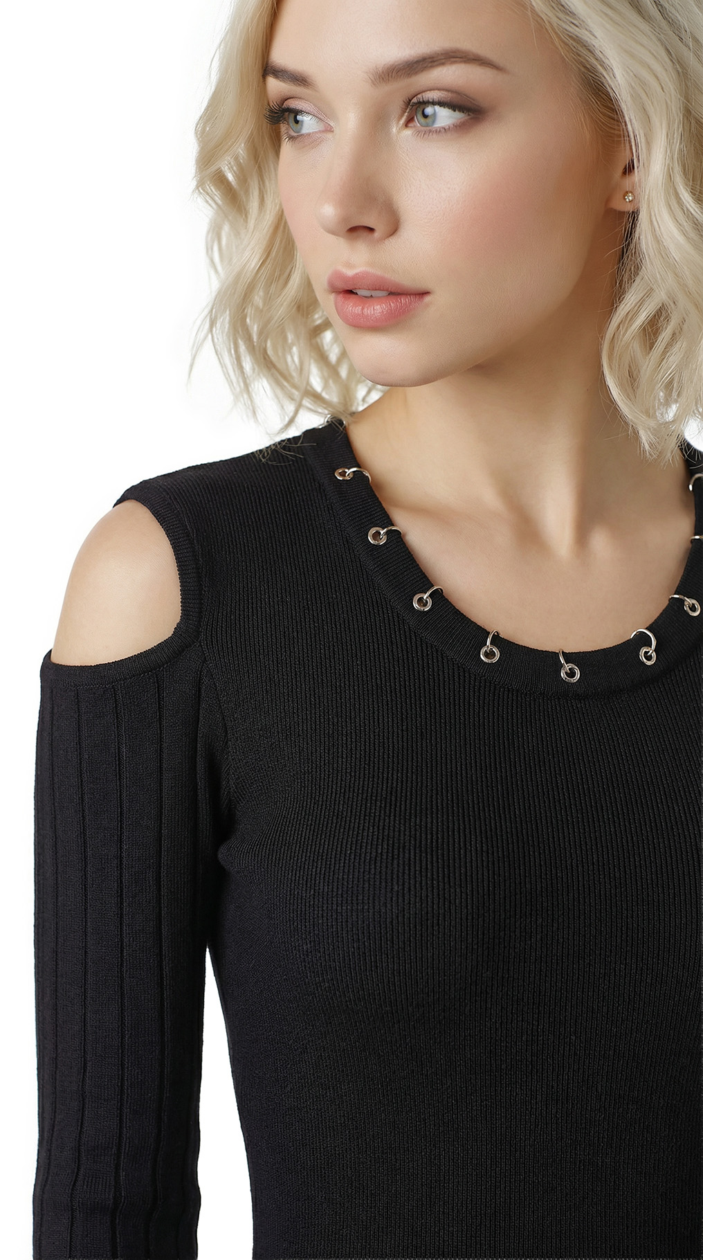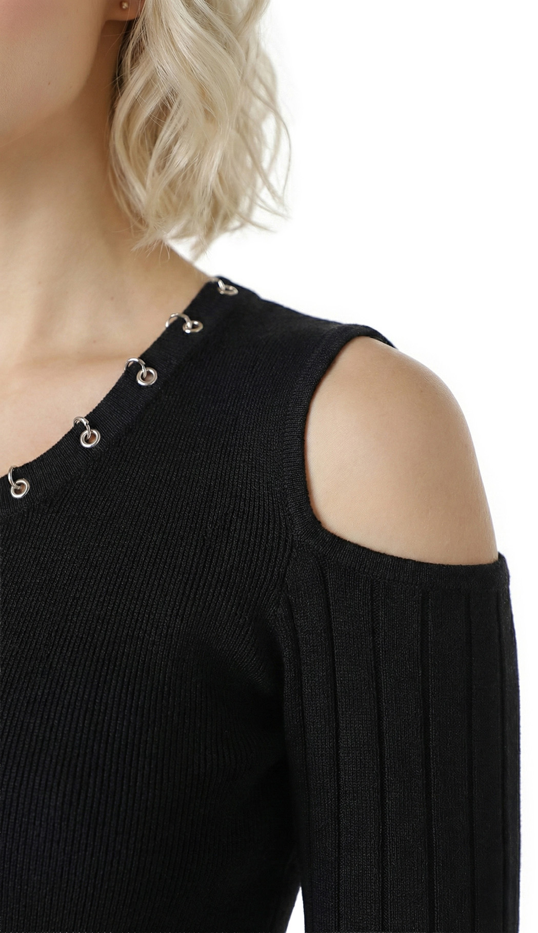 Оригинал с биркой. Новое трикотажное платье итальянского премиального бренда Liu Jo черного цвета. Секси фасон с открытыми плечами и расклешенной юбочкой. Скругленная горловина, декорированная серебряными люверсами. Фирменная серебряная «монетка» Liu Jo по спинке. Стильный элемент гардероба на осень и зиму. В составе: 80% вискоза, 20% полиамид — ткань экстра качества: плотная, мягкая, эластичная, фактурная (в мелкую и крупную «резинку»). Состояние — новое, с оригинальной биркой Liu Jo.