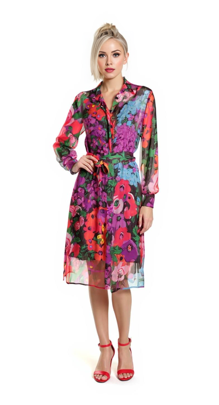 Оригинал с биркой. Новое платье итальянского бренда Twin Set с ярким цветочным принтом в зеленых, голубых, оранжевых и фиолетовых тонах. Прямой фасон с длинным рукавом и подвязкой на пояс. Кармашки в боковых швах. Вырезы по бокам для комфорта в движении. Застежка на брендированные пуговки за потайной планкой. Фирменная плашка «сердечко» по спинке. В составе: 100% вискоза, на подкладе из п.э — ткань платья легкая, полупрозрачная, по фактуре шифоновая. Подклад — мягкий, приятный к телу, на регулируемых бретелях. Пошив — Италия. Состояние — новое, с фирменной биркой Twin Set.
