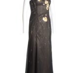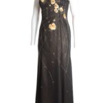 Вечернее платье дизайнерского бренда Carducci черного цвета с яркой цветочной аппликацией и вышивкой золотым бисером по воздушному гипюру на атласном золотом подкладе. Женственный приталенный удлиненный фасон без рукавов с расклешенной юбочкой. Чашечки из поролона на груди поддерживают и выгодно акцентируют бюст. Застежка по спинке на молнию. В составе — п.э. Состояние — идеальное, как новое. Эксклюзив в России.