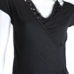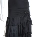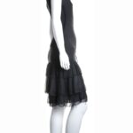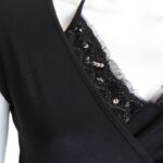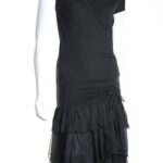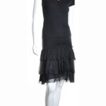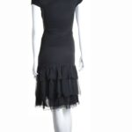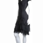Женственное платье итальянского бренда (бирка срезана) черного цвета с коротким приспущенным рукавом. Интересный фасон с воланами, драпировкой на кантик по переду и V-образной горловиной на запах с внутренним ками на бретелях, декорированным кружевом и пайетками. Без застежки. В составе: 95% вискоза, 5% эластан, подклад воланов — 100% натуральный шелк: ткань легкая, очень мягкая, хорошо драпируется. Состояние — идеальное, как новое.