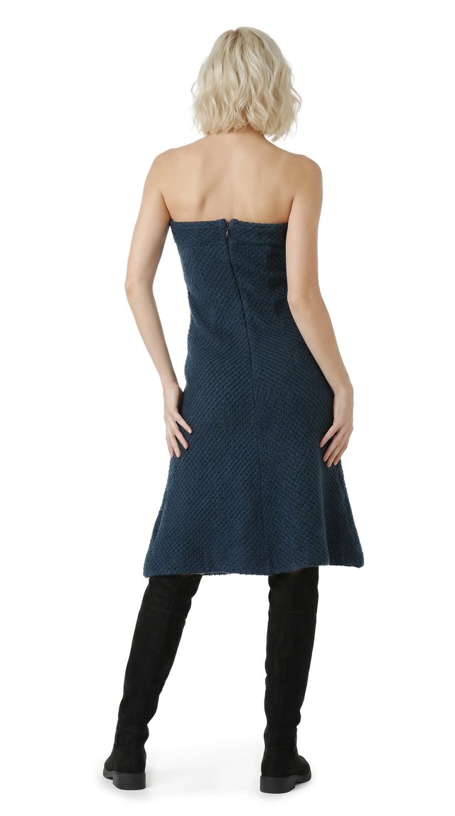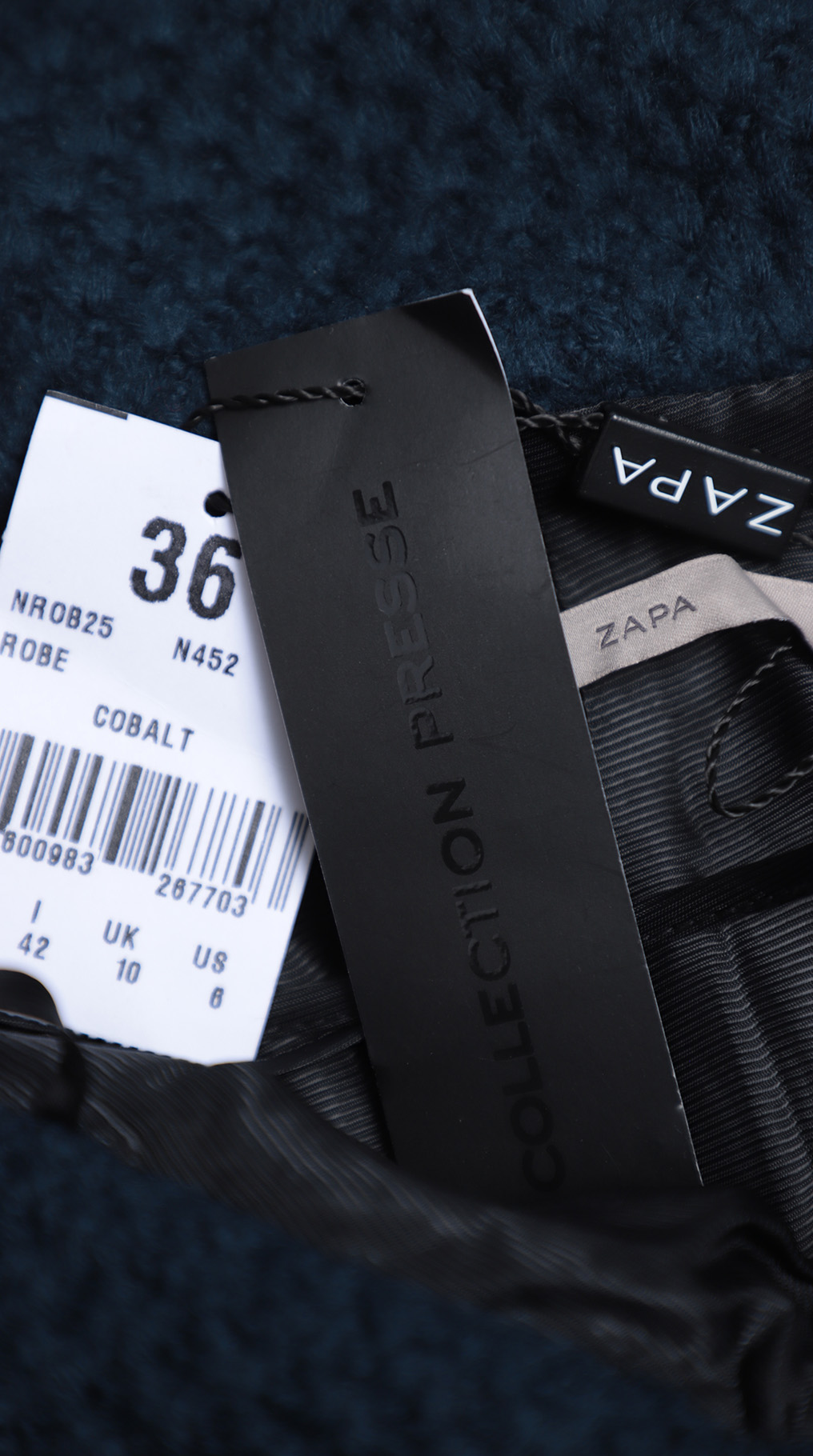 Новое шерстяное платье французского бренда класса «люкс» Zapa Paris темно-синего (кобальтового) цвета. Элегантный приталенный фасон с юбочкой колокольчик. Застежка по спинке на молнию и потайные клипсы. Премиальное качество пошива и материалов. В составе 100% шерсть экстра качества (virgin wool), на подкладе из 50% натурального ацетата и 50% вискозы — ткань плотная, по фактуре буклированная. Состояние — новое, с фирменной биркой Zapa.