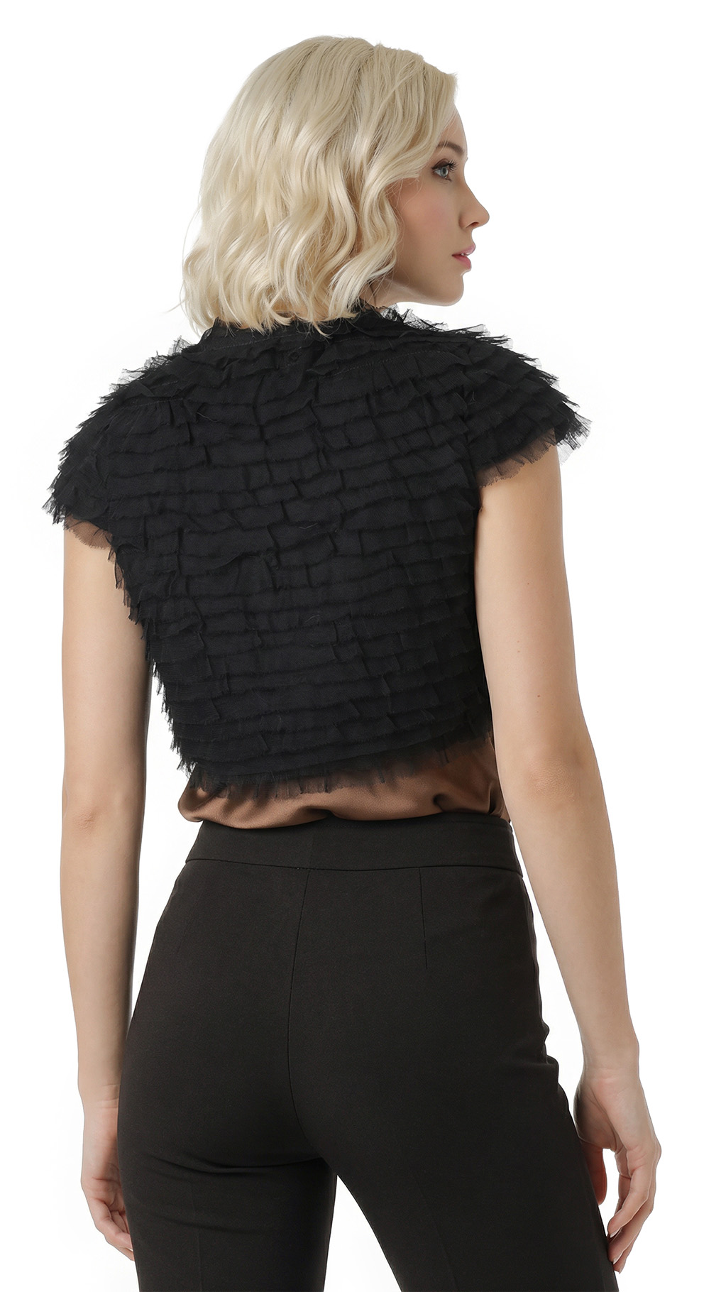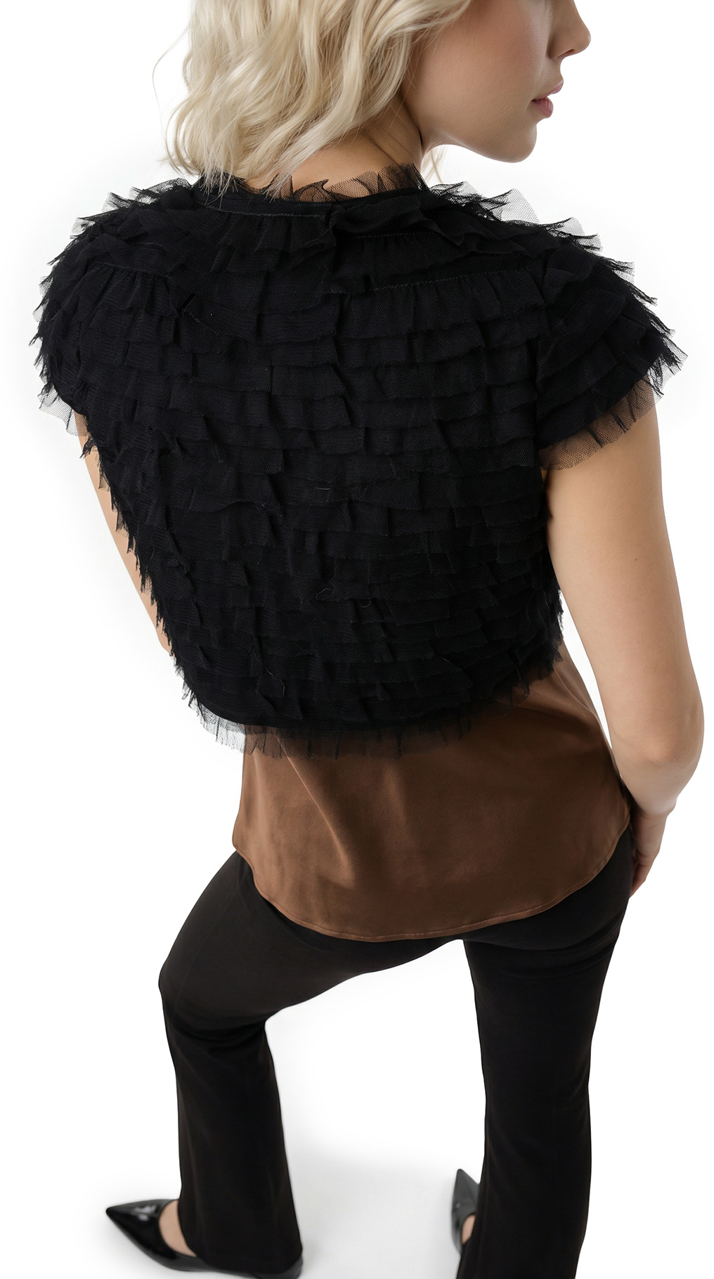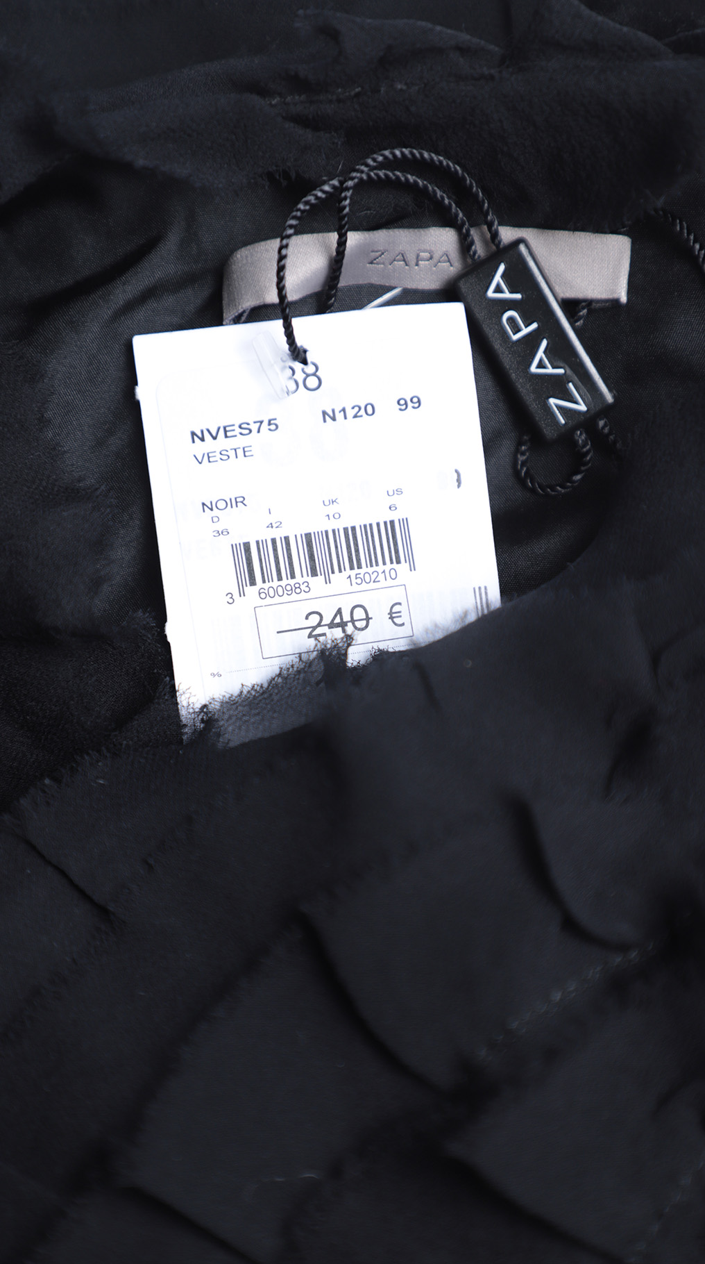 Новый дизайнерский кардиган-болеро французского бренда класса «люкс» Zapa Paris черного цвета из натурального шелка. Укороченный приталенный фасон со скругленной линией низа и подвязкой на кантик. Элегантное, стильное дополнение к вечернему платью с коротким рукавом или на бретелях. Премиальное качество пошива и материалов. В составе: 100% натуральный шифон шелковый, на подкладе из натурального шелка — ткань экстра: легкая, воздушная. Состояние — новое, с фирменной биркой Zapa. Цена на бирке — 240 евро (!).