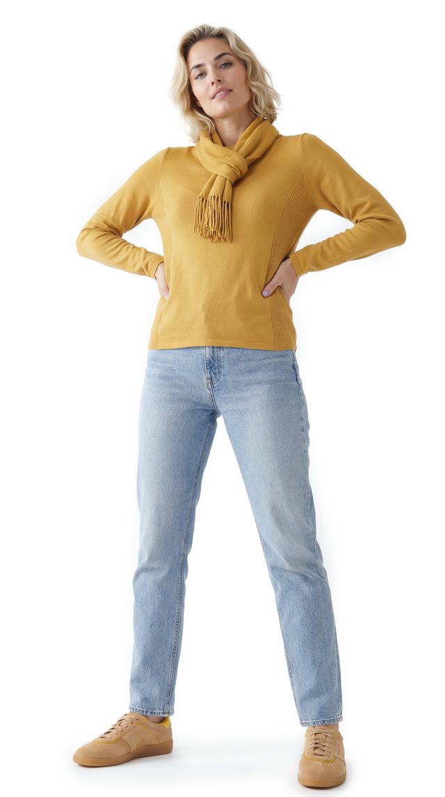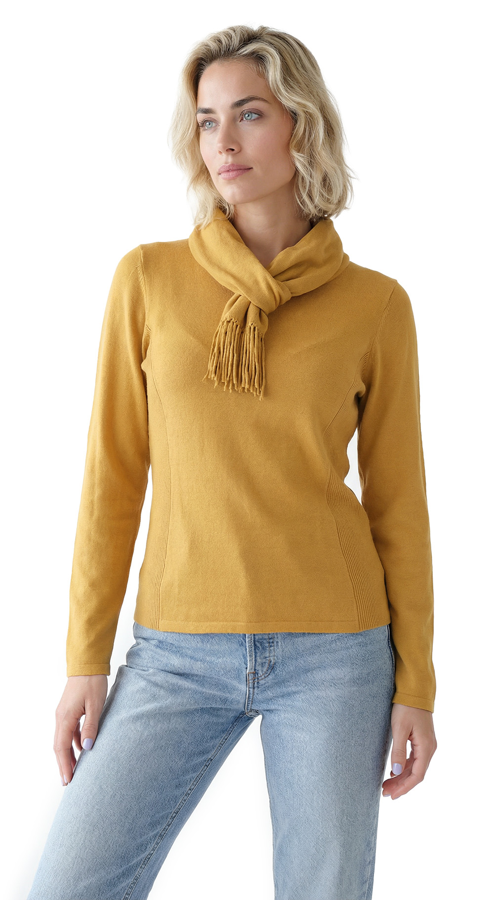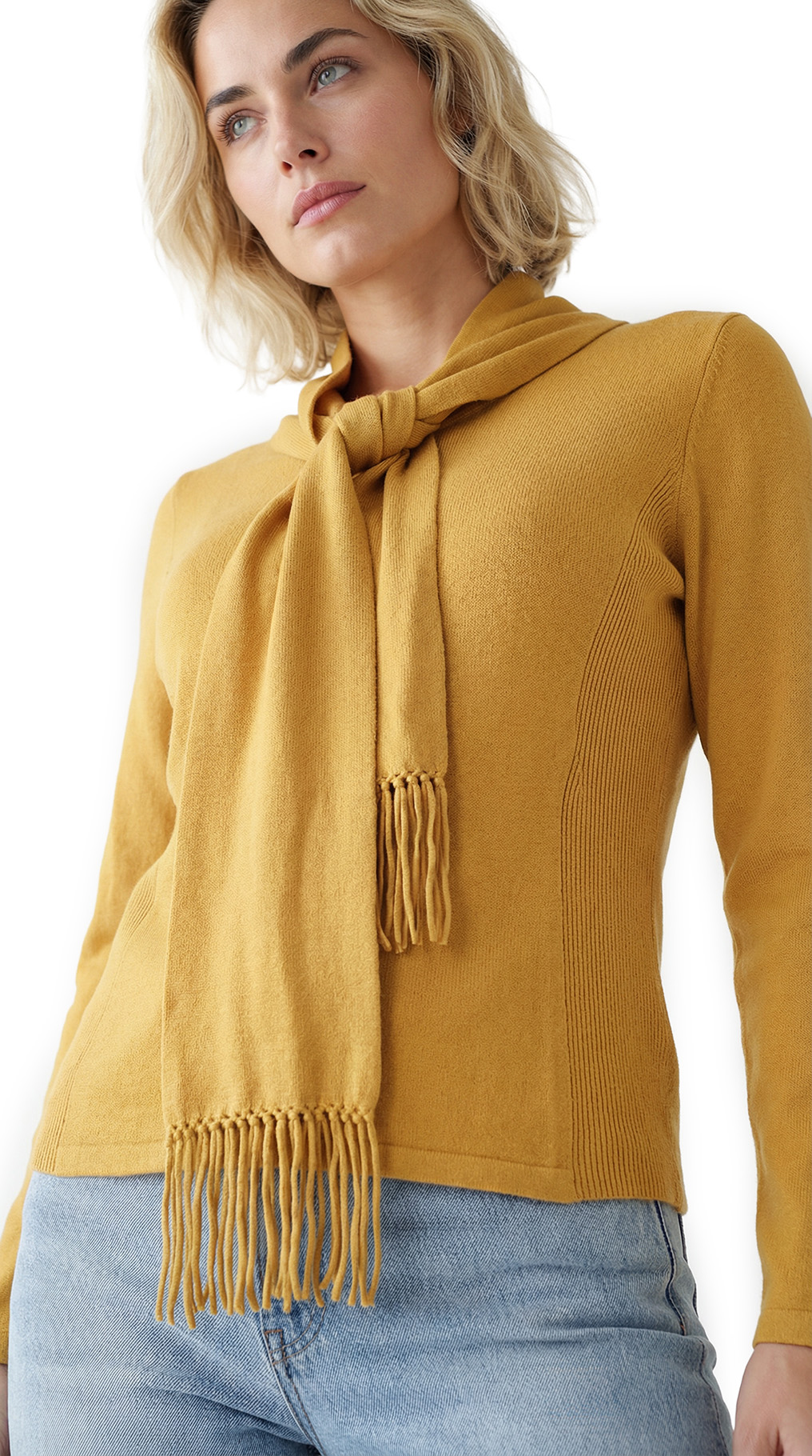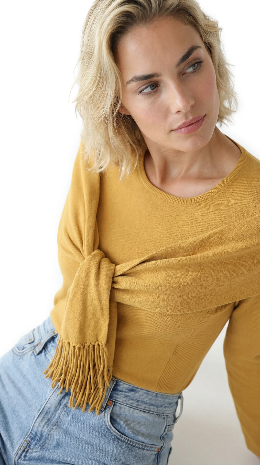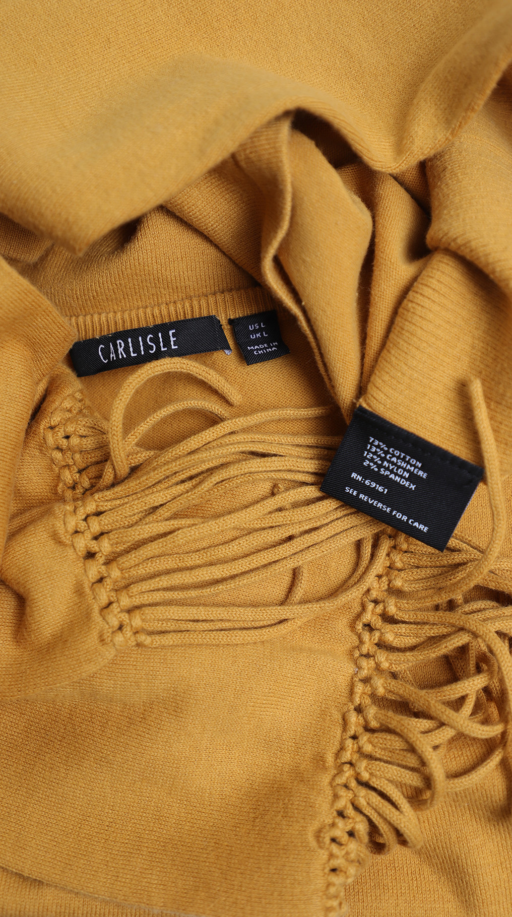 Джемпер дизайнерского американского премиального бренда Carlisle горчичного цвета, декорированный шарфом с бахромой (в комплекте). Приталенный фасон с ребристыми вставками по бокам и скругленной горловиной. Стильное дополнение к брючкам или юбке. В составе: 73% хлопок, 13% кашемир, 12% нейлон, 2% спандекс — ткань средней плотности, мягкая, эластичная. Состояние — отличное.