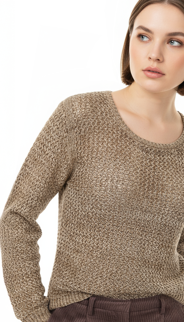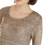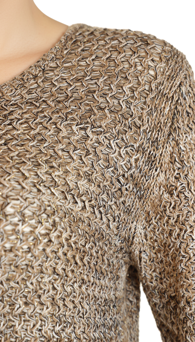 Новый джемпер французского бренда Caroll бежевого цвета ажурной вязки с золотистыми металлизированными нитями. Женственный фасон с длинным рукавом и открытым полу-запахом по спинке. В составе: 97% хлопок, 3% металлизированные нити: ткань плотная, мягкая, приятная в носке. Состояние — новое, с оригинальной биркой магазина Caroll.