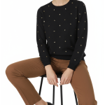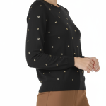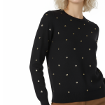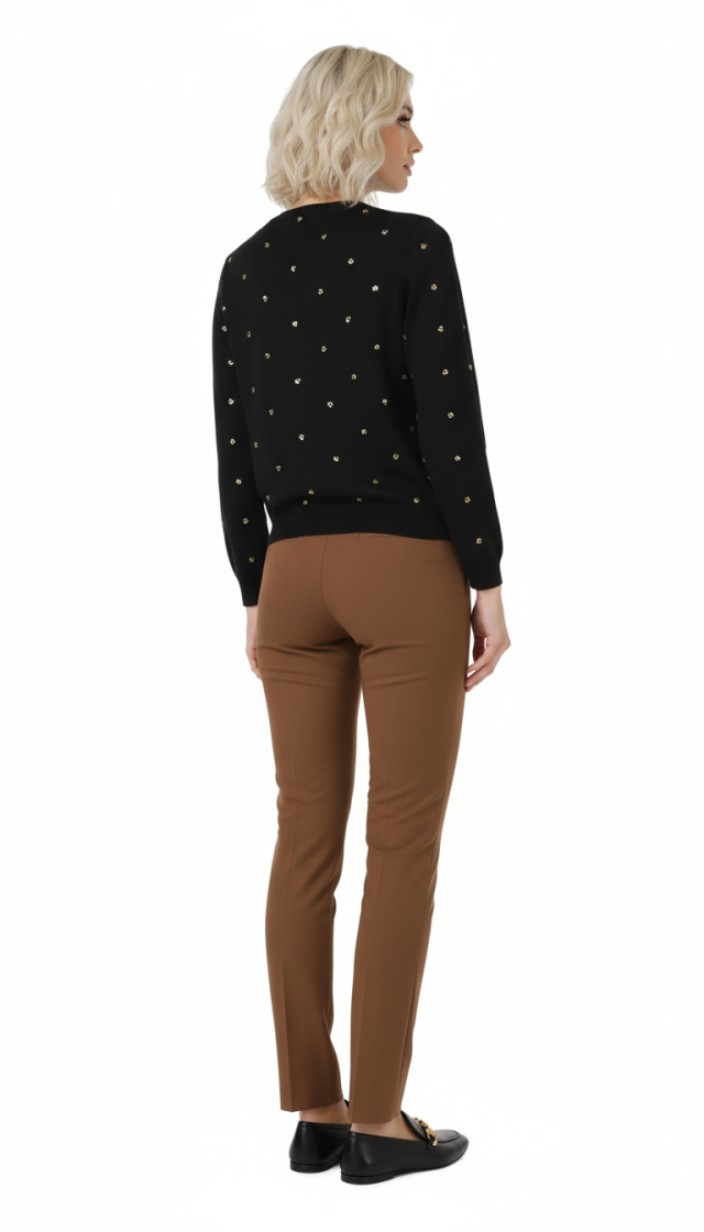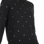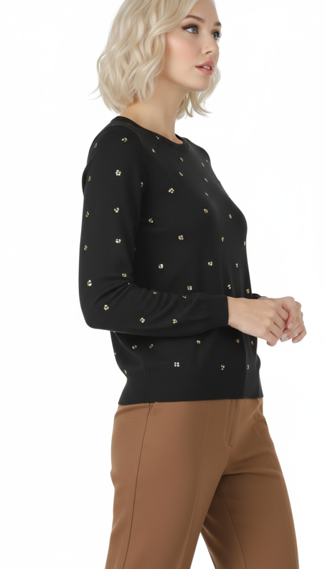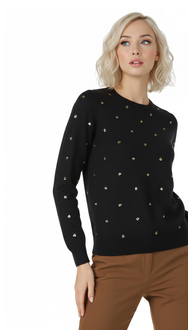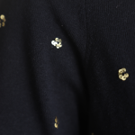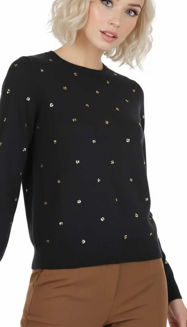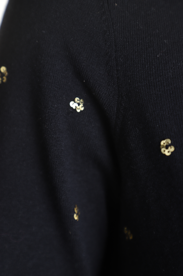 Дизайнерский джемпер американского премиального бренда Catherine Malandrino черного цвета, декорированный золотыми пайетками. Укороченный фасон с рукавом 3/4 и скругленной горловиной. Резинка по талии и манжетам рукавов. В составе: 51% натуральный шелк, 25% вискоза, 24% нейлон — ткань экстра качества: нежная, мягкая, бархатистая. Состояние — идеальное, как новое.
