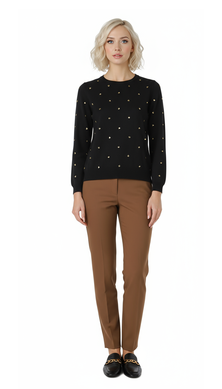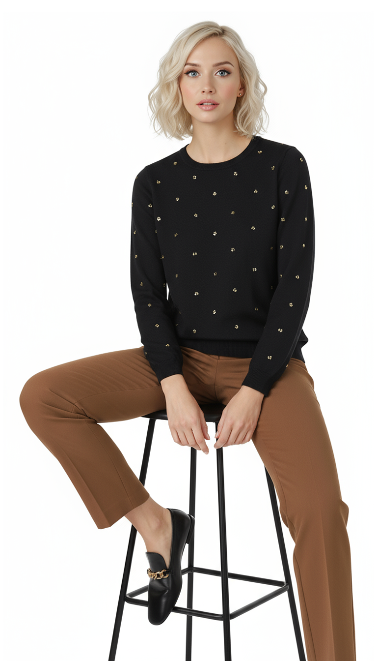 Дизайнерский джемпер американского премиального бренда Catherine Malandrino черного цвета, декорированный золотыми пайетками. Укороченный фасон с рукавом 3/4 и скругленной горловиной. Резинка по талии и манжетам рукавов. В составе: 51% натуральный шелк, 25% вискоза, 24% нейлон — ткань экстра качества: нежная, мягкая, бархатистая. Состояние — идеальное, как новое.