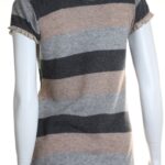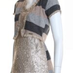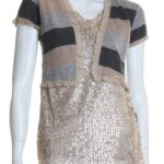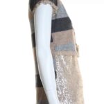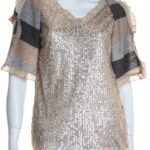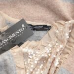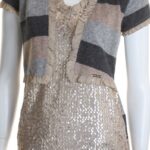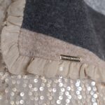 Новый яркий джемпер/кардиган («два-в-одном») итальянского бренда Rinascimento в серо-бежевых тонах, декорированный золотыми пайетками и окантованный рюшами. Короткий рукав. Фирменная золотая плашка Rinascimento. В составе: 70% шерсть, 30% нейлон — ткань легкая, эффектная, переливающаяся при свете. Состояние — новое, с фирменной биркой Rinascimento.